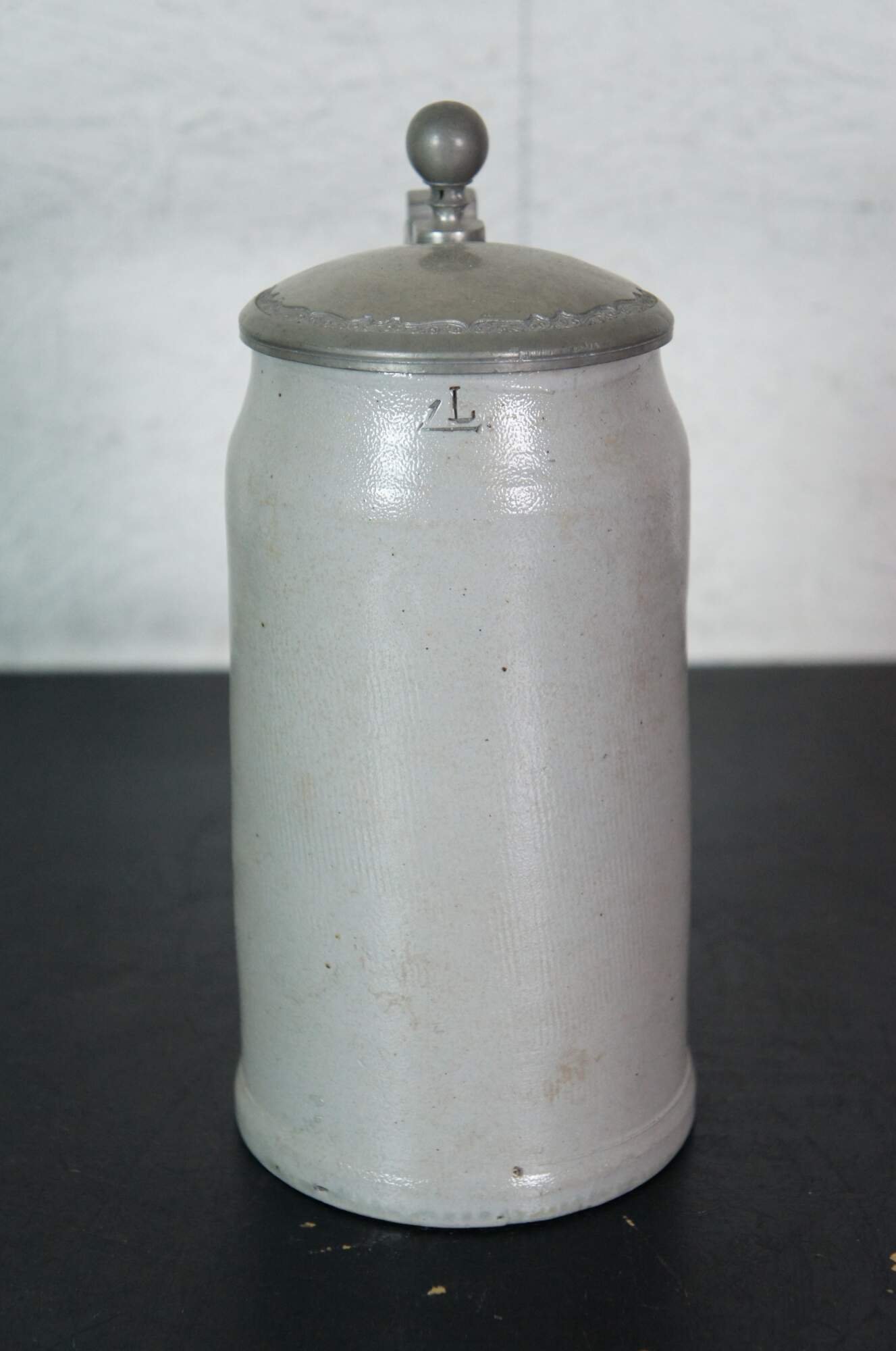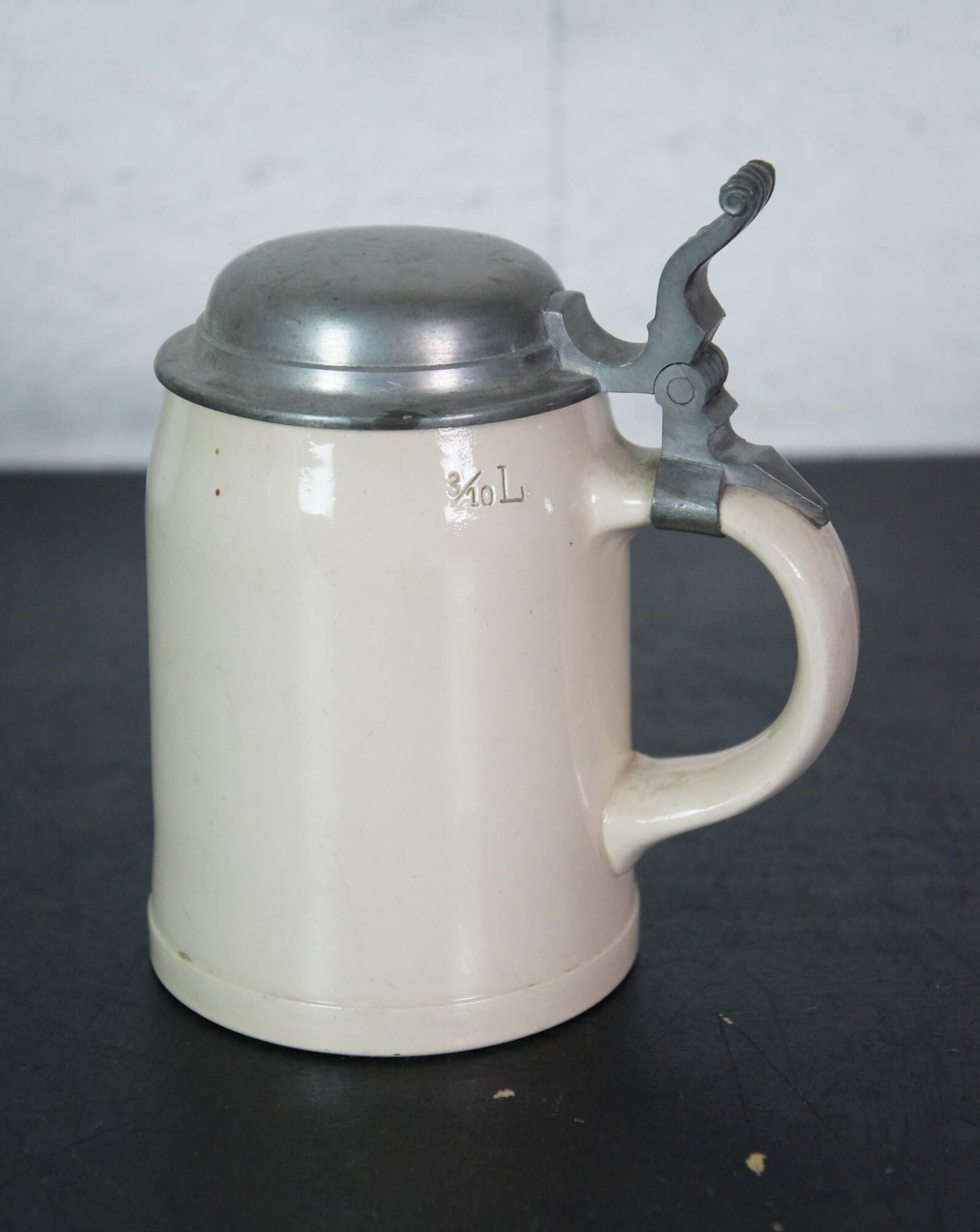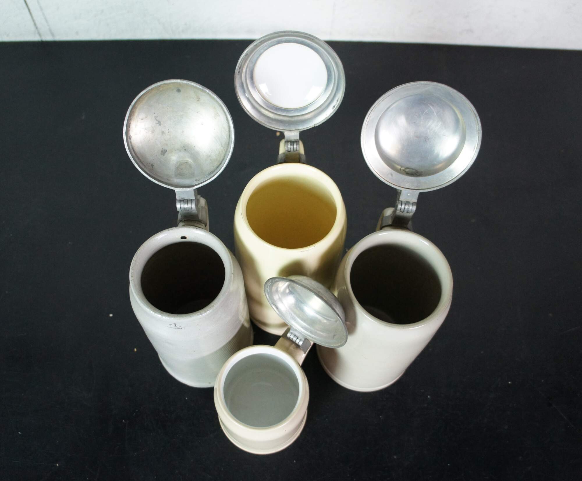 Set of four 20th century plain German stoneware / ceramic / salt glaze / stoneware Mettlach beer steins with tin flip top lids. Smallest capacity, 3/10 Liter. All others capacity, 1 Liter. One by Villeroy & Boch - Made in Germany - 1909. One features a painted porcelain inlay on lid.