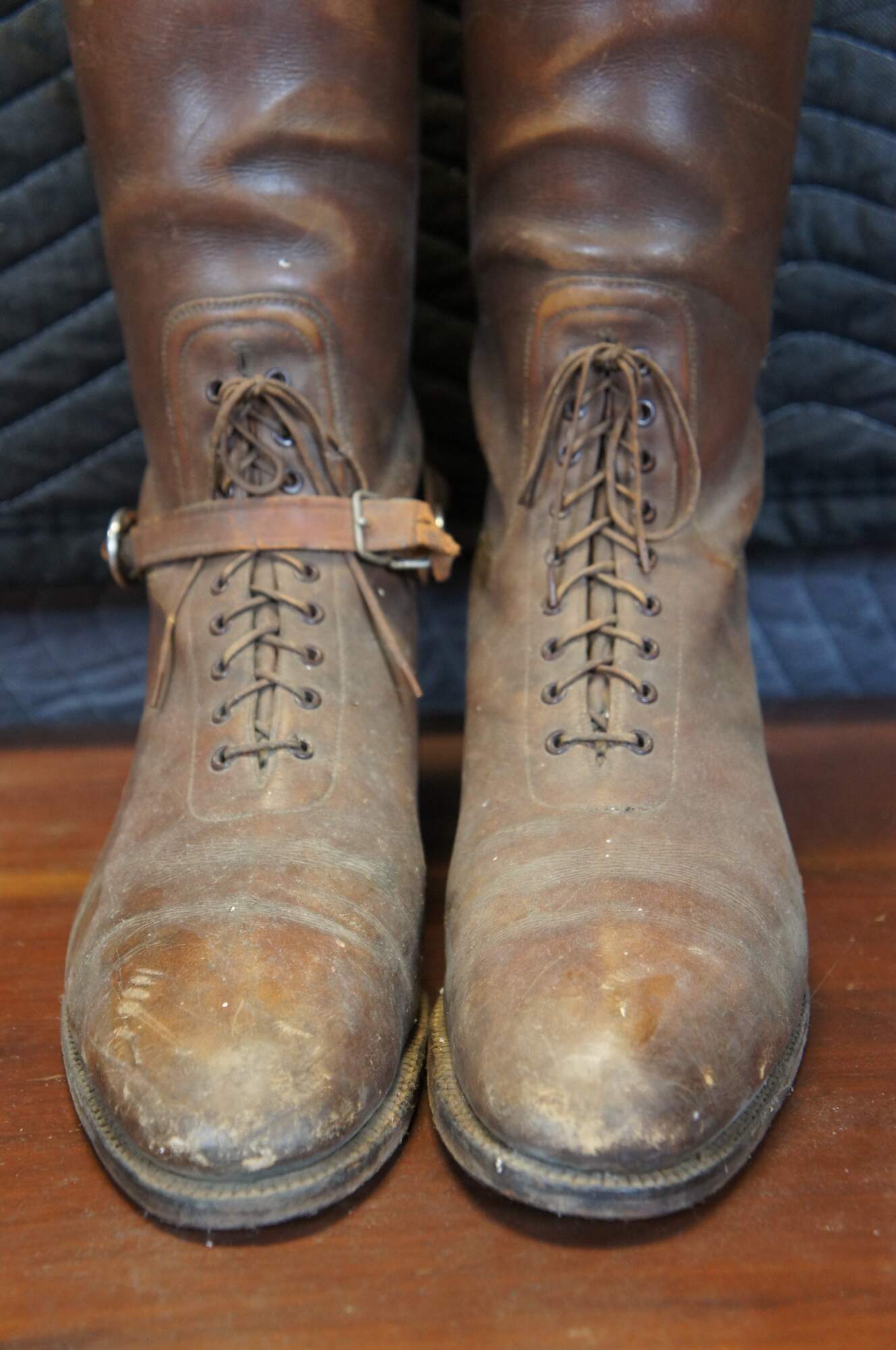 Circa early 20th century / World War I brown leather military riding / cavalry / millitary / sport boots. Pull on style with laces at the ankle and calf. On leather strap for spurs extant. Includes two part hardwood boot forms / stretchers.