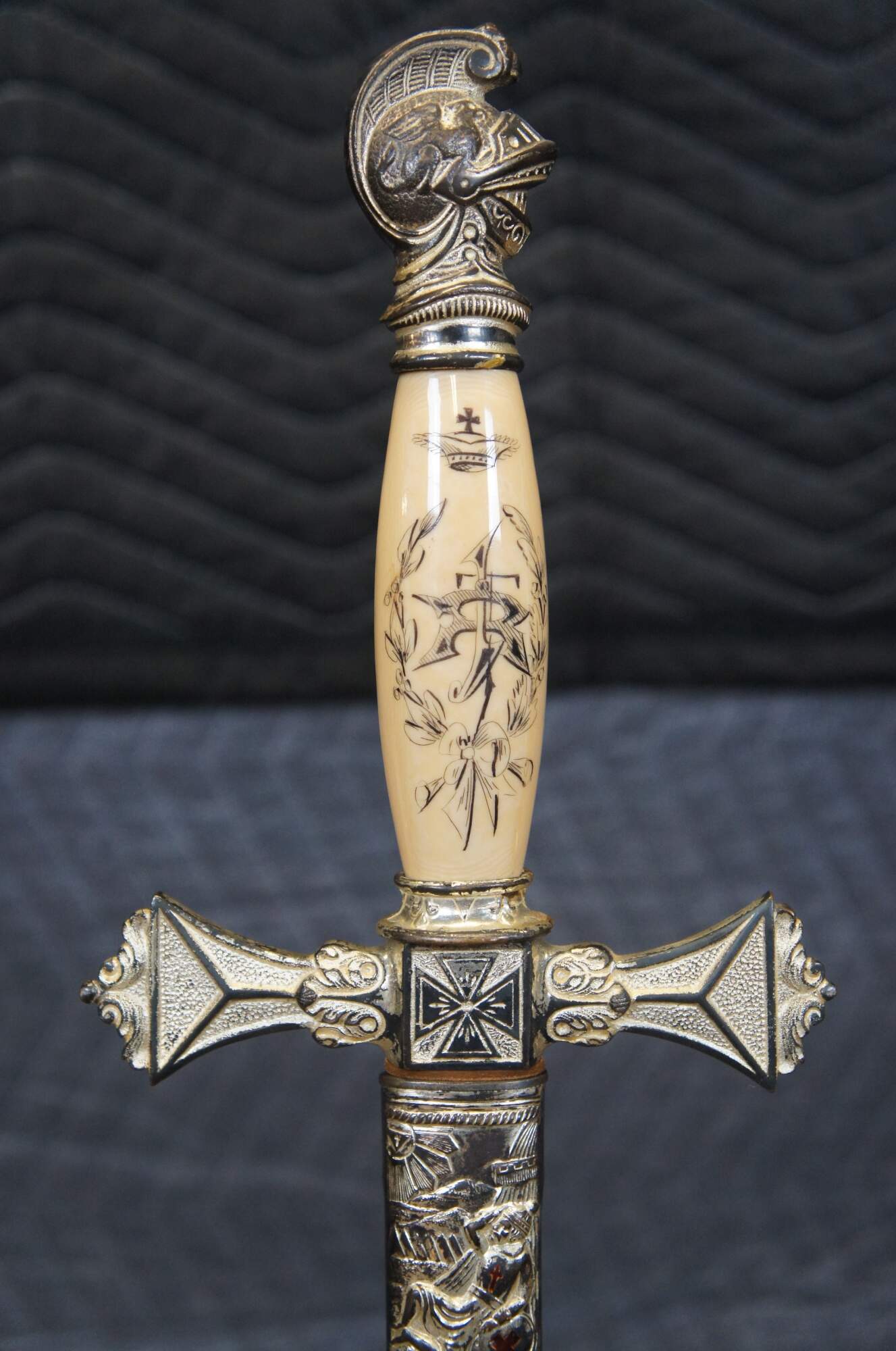 Late 19th-early 20th century (Circa 1882-1925) Masonic ceremonial sword and scabbard manufactured by The M.C. Lilley & Co. Silver tone metal with faux ivory handle, with painted details. Scabbard and handle are molded with knights and religious iconography. Both sides of the blade are etched also with knights, armies, religious imagery and the name James Turner Reese, thrown into relief with lightly brushed gilding. Includes brown leather case.