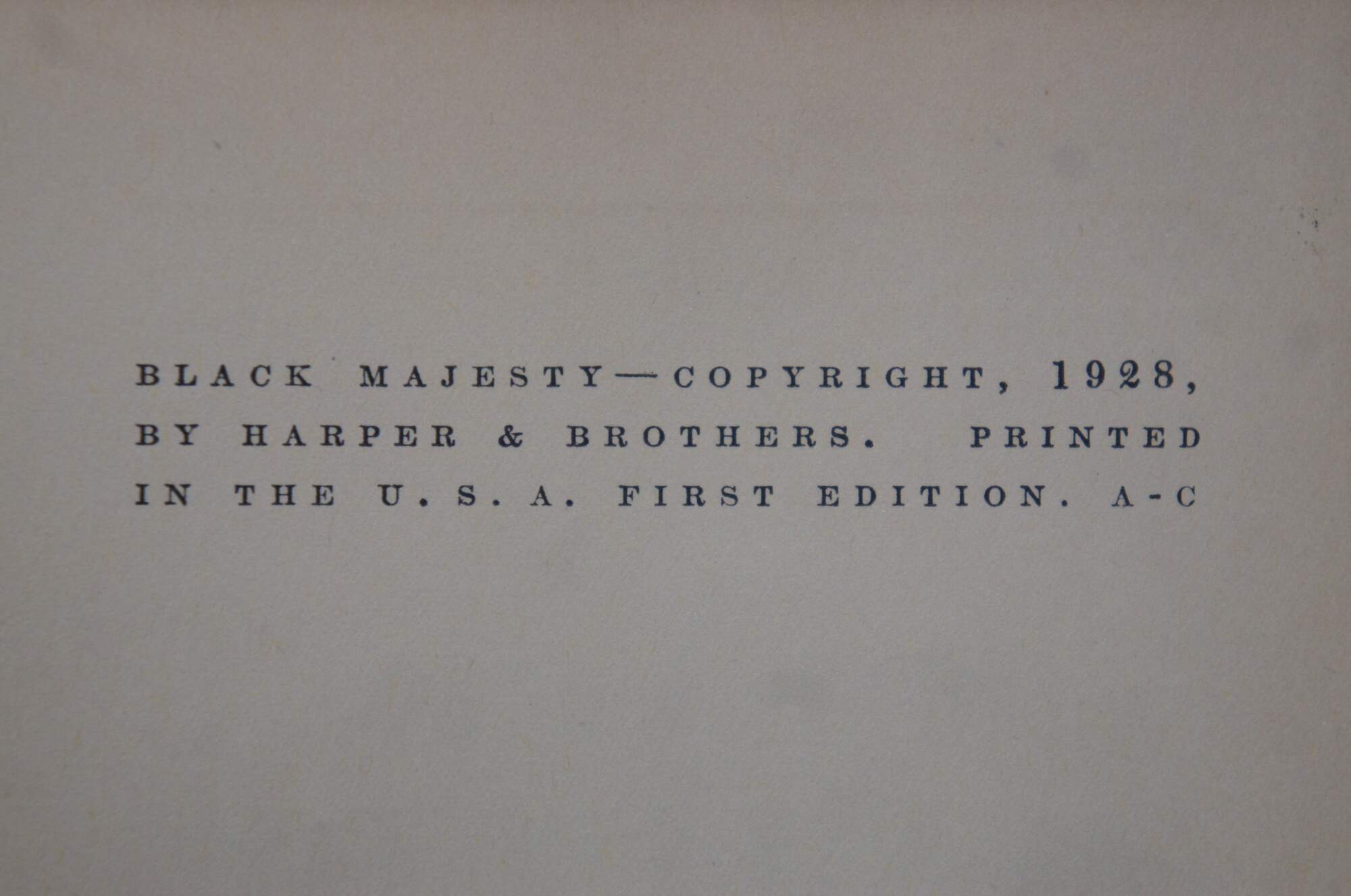 Black Majesty" by John W. Vandercook - Illustrated with Drawings by Mahlon Blaine - Published by the Literary Guild of America 1928 - Copyright 1928 by Harper & Brothers - Printed in the USA, First Edition A-C. Printed paper hard back / hard cover with cloth binding on the spine; no jacket.