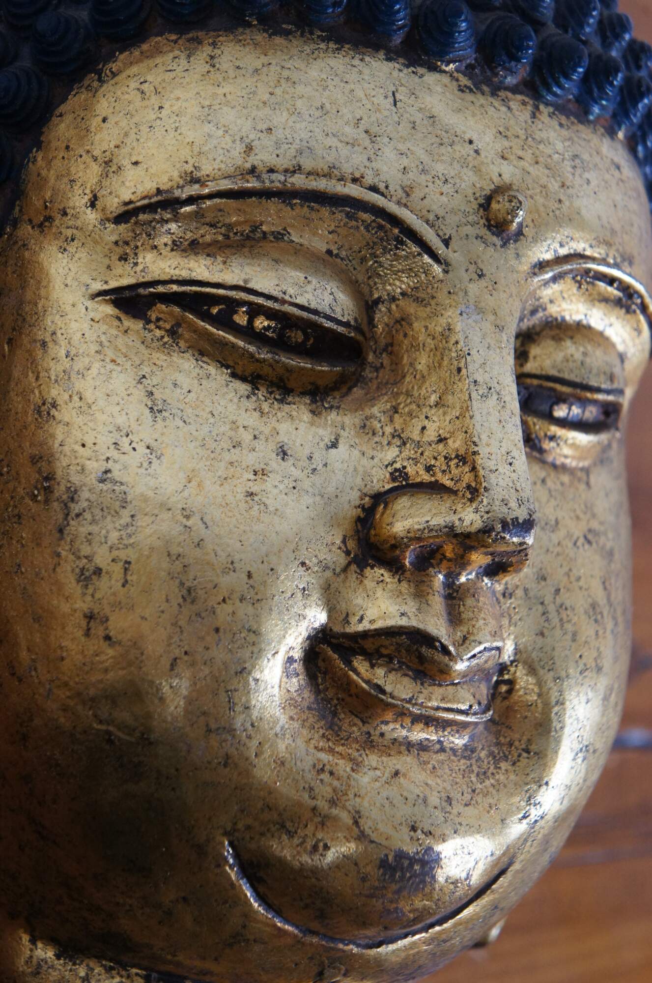 Antique cast iron mediatating Buddha head. Made of iron with round face, elongated earlobes, and bindi at center of forehead, bright gilt painted skin, and deep blue ringlets of curly hair with two burgundy orb decorative pieces.