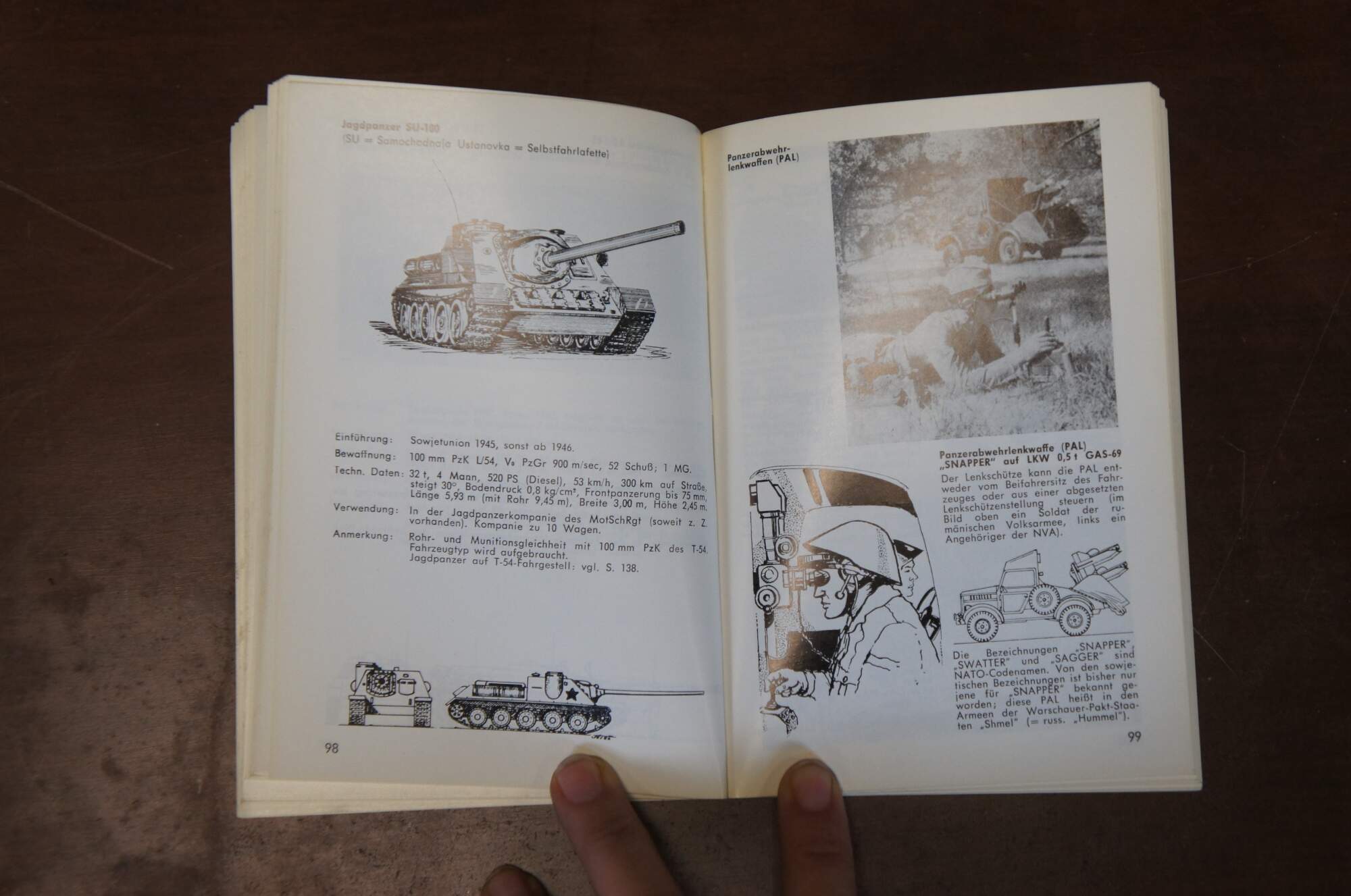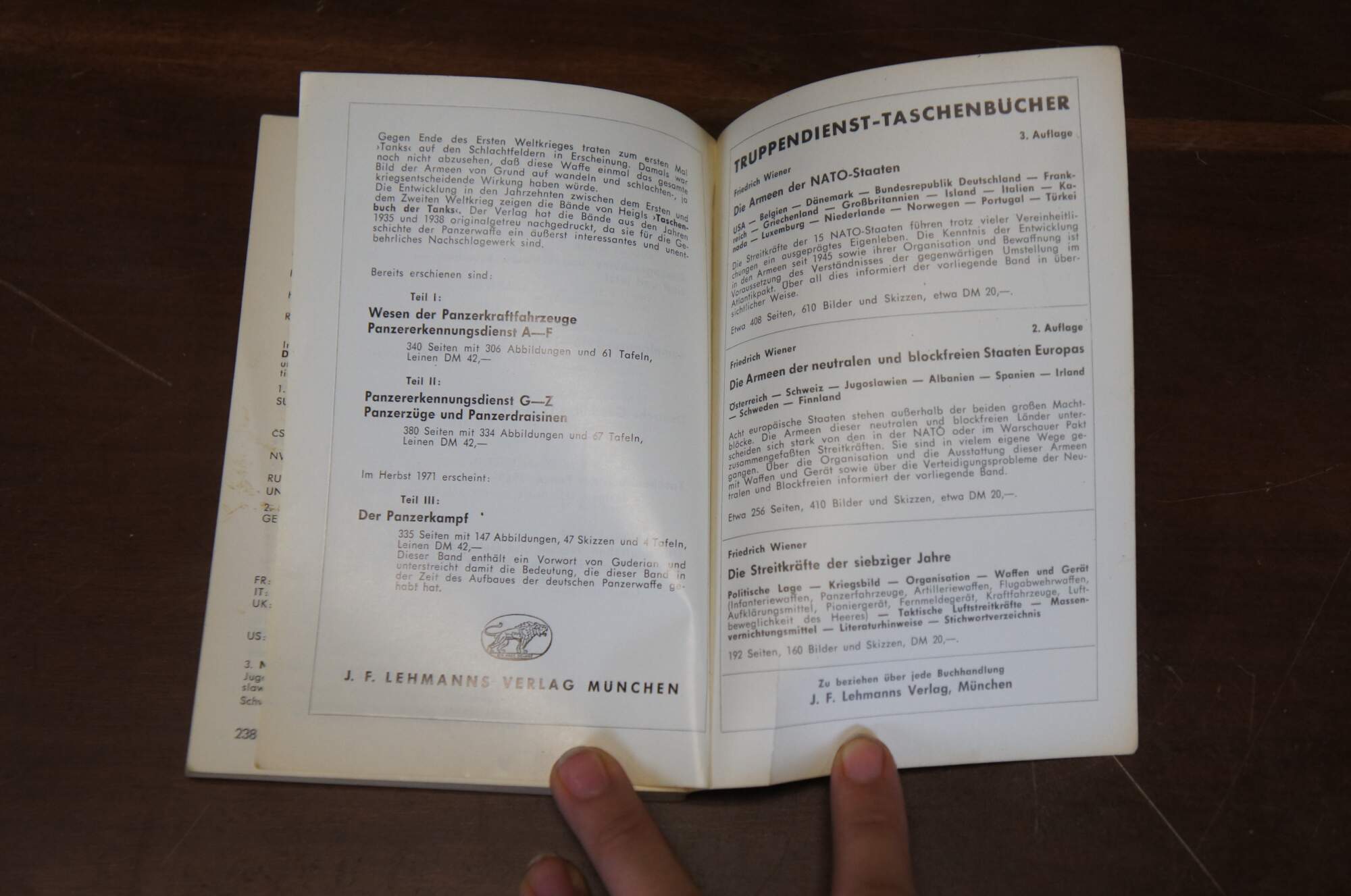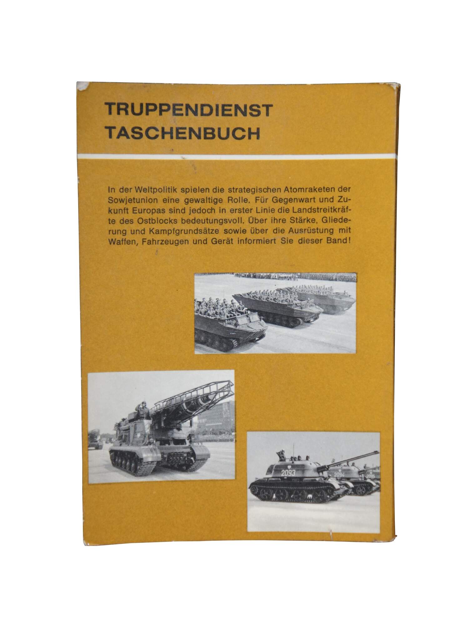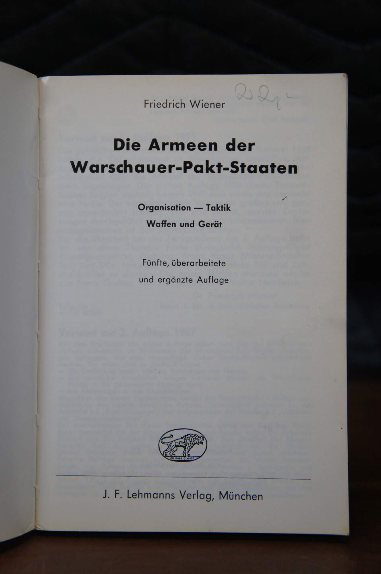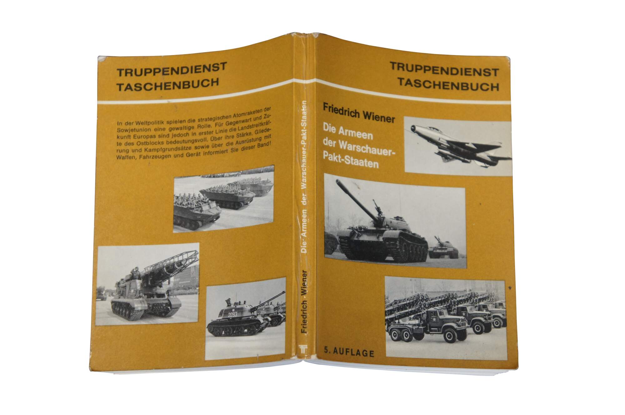 Rare German version of "Truppendienst Taschenbuch" (Troop Service Pocket Book) by Friedrich Wiener - Die Armeen der Warschauer-Pakt-Staaten - Organisation - Taktik - Waffen und Gerat (The Armies of the Warsaw Pact States Organization - Tactics - Weapons and Equipment) - 5th Revised and Expanded Edition - published by J.F. Lehmanns - ISBN 3-469-00368-8 - Printed by Carl Ueberreuter 1971. Slick paper bound soft cover / paper back.