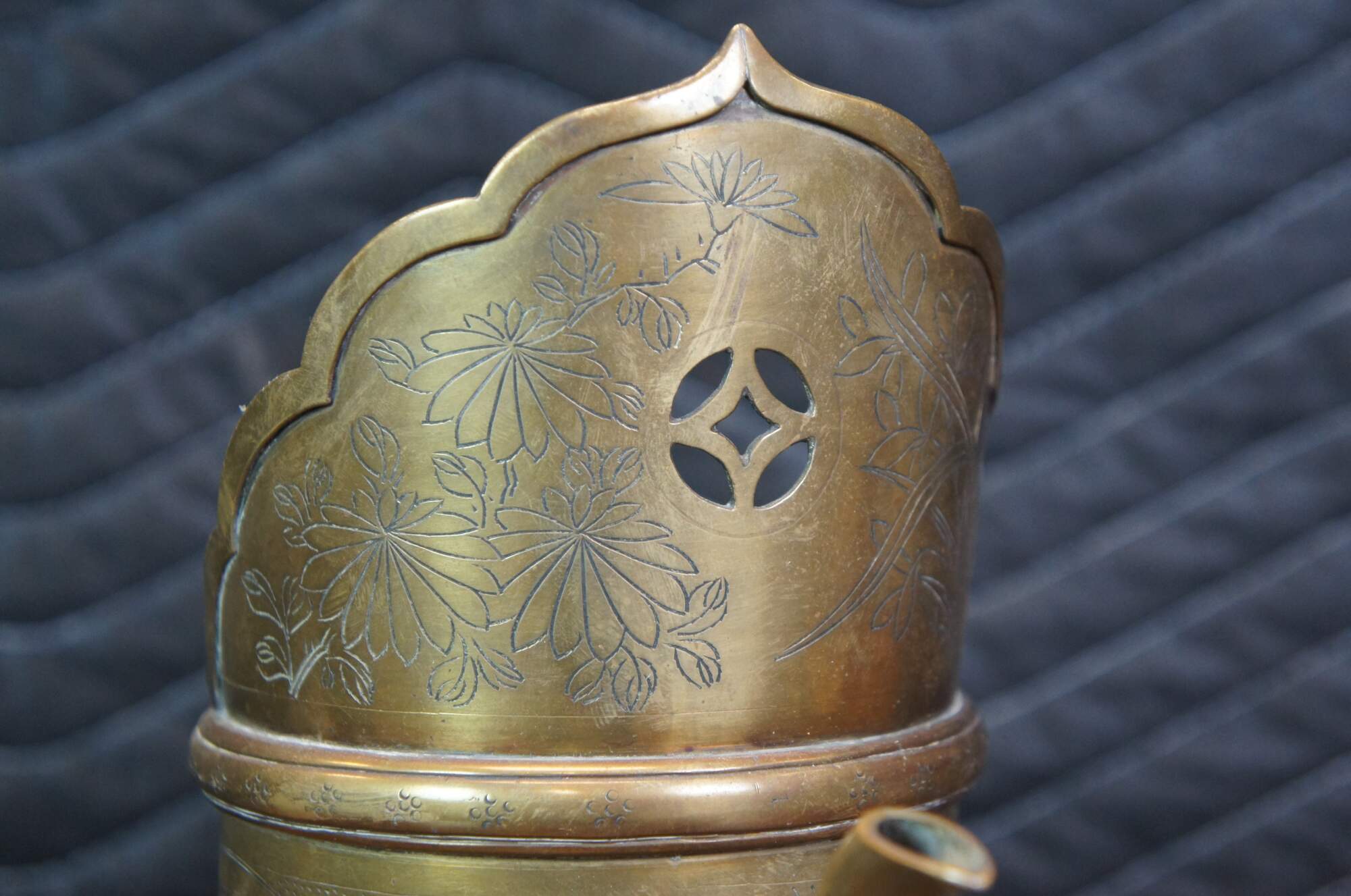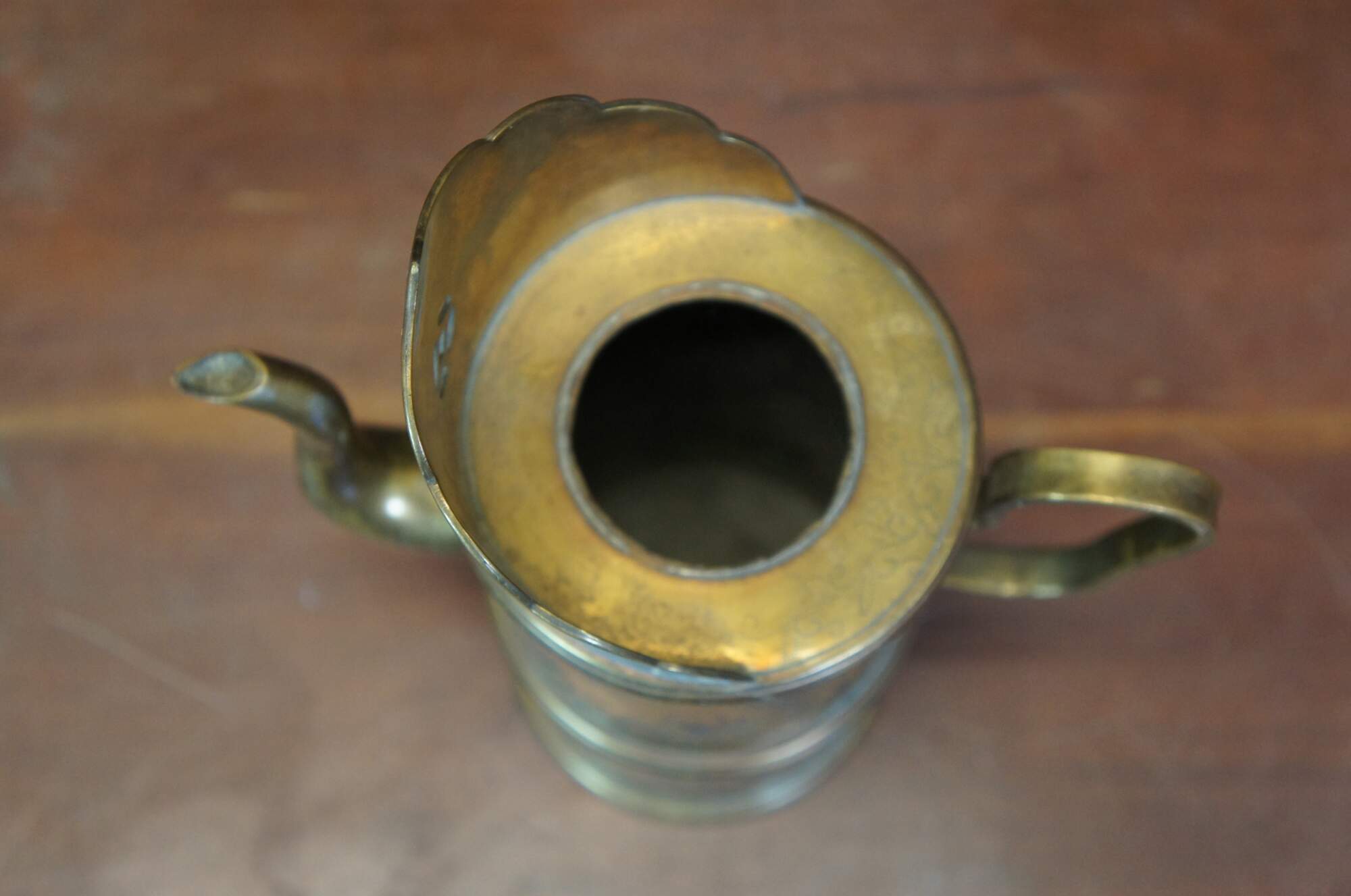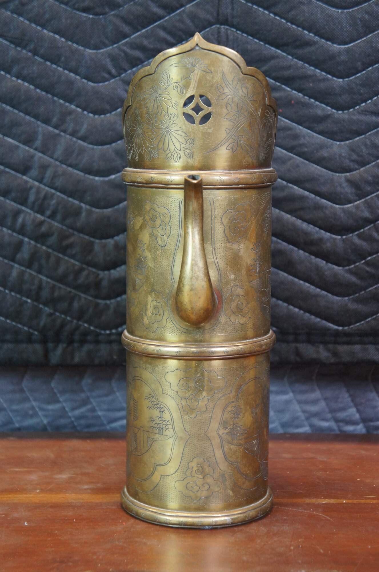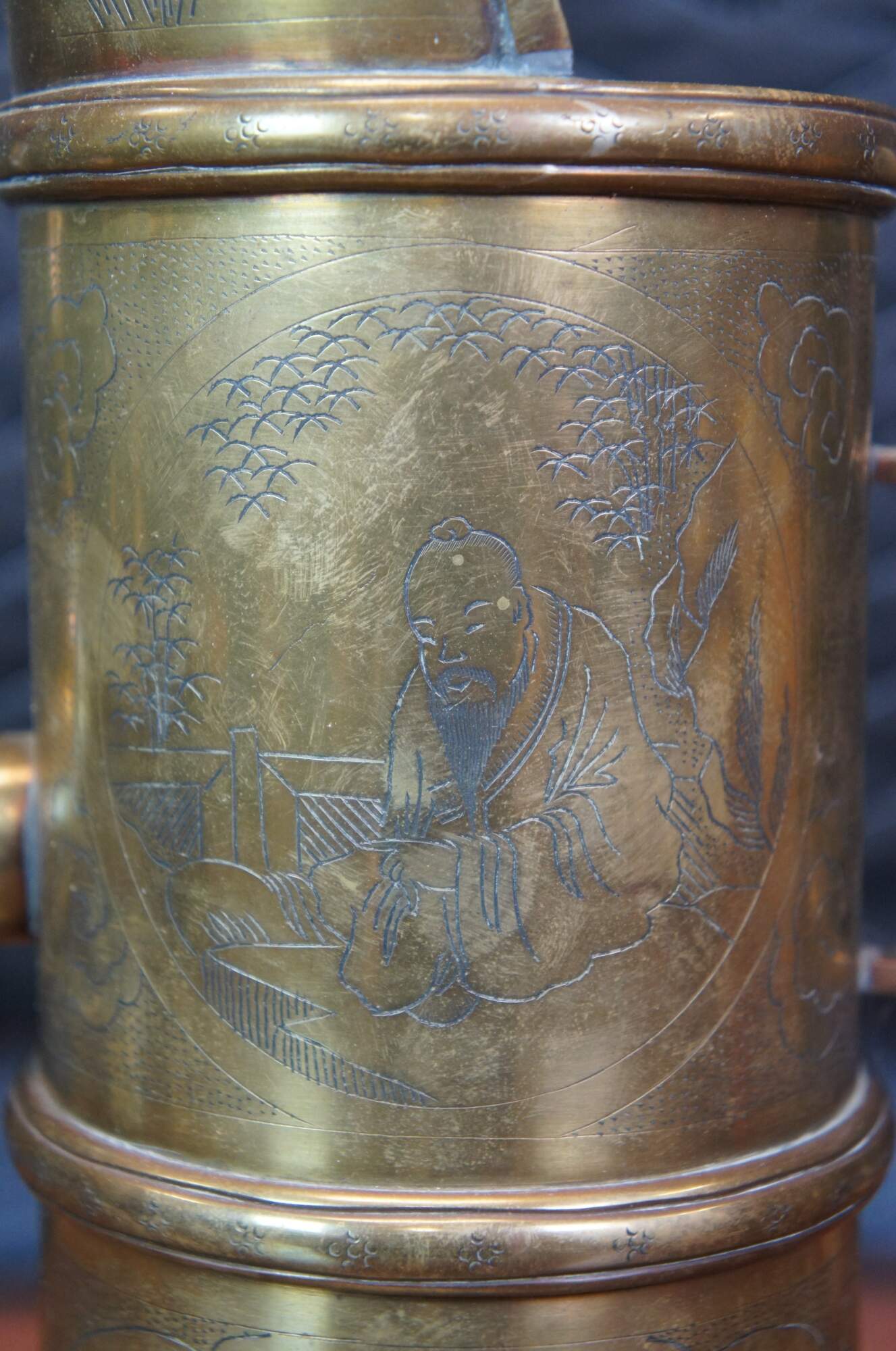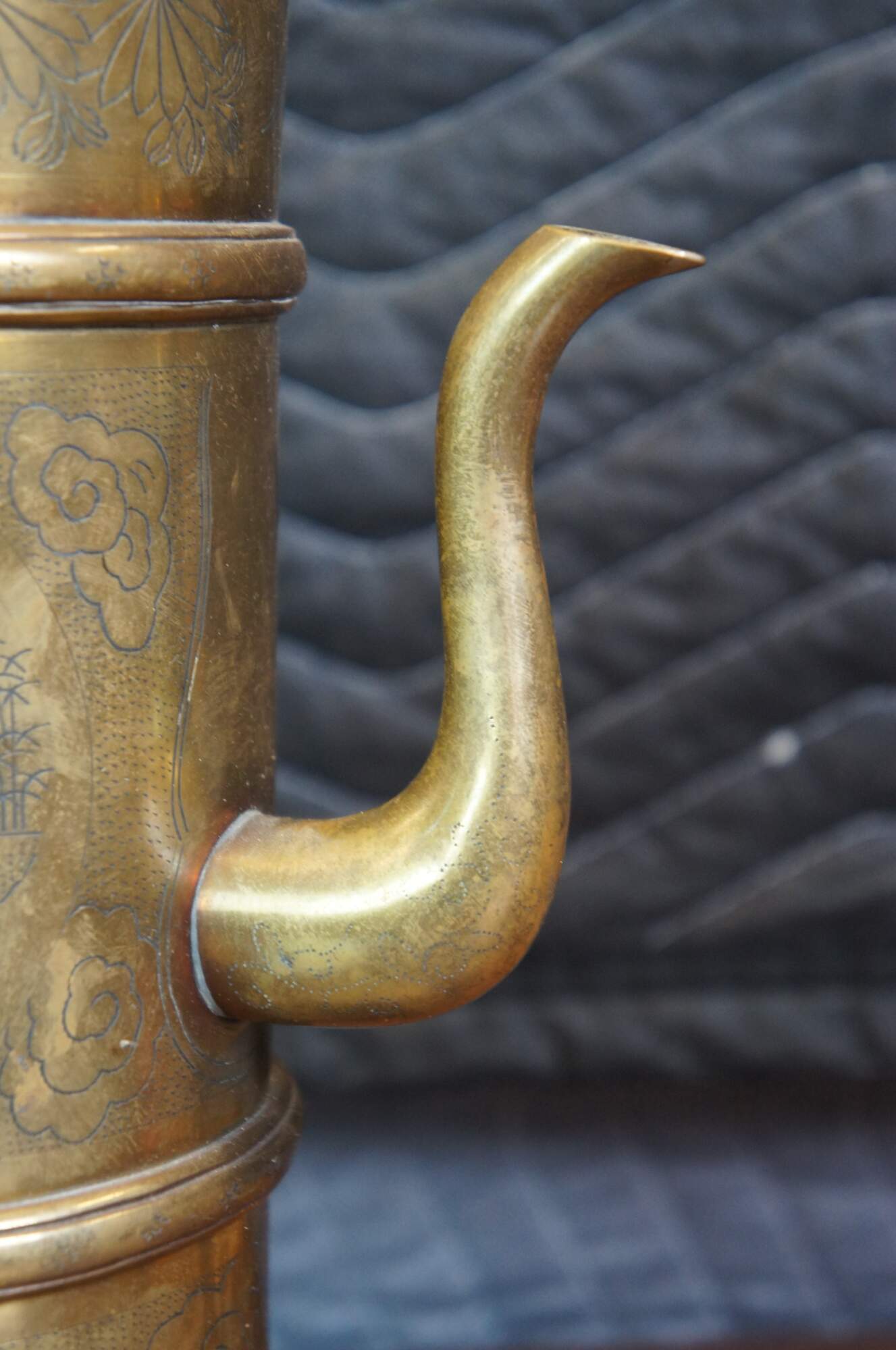 Vintage brass teapot / pitcher featuring a double height cylindrical form with gooseneck spout and ear shaped handle. Segments are etched with scenes of Asian figures seated in a garden, mirrored on opposite sides of the pot. The top is crested with a foliate etched scalloped edge accent piece. Missing lid.
