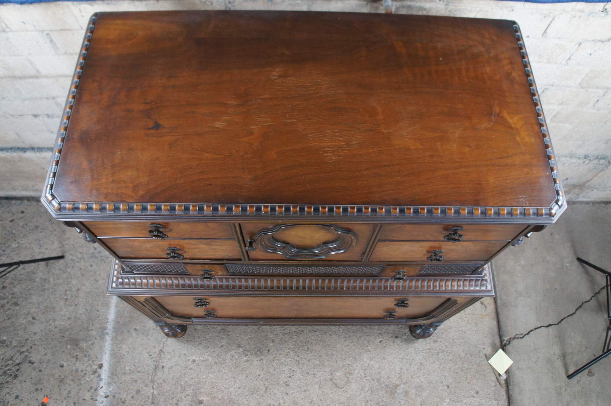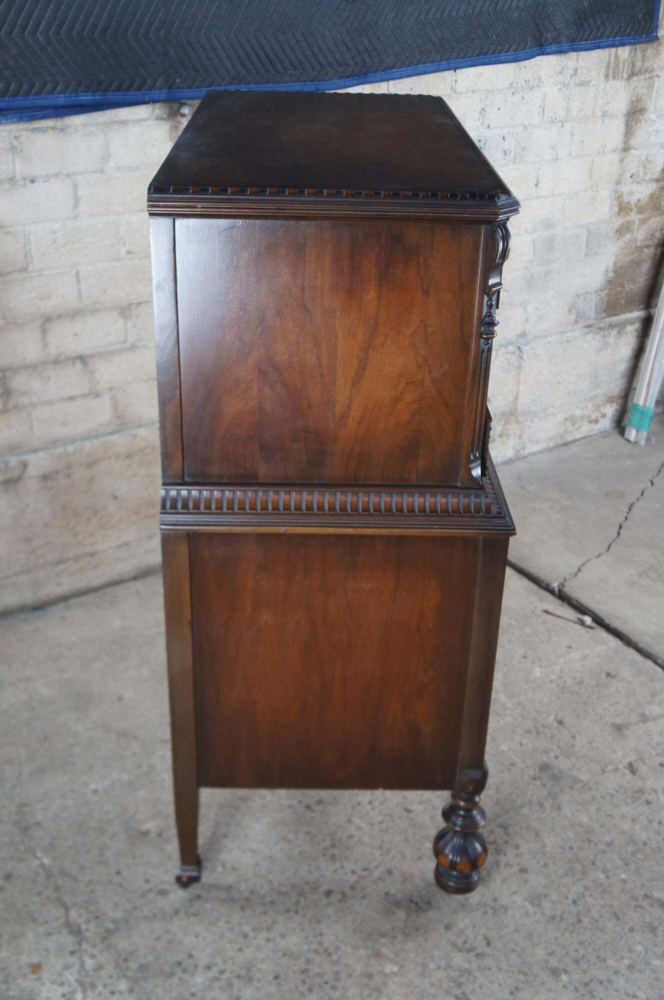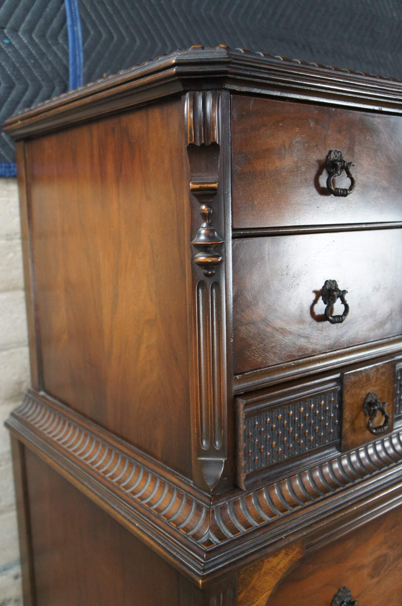 American Furniture Company Jacobean Gothic Revival tallboy dresser, Circa 1930s. Operating out of Batesville Indiana since 1899, they worked closely and collaborated in part with Romweber. Specializing in high grade bedroom suites & furniture. Features a chest on chest form made from American walnut with matchbook veneer burled drawer fronts. Includes 7 oak dovetailed drawers and one central cubby with a quatrefoil shaped door. The outer stiles of the dresser are chamfered with "s" scrolled spandrels over quarter cut spindles and fluting terminating into rams tongues. The cabinet has brass drawer pulls and is supported by bulbous turned bun feet.