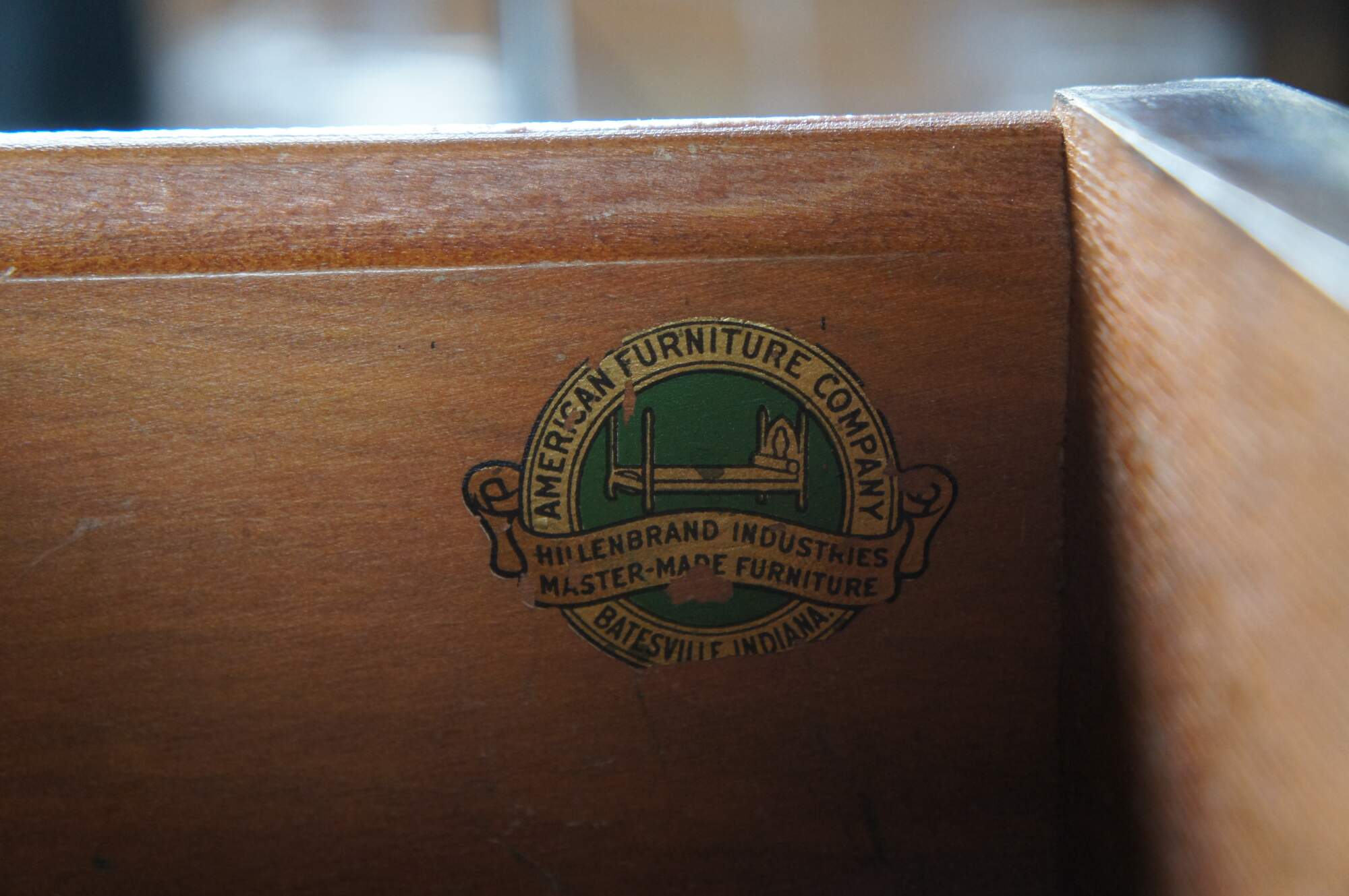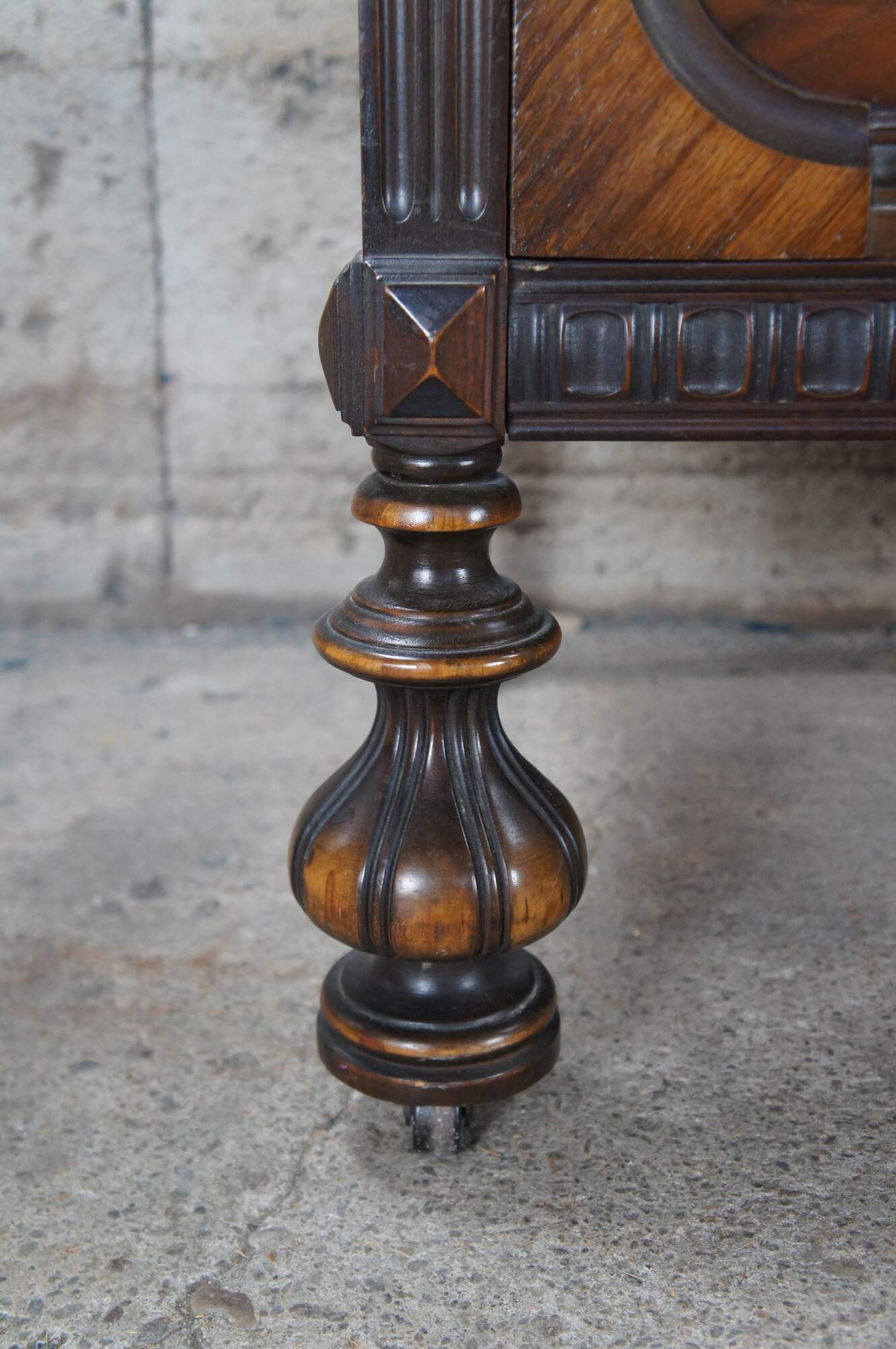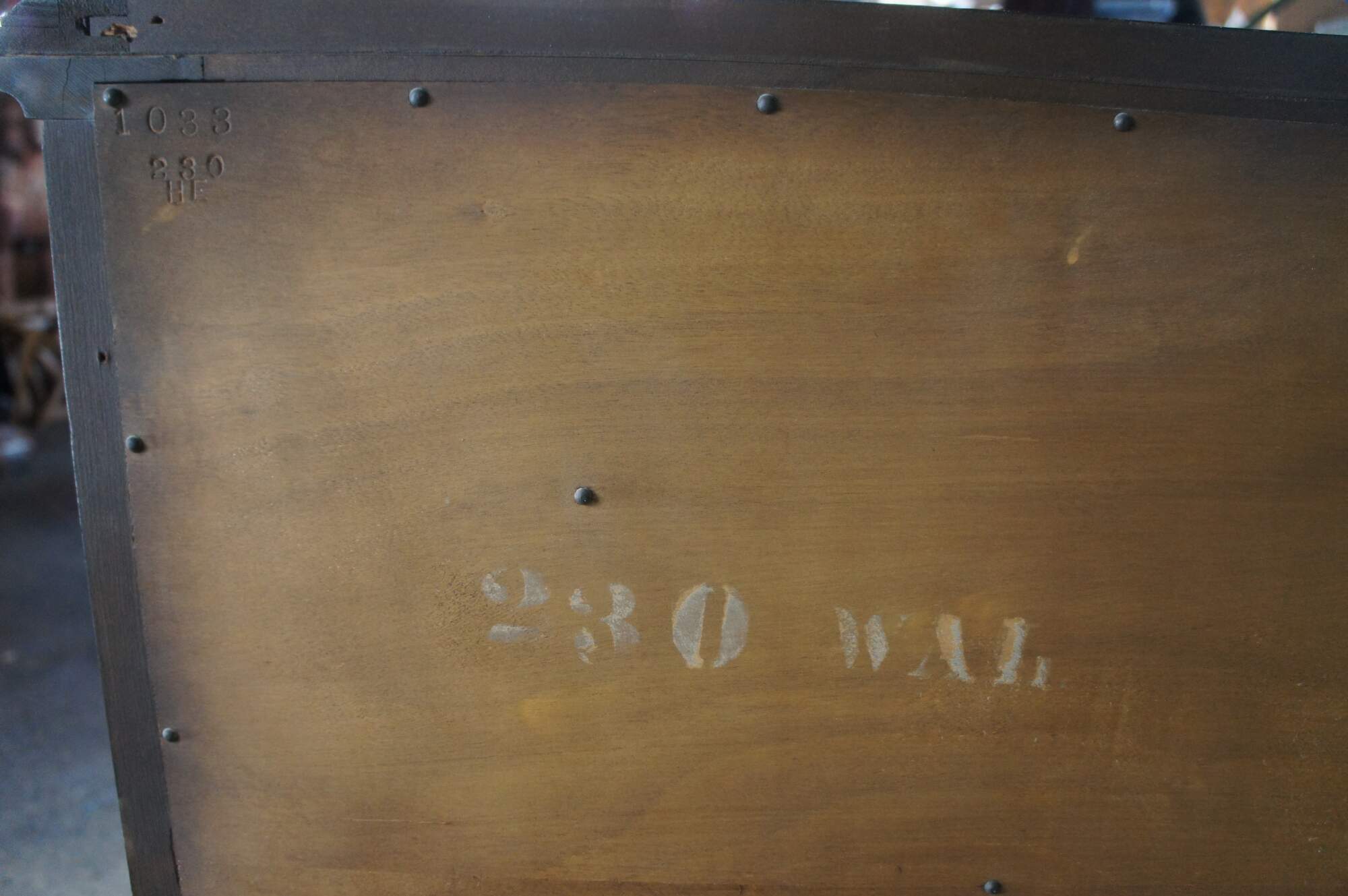American Furniture Company Jacobean Gothic Revival tallboy dresser, Circa 1930s. Operating out of Batesville Indiana since 1899, they worked closely and collaborated in part with Romweber. Specializing in high grade bedroom suites & furniture. Features a chest on chest form made from American walnut with matchbook veneer burled drawer fronts. Includes 7 oak dovetailed drawers and one central cubby with a quatrefoil shaped door. The outer stiles of the dresser are chamfered with "s" scrolled spandrels over quarter cut spindles and fluting terminating into rams tongues. The cabinet has brass drawer pulls and is supported by bulbous turned bun feet.