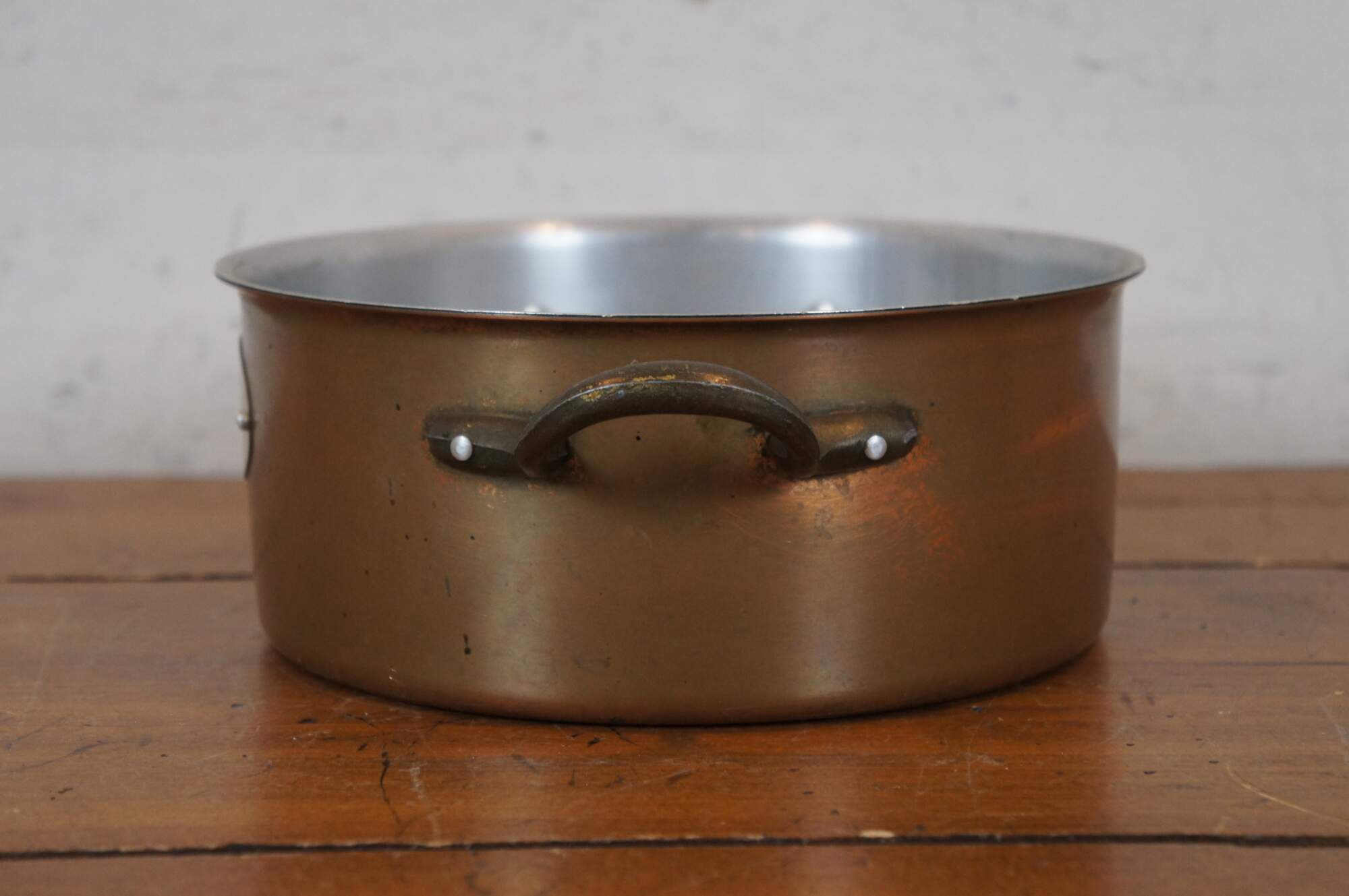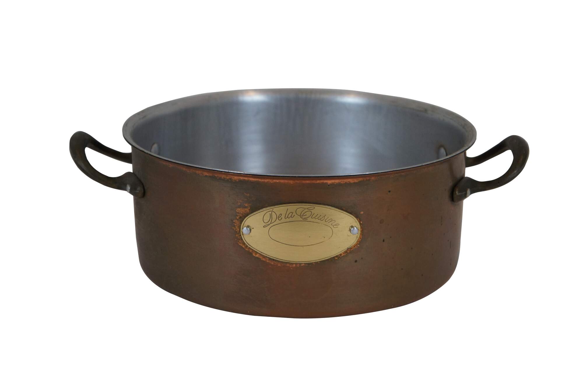 Vintage 20th century copper stock pot / sauce pan by De La Cuisine with two side handles and tinned interior.