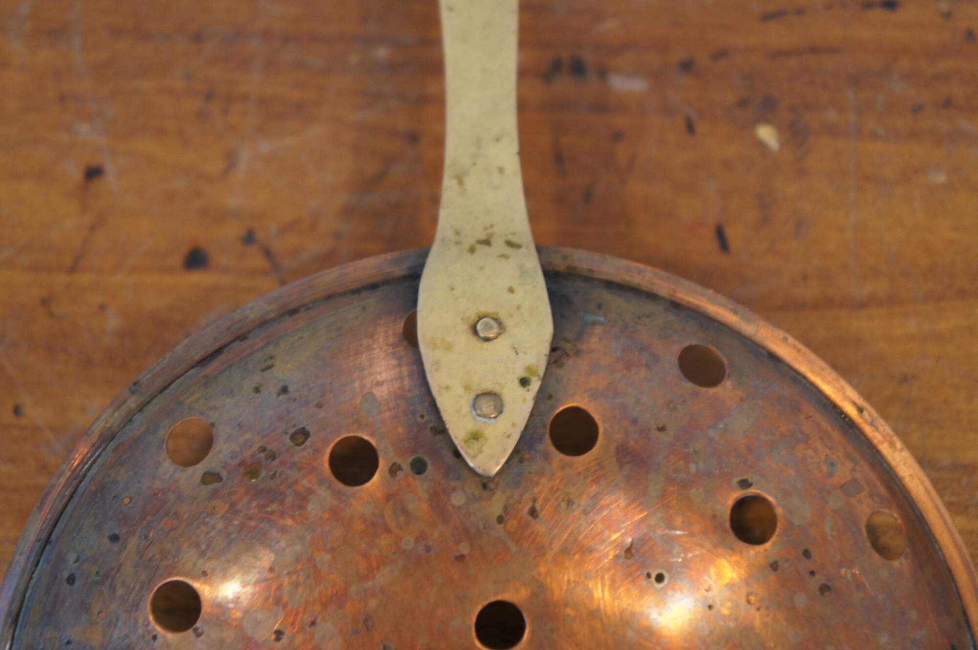 Vintage 20th century copper sieve / strainer / skimmer / ladle with pierced brass handle.