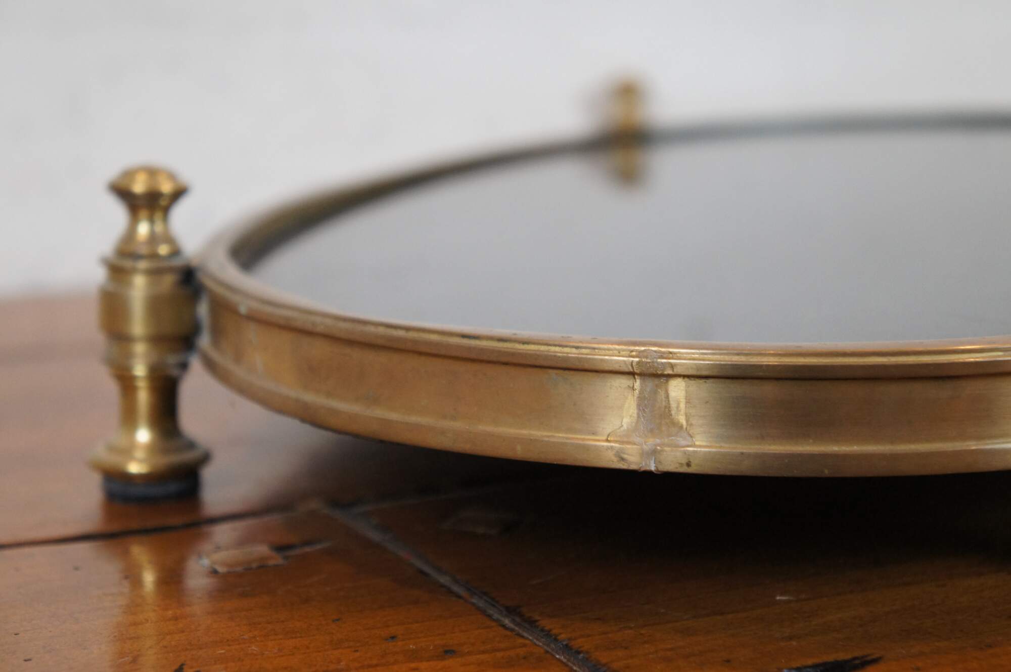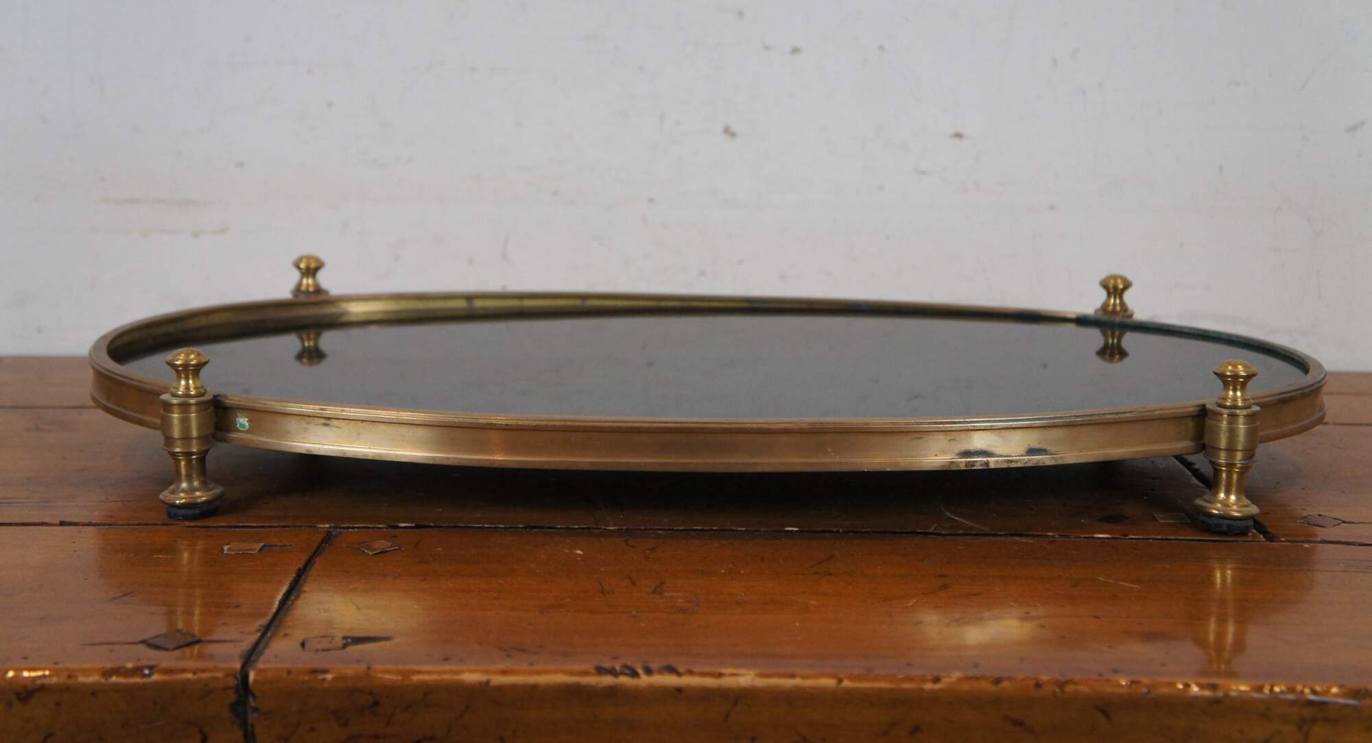 Vintage oval vanity tray / plateau featuring a brass frame and four turned feet supporting a black marble surface.