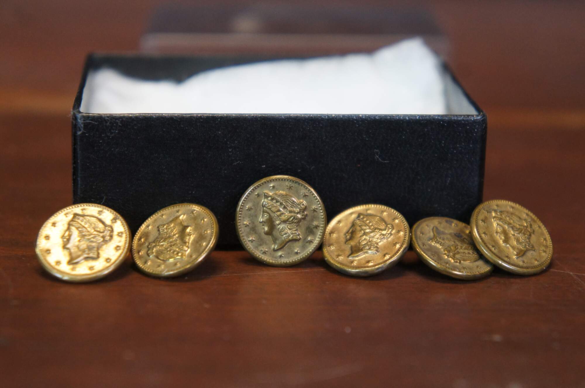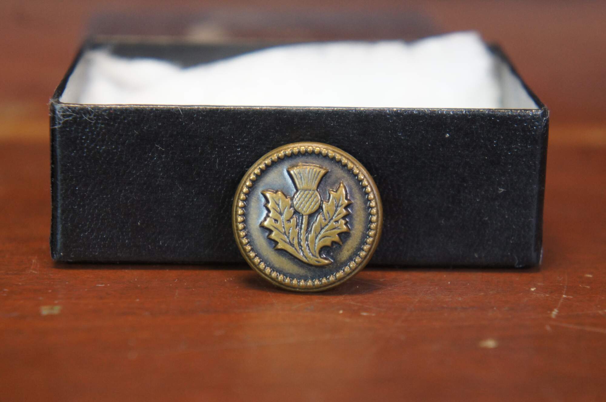 15 piece early to mid 20th century brass shank style buttons and one clasp, decorated with a variety of motifs including coin heads, flowers, pinwheels and thistles.