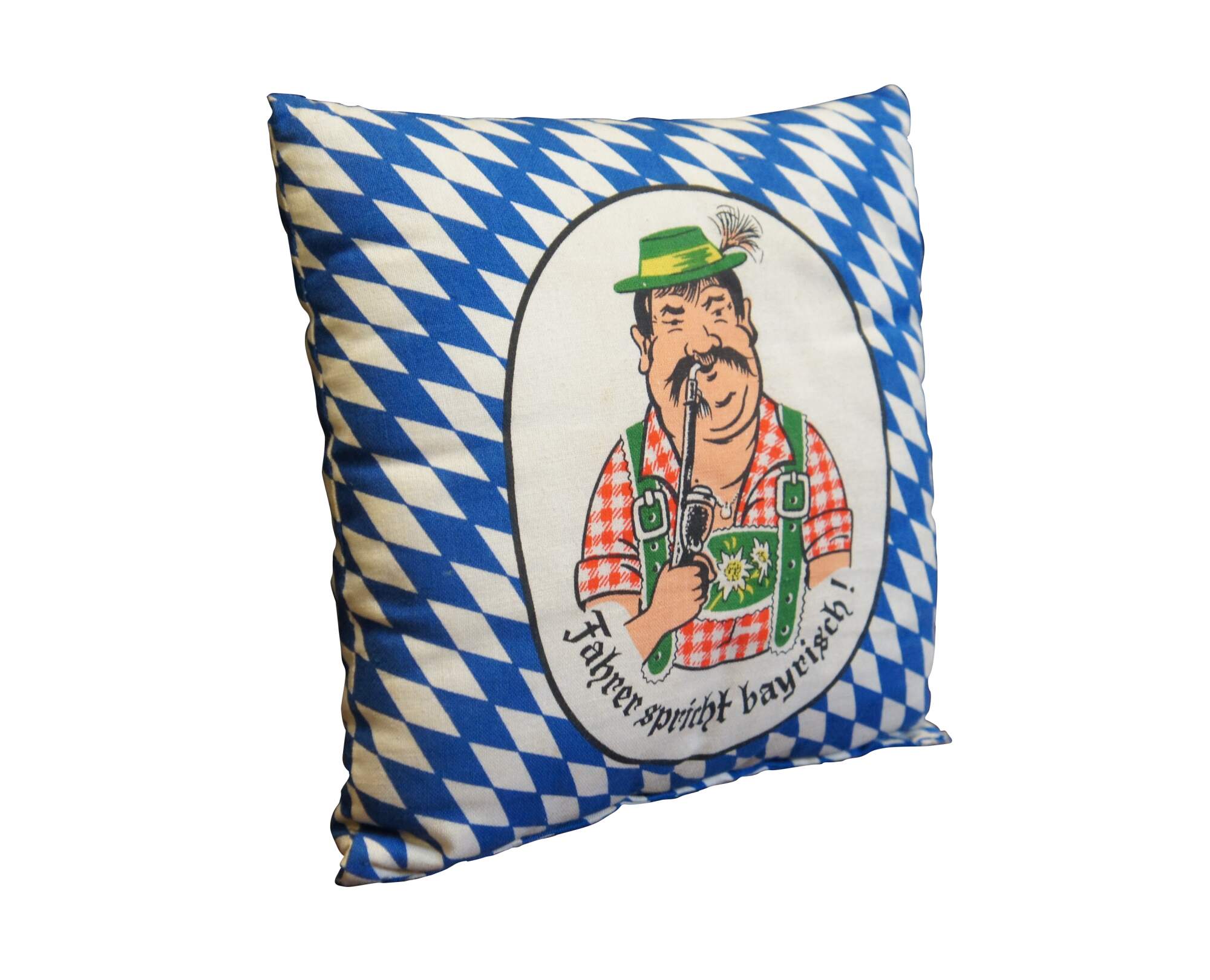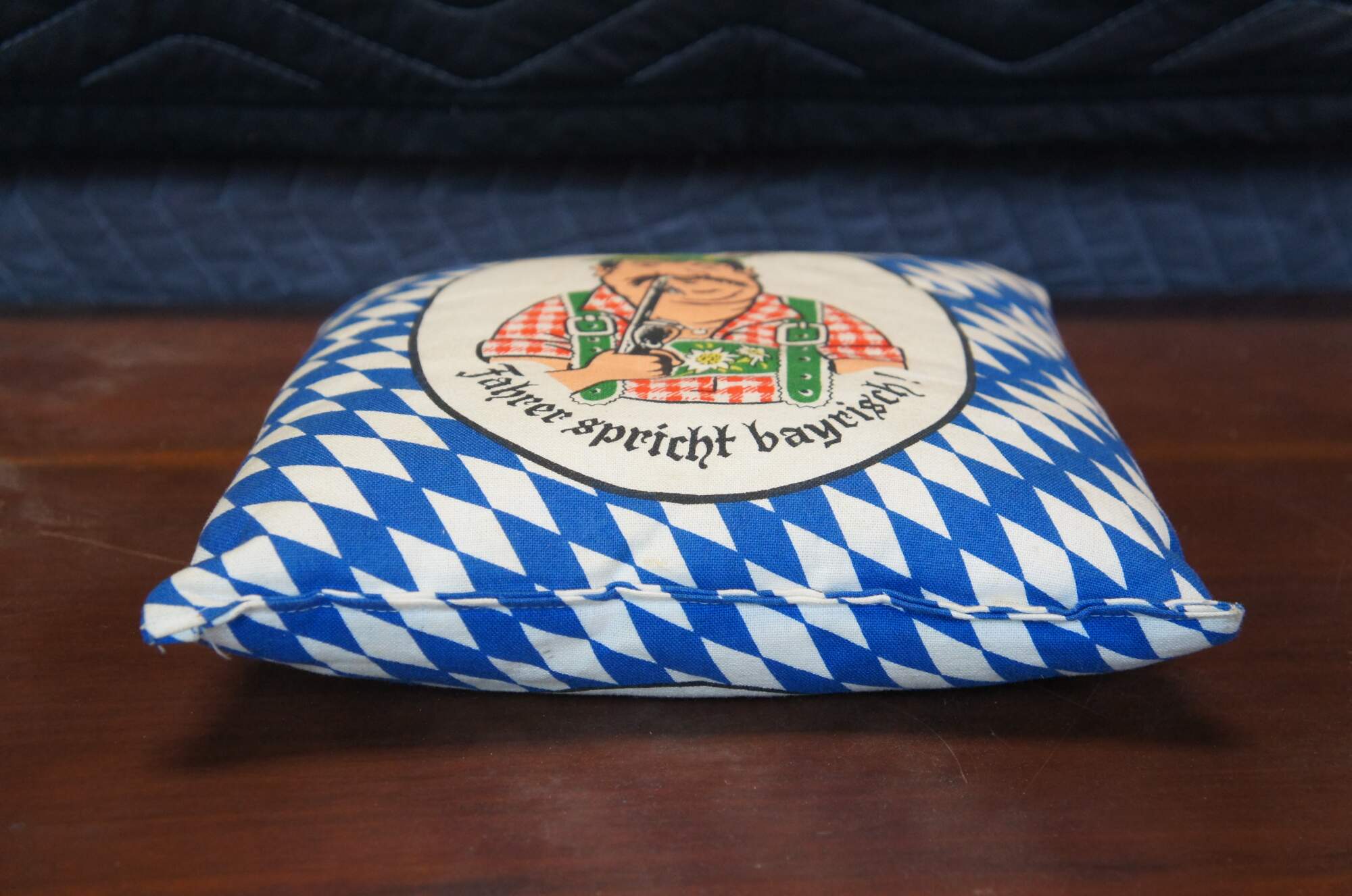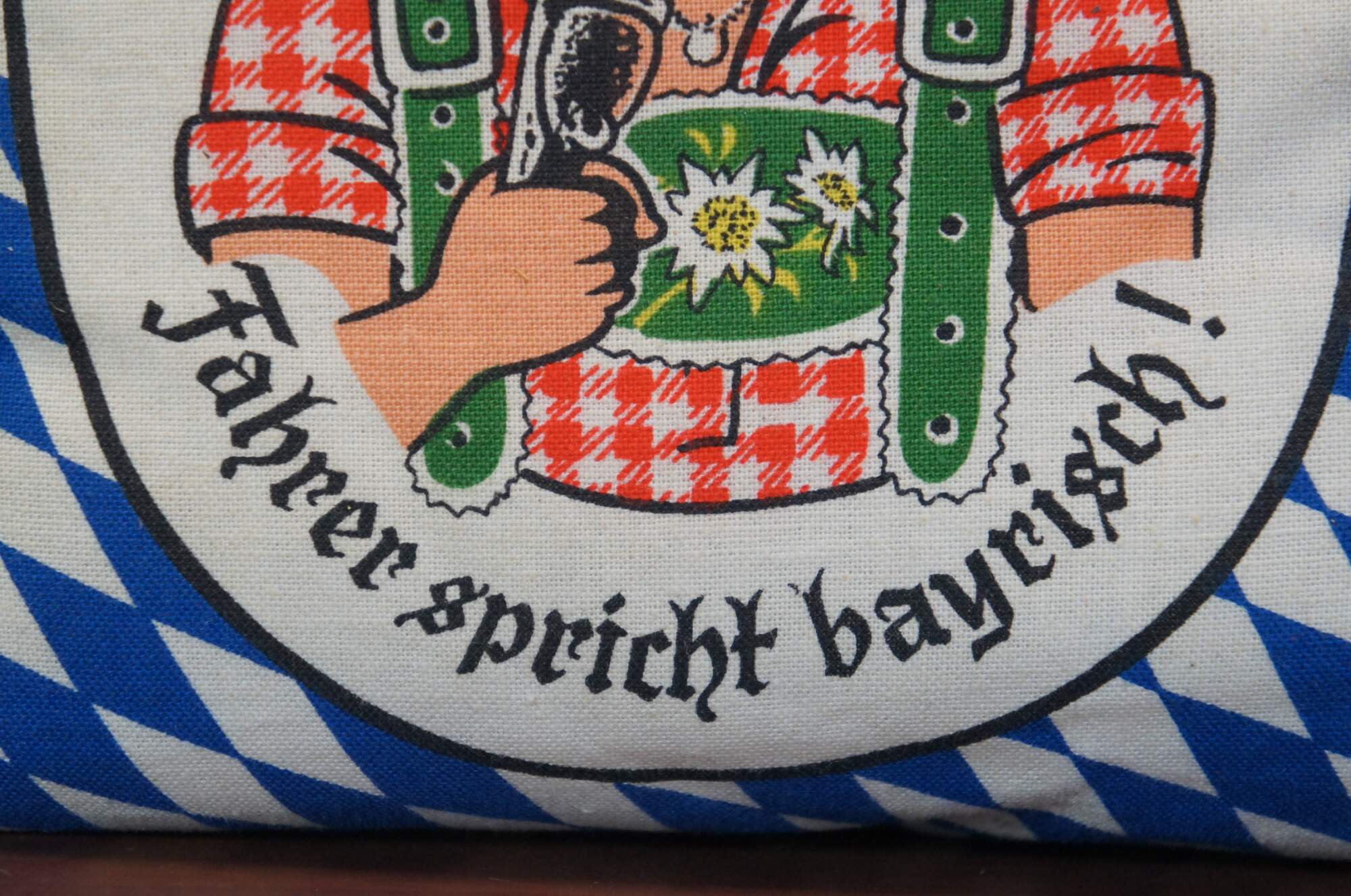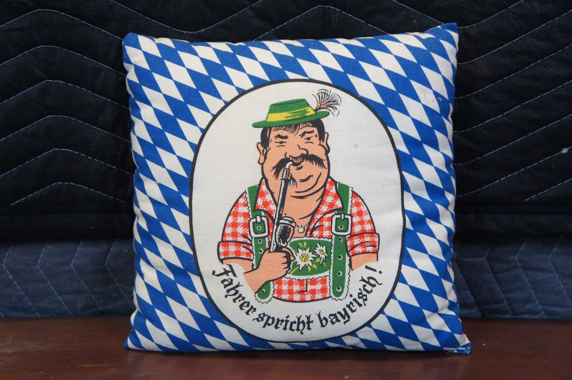 Mid to late 20th century Oktoberfest printed cotton accent pillow featuring a blue and white diamond pattern background and a Bavarian man in green hat and lederhosen smoking a pipe over the legend "Fahrer spricht bayrisch!" (Driver speaks Bavarian).