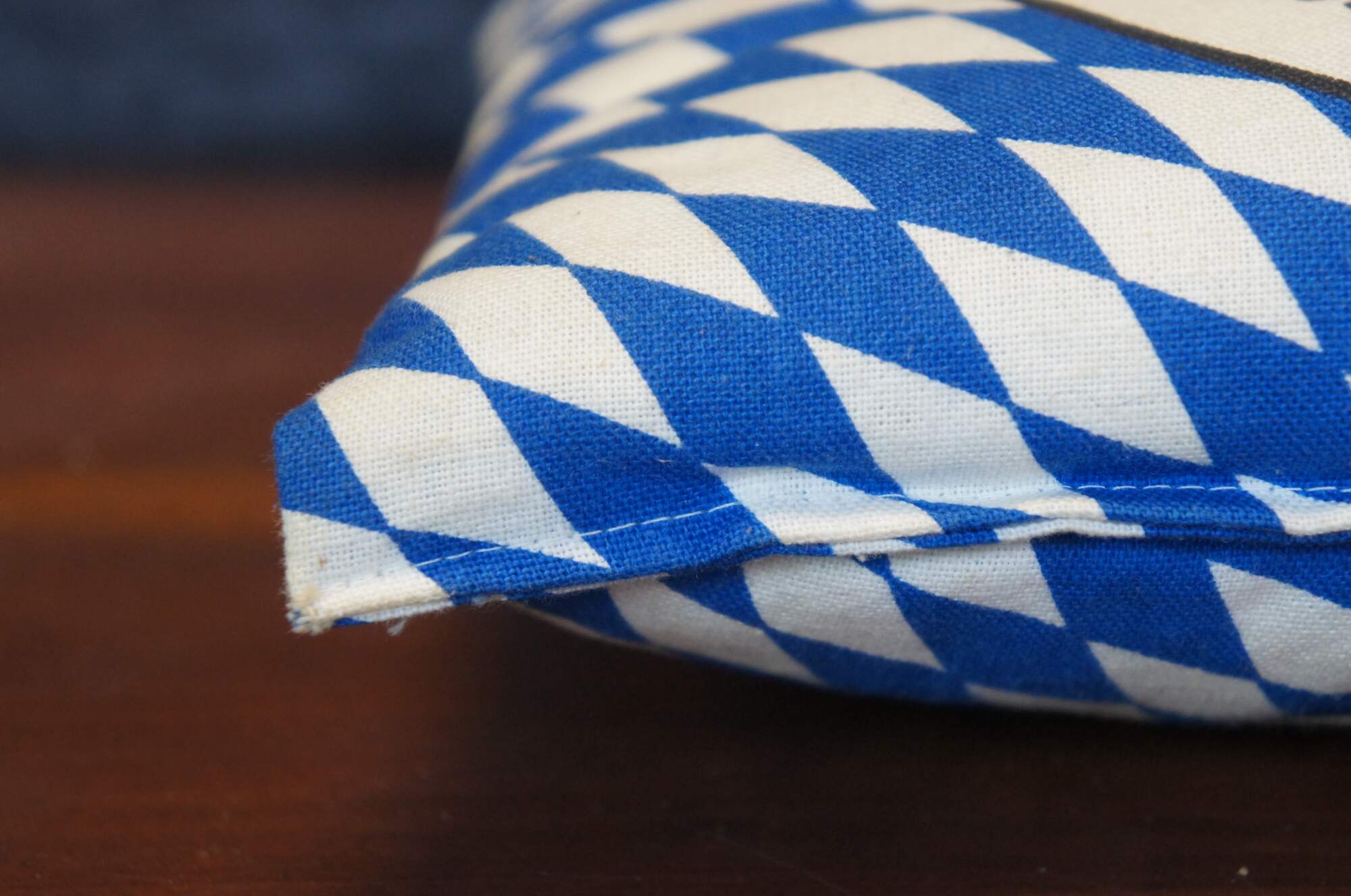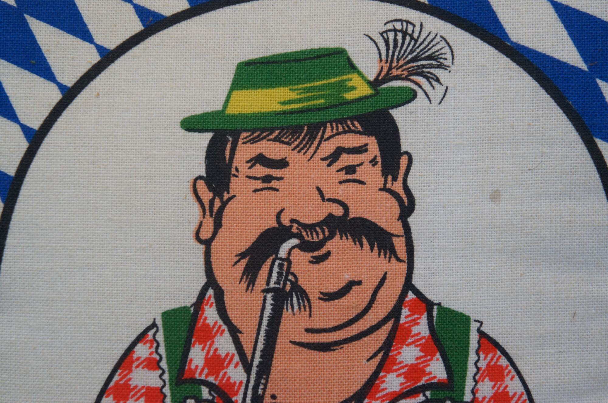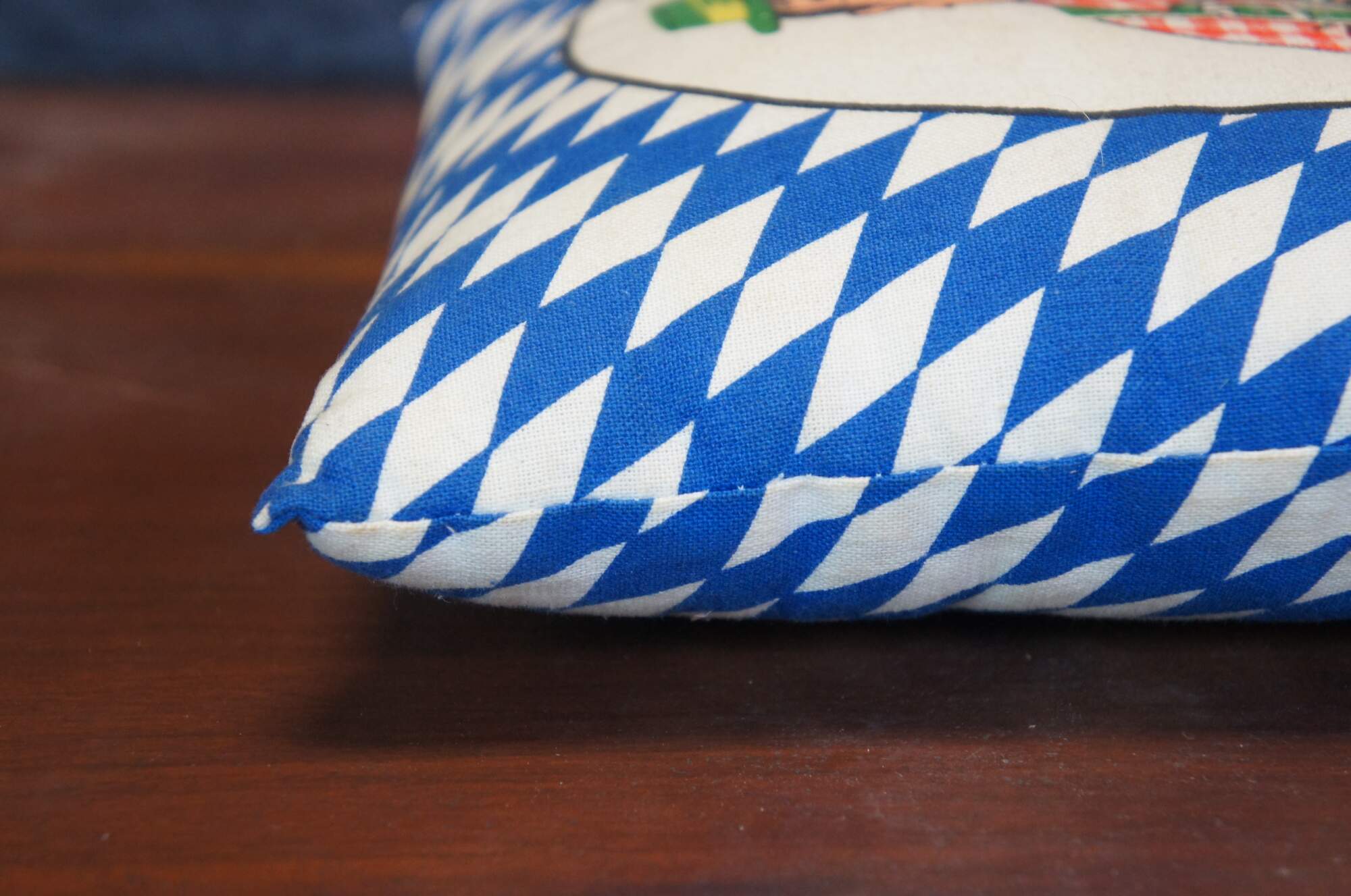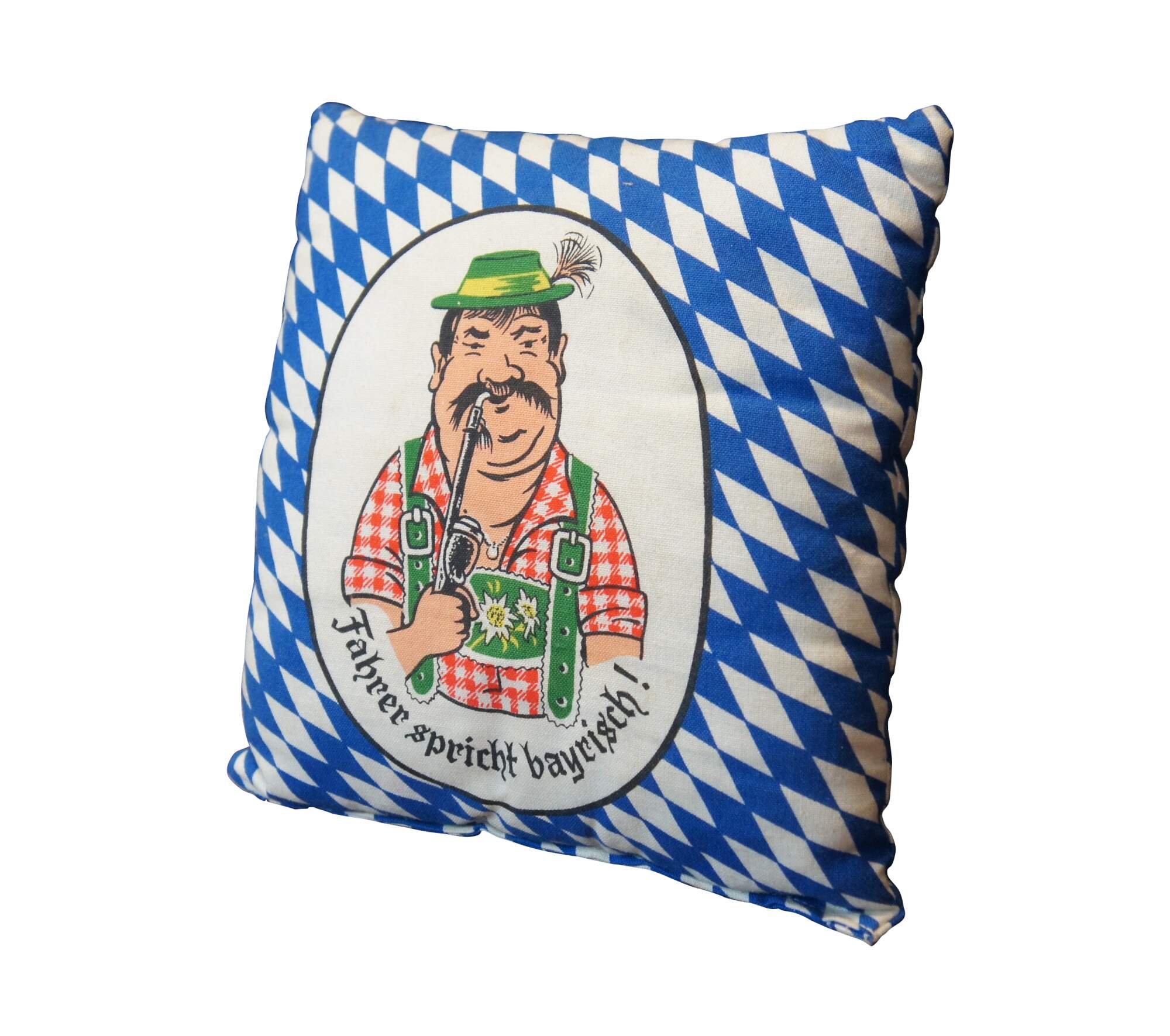 Mid to late 20th century Oktoberfest printed cotton accent pillow featuring a blue and white diamond pattern background and a Bavarian man in green hat and lederhosen smoking a pipe over the legend "Fahrer spricht bayrisch!" (Driver speaks Bavarian).