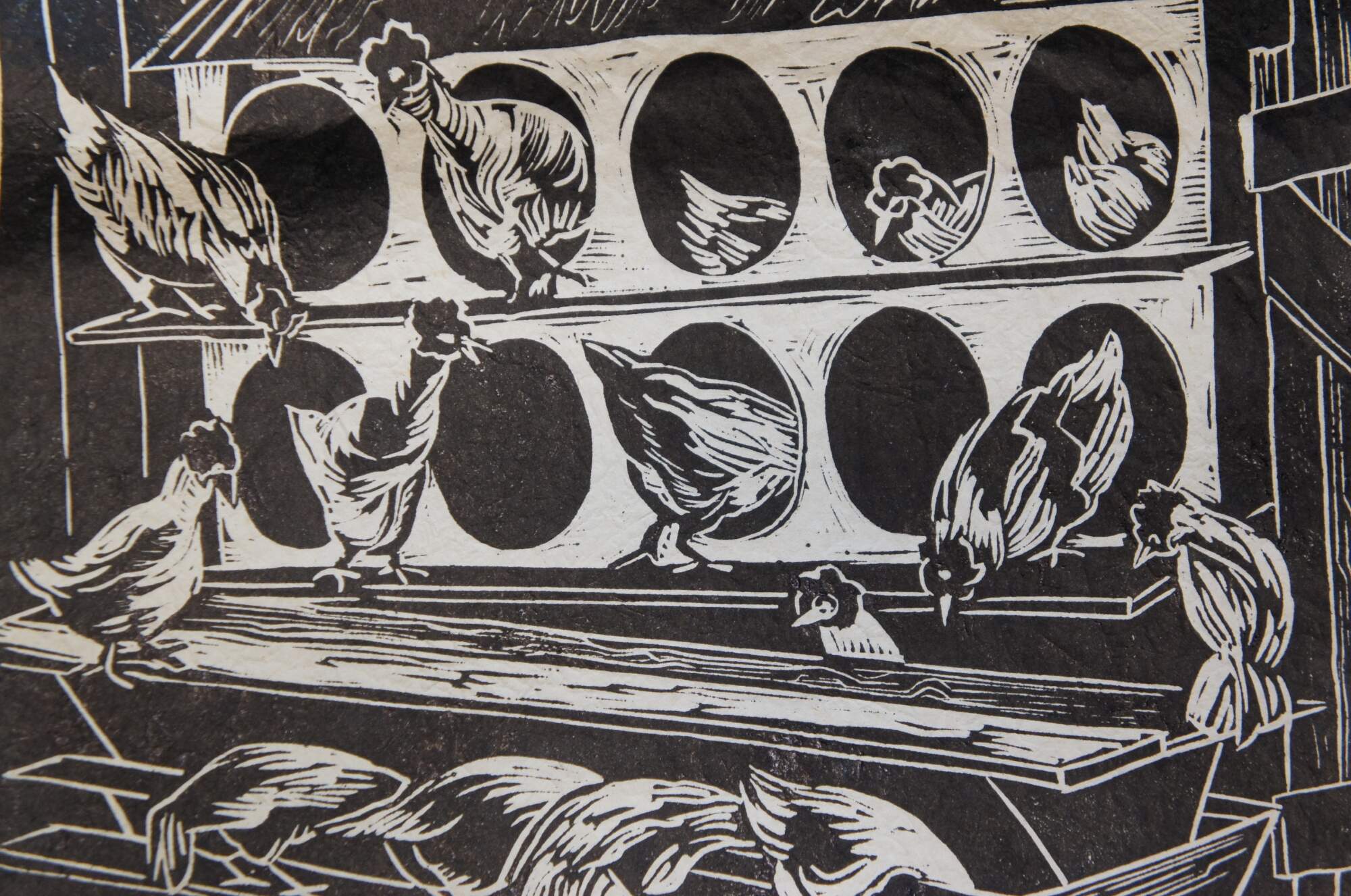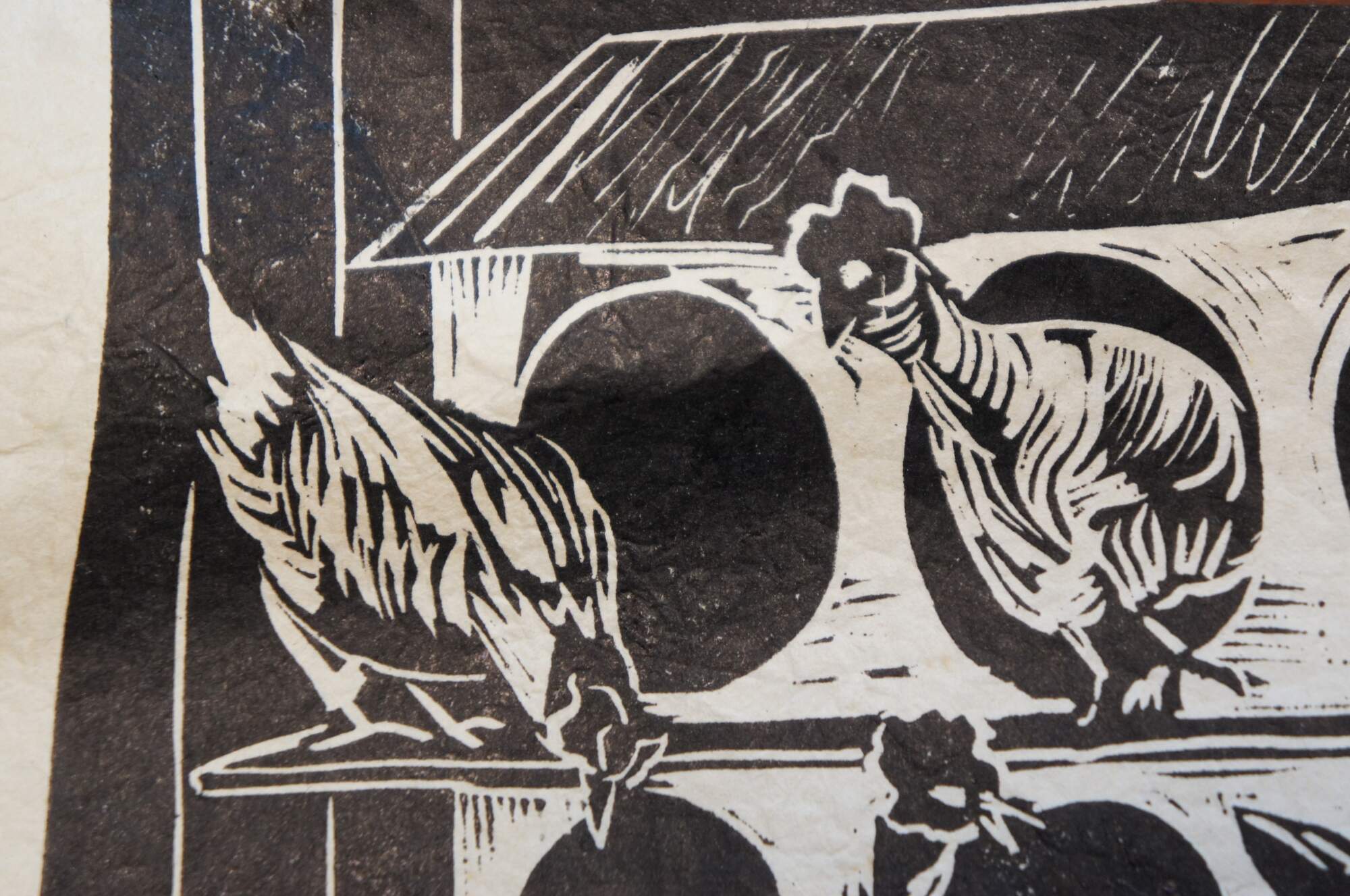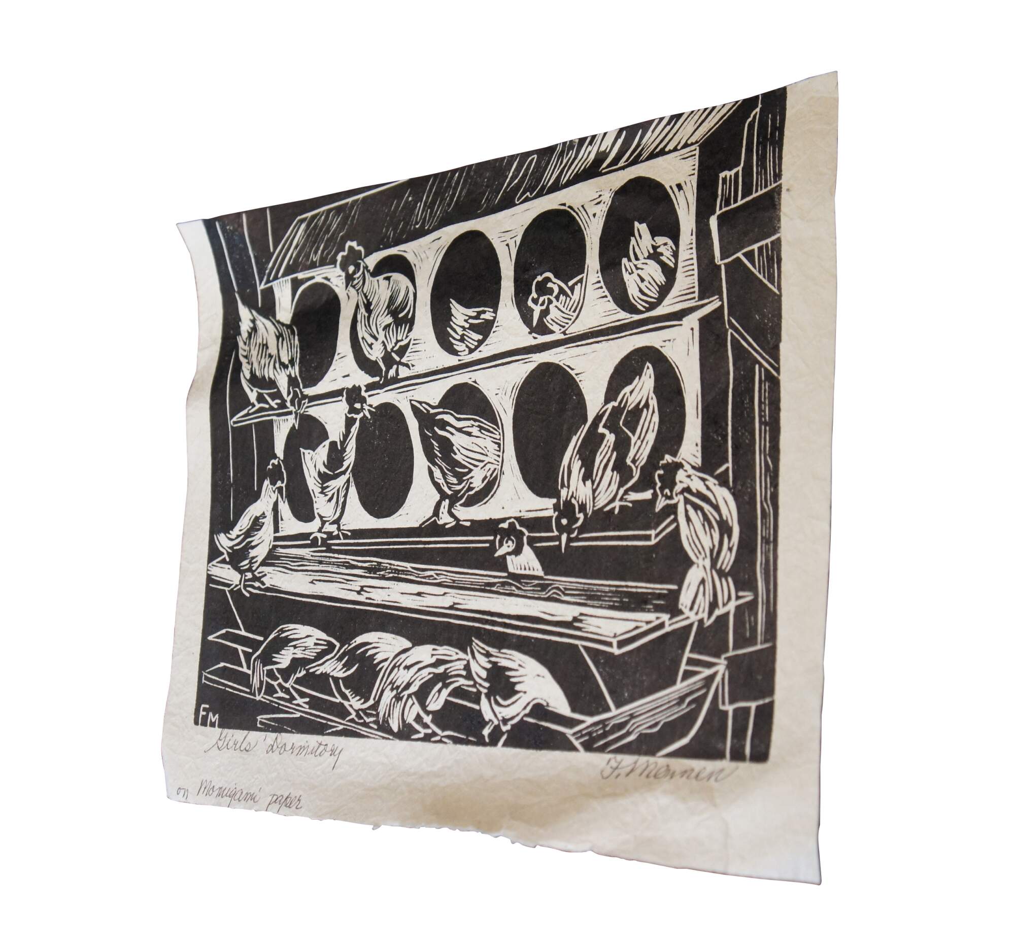 Mid 20th century folk art woodblock print titled "Girls' Dormitory," depicting a flock of chickens at their nesting boxes and feeding trough in a coop. Black ink on Momigami paper. Titled and signed by Fannie Mennen.