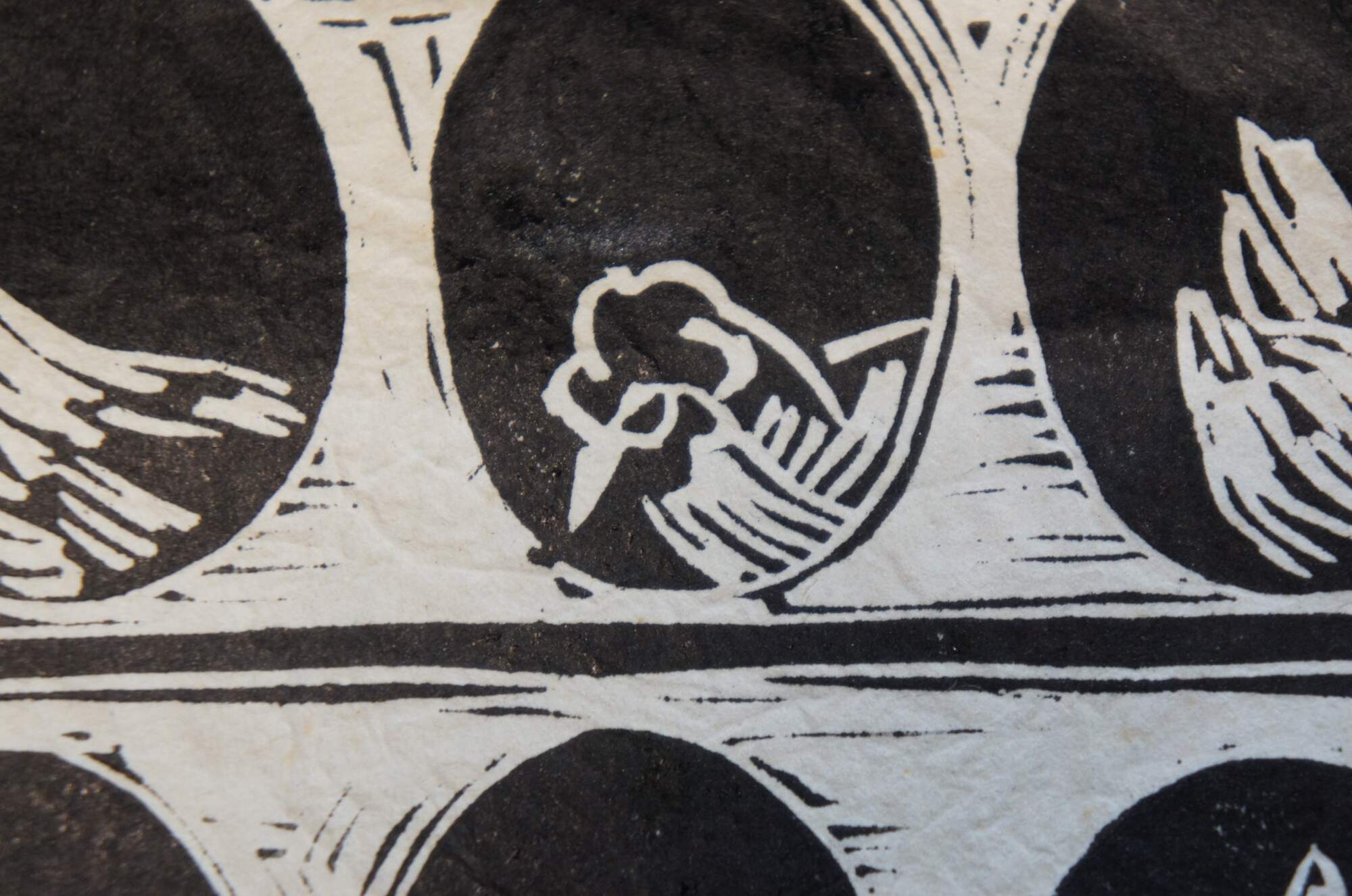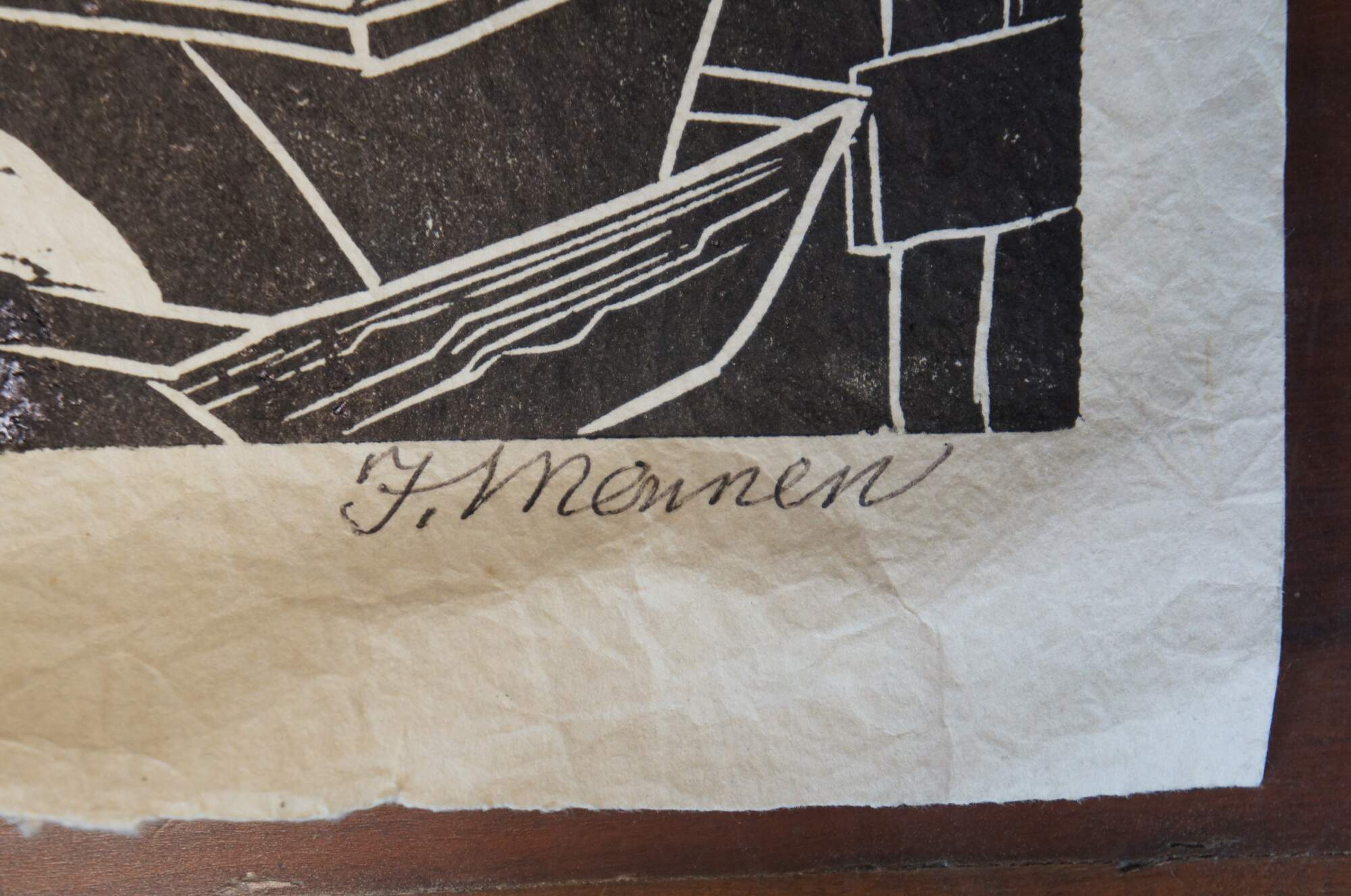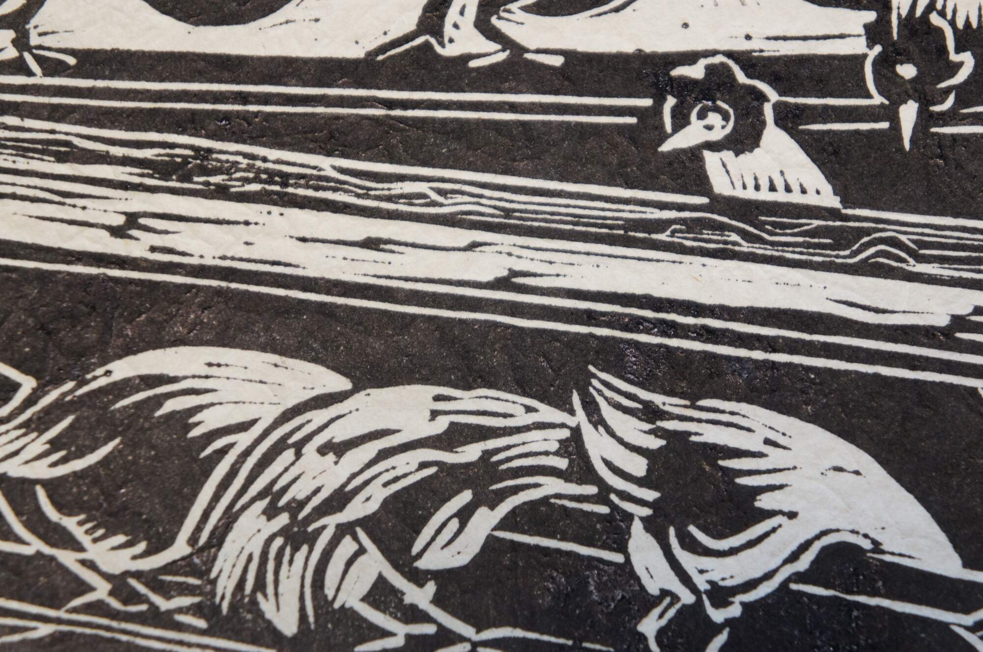 Mid 20th century folk art woodblock print titled "Girls' Dormitory," depicting a flock of chickens at their nesting boxes and feeding trough in a coop. Black ink on Momigami paper. Titled and signed by Fannie Mennen.