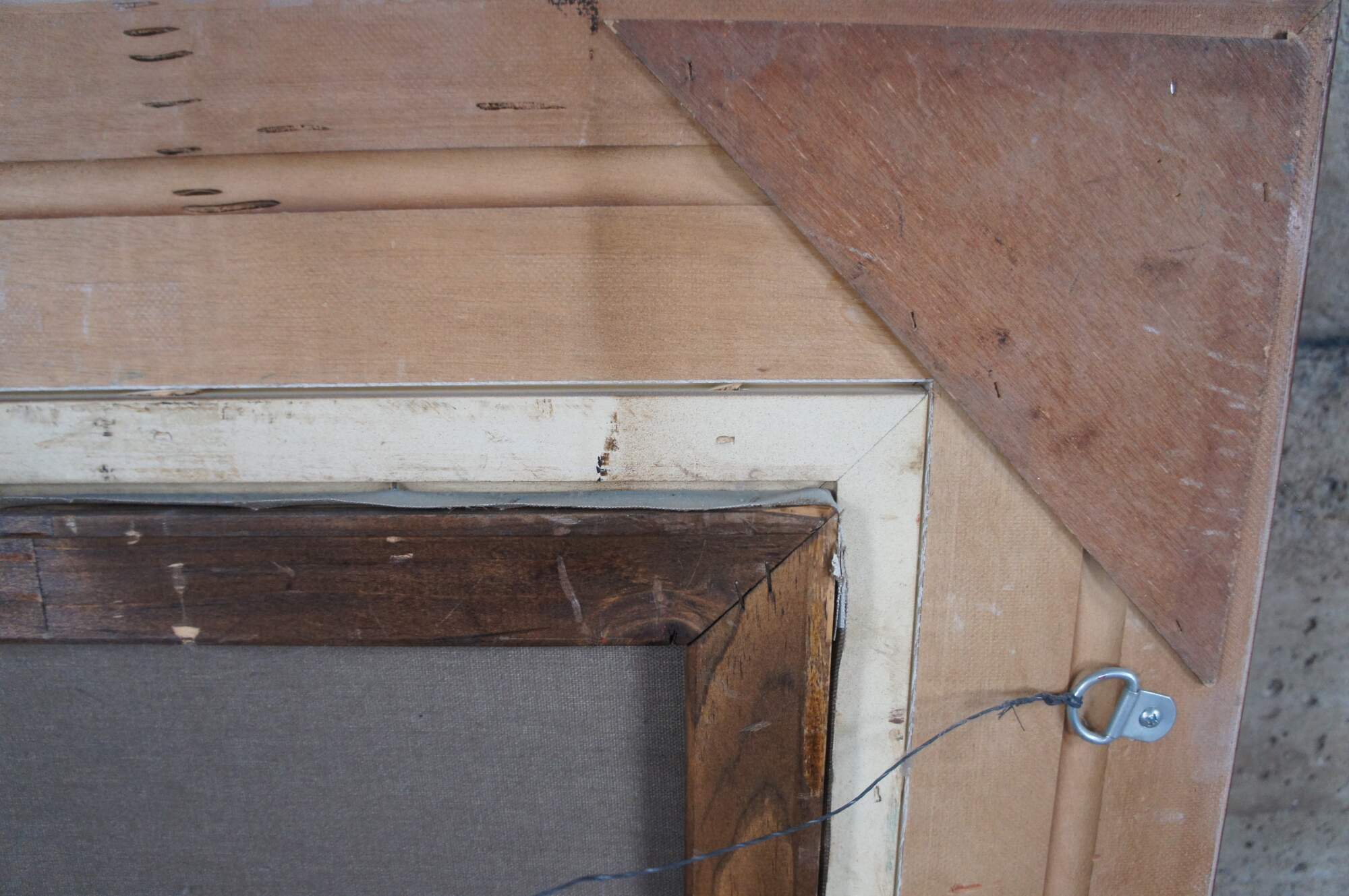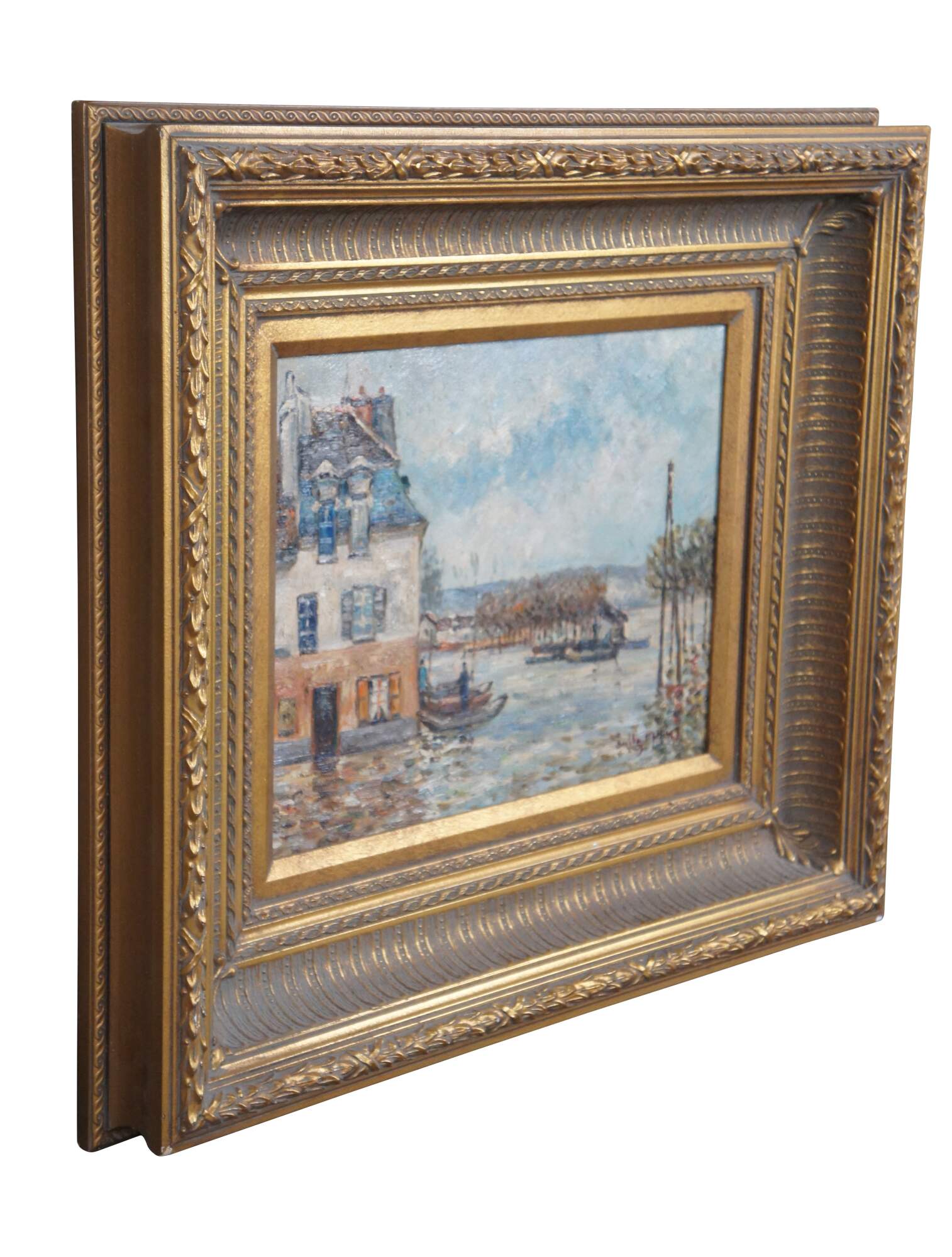 An original oil painting replicating the "Flood at Port-Marly" after Alfred Sisley. The painting is on canvas and signed lower right by an artist with the first name Sally. Framed in a neoclassical style wood frame with gold finish and ribboned gesso.