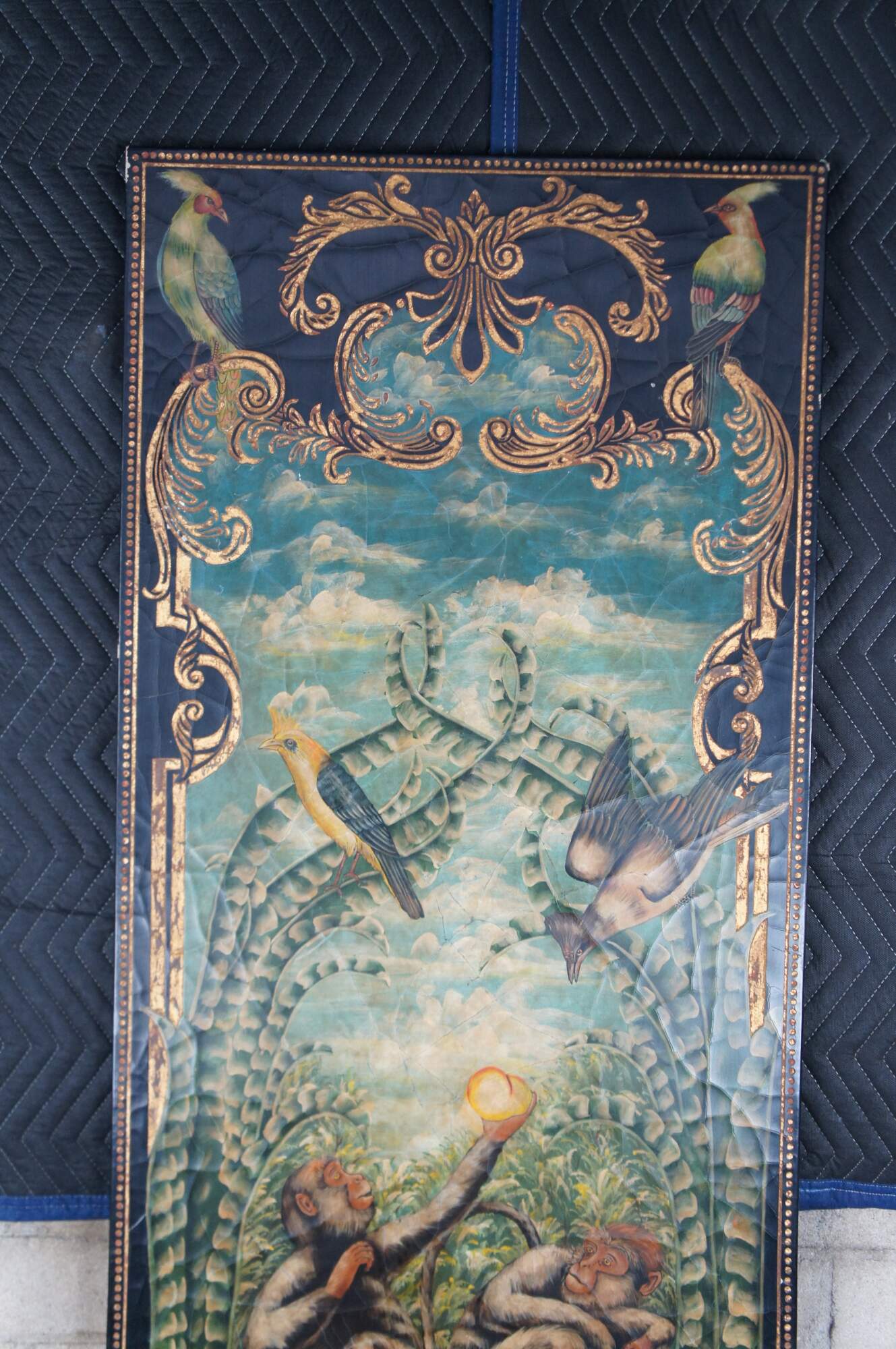 Hand painted Maitland Smith Coromandel wall panel. Features a crackled landscape with monkeys holding peaches in a tropical setting amongst birds. Set within a black and gold neoclassical border.