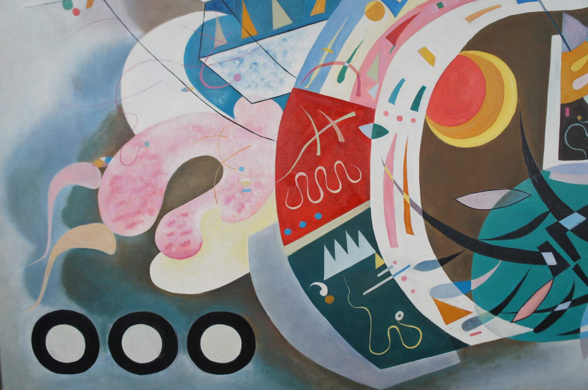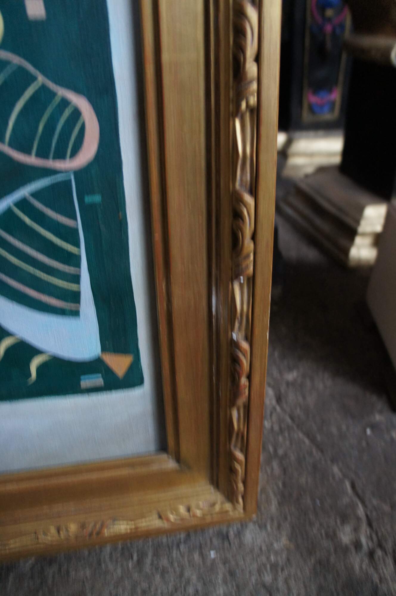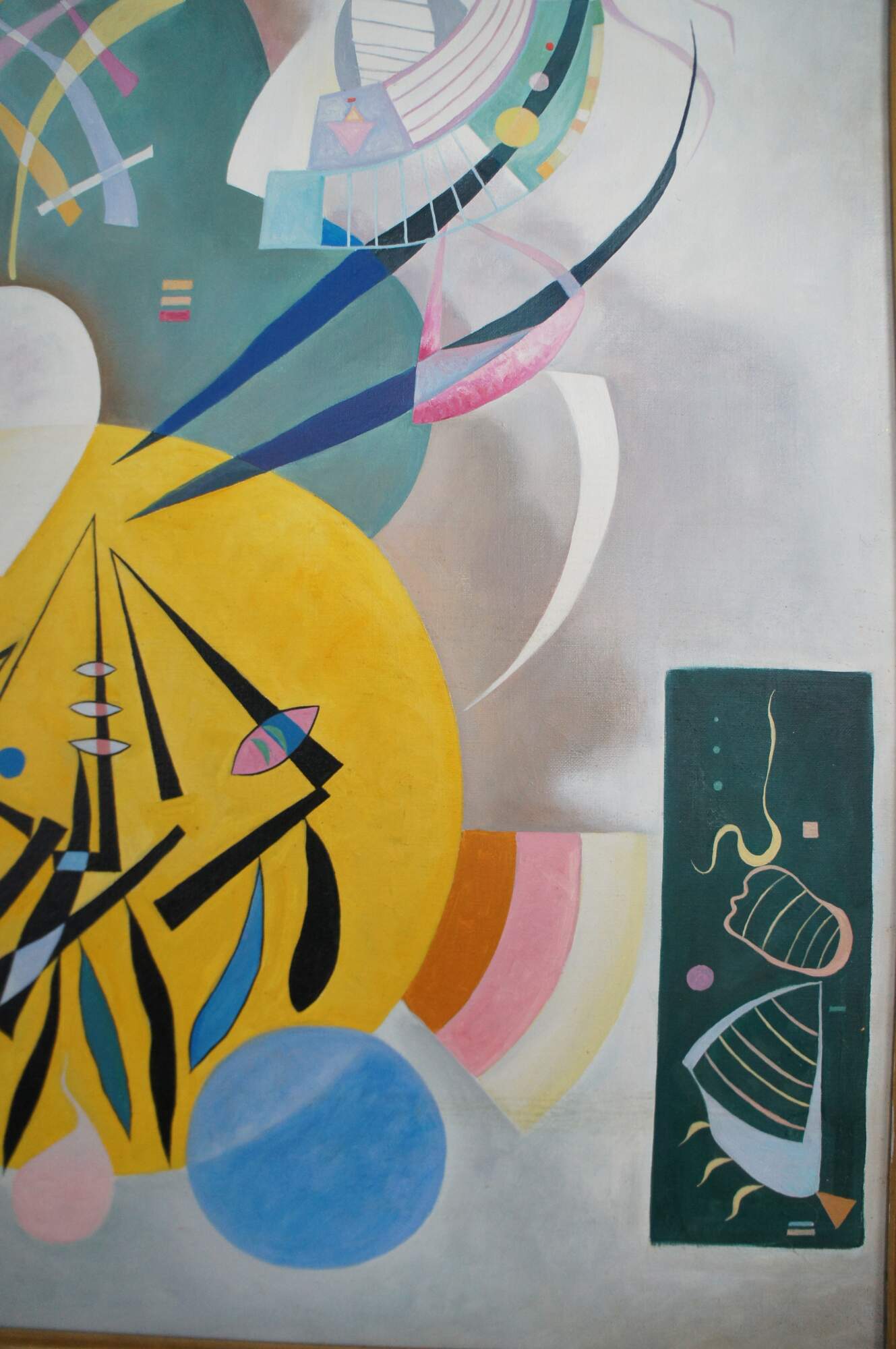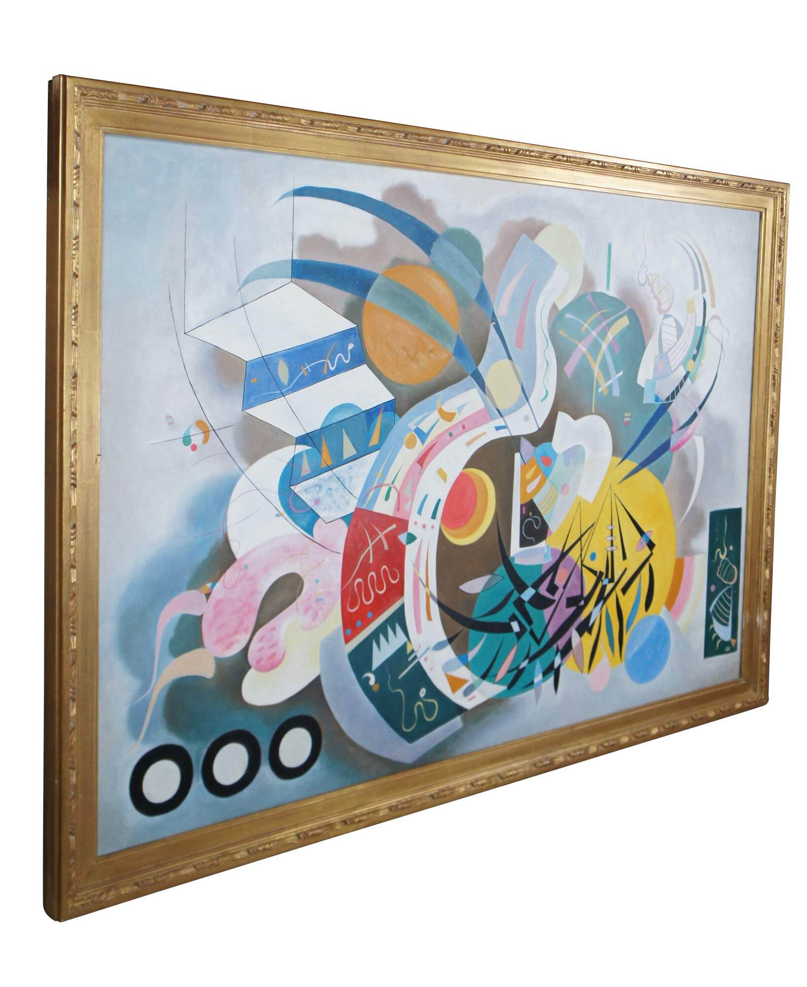 A large hand painted reproduction of Wassily Kandinsky's "Dominant Curve". The original Biomorphic abstraction was painted in 1936. The oil painting is on canvas and framed in gold.