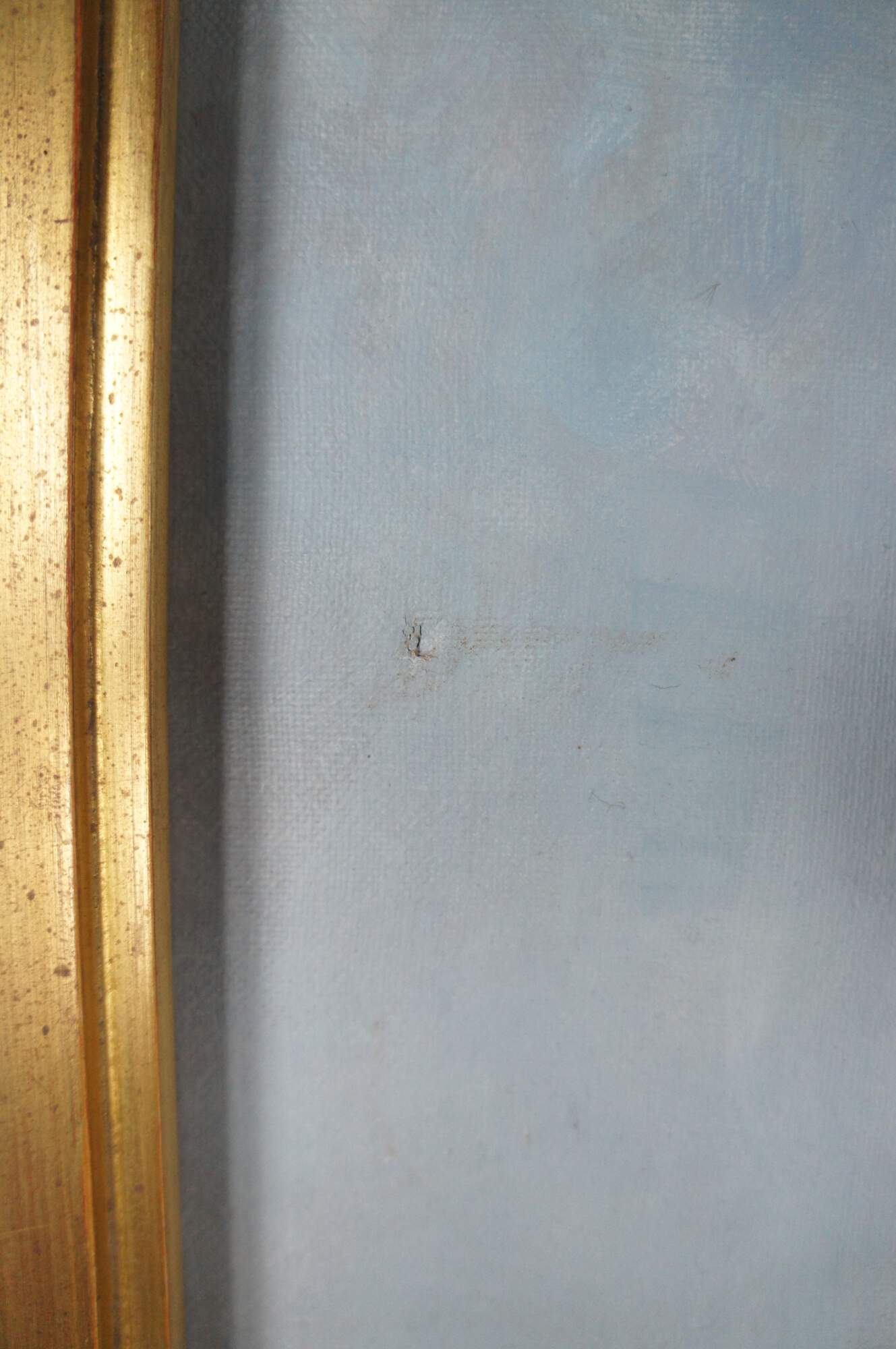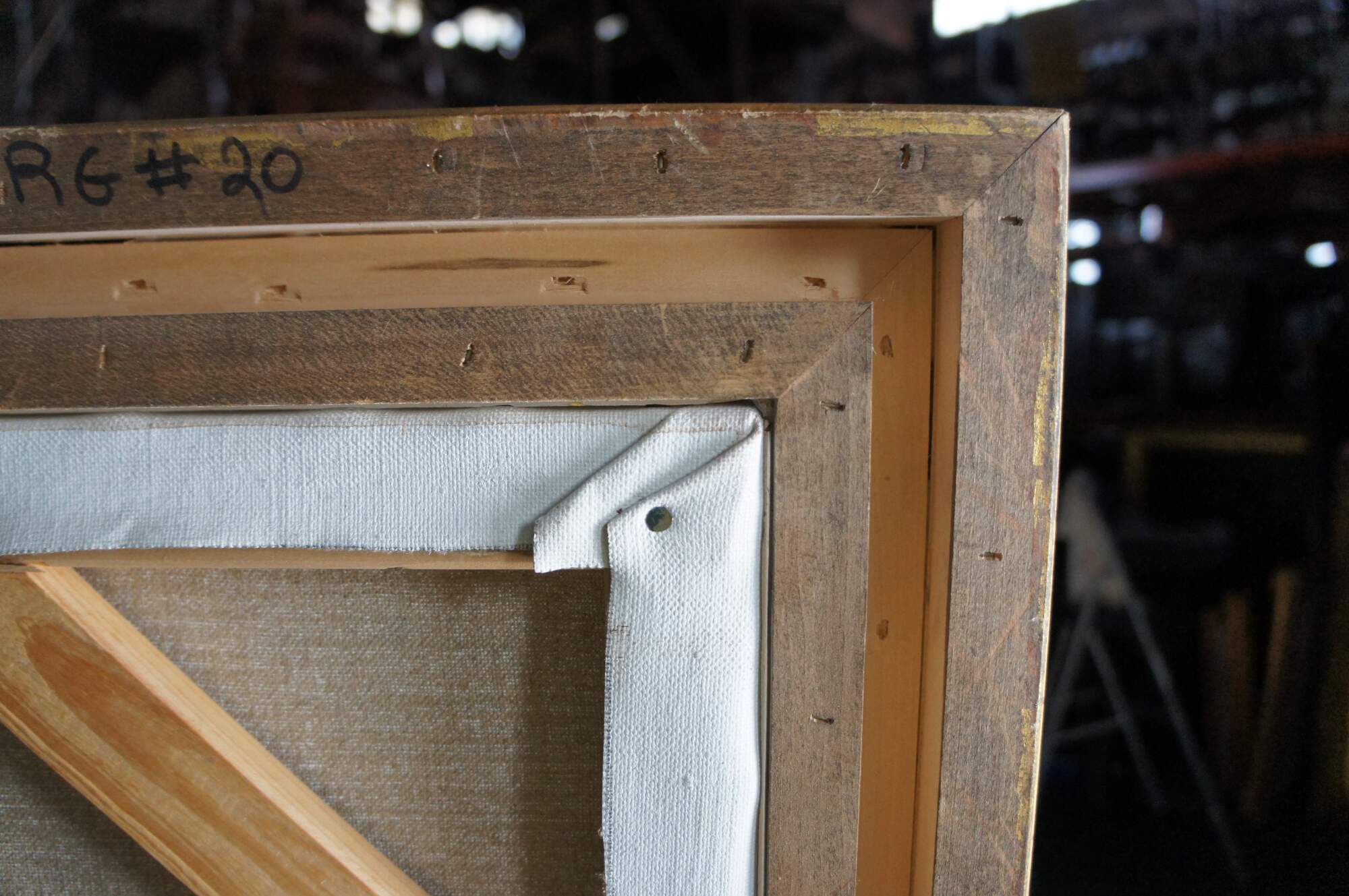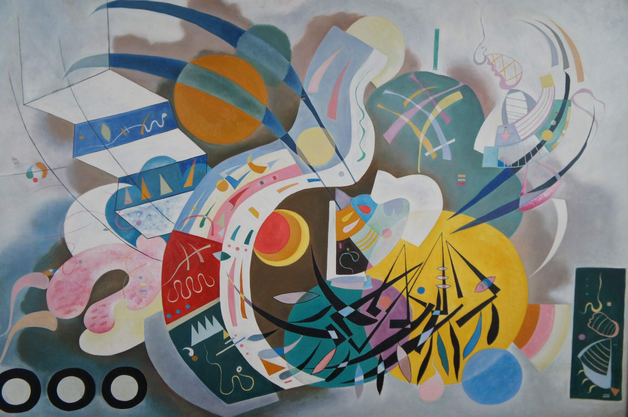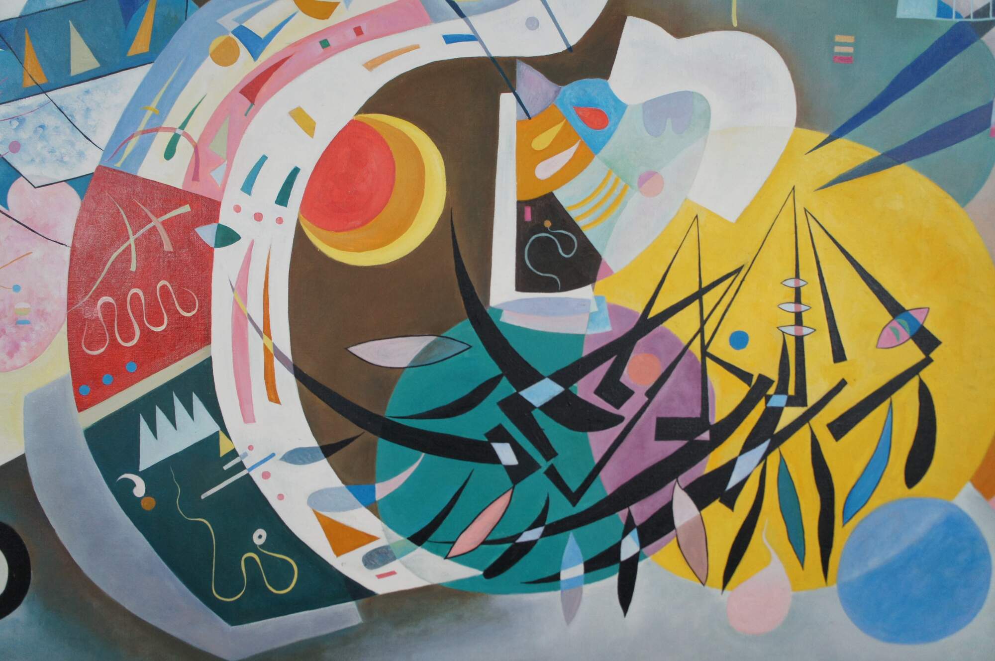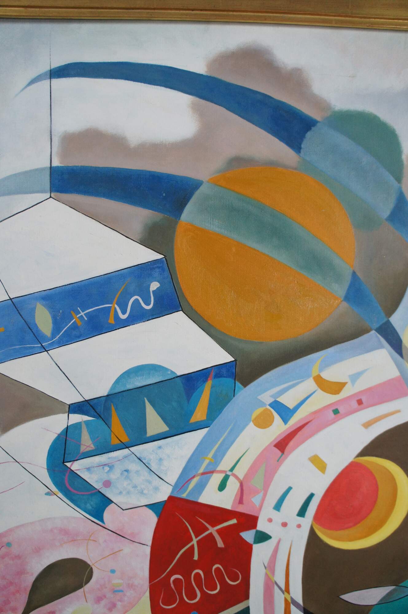 A large hand painted reproduction of Wassily Kandinsky's "Dominant Curve". The original Biomorphic abstraction was painted in 1936. The oil painting is on canvas and framed in gold.