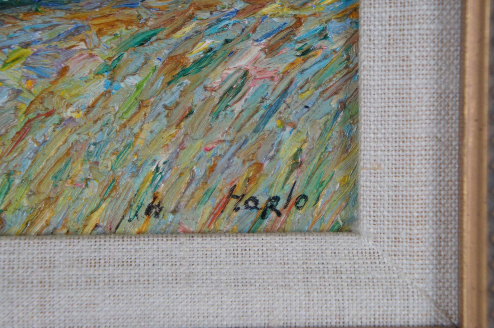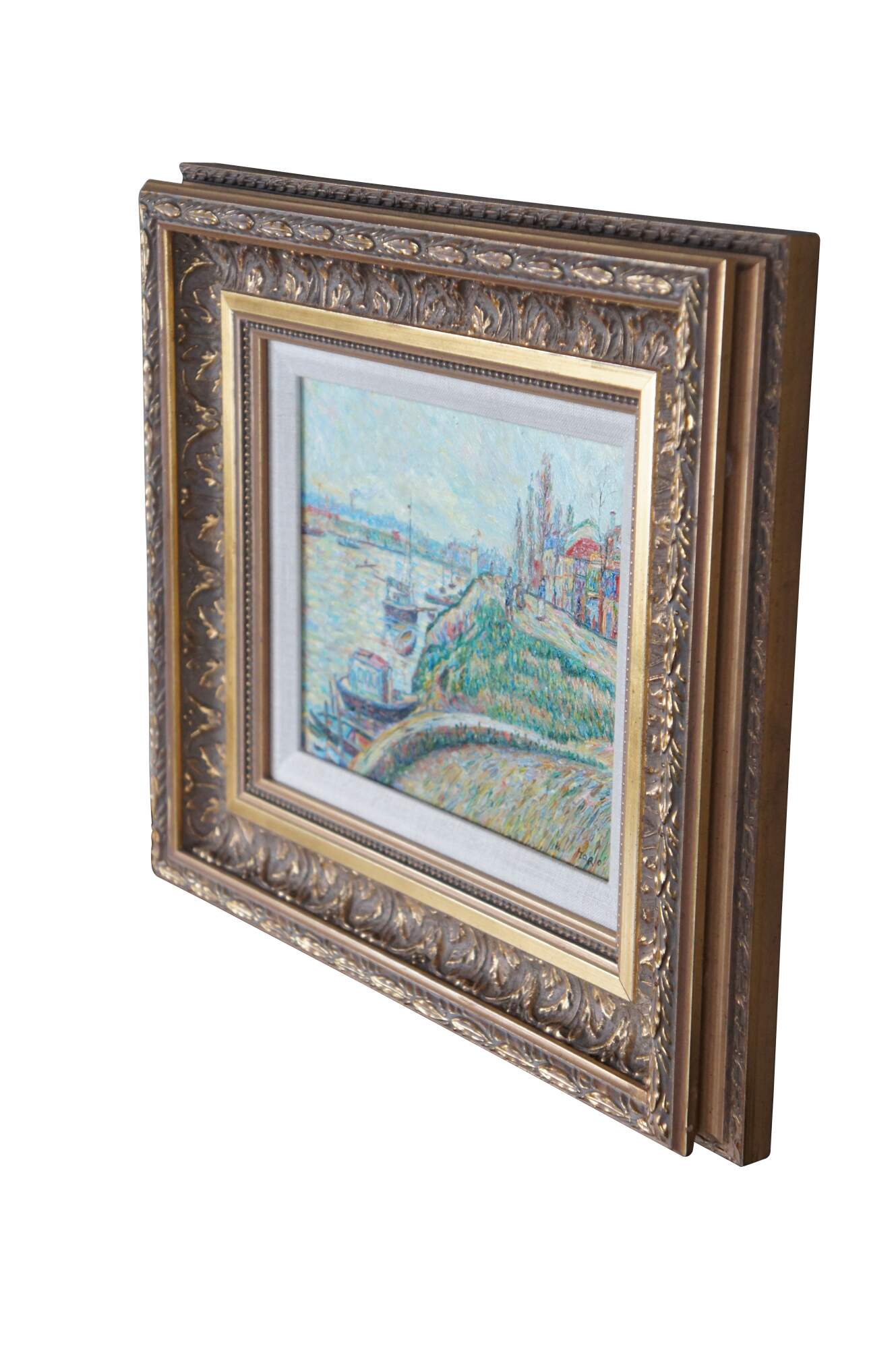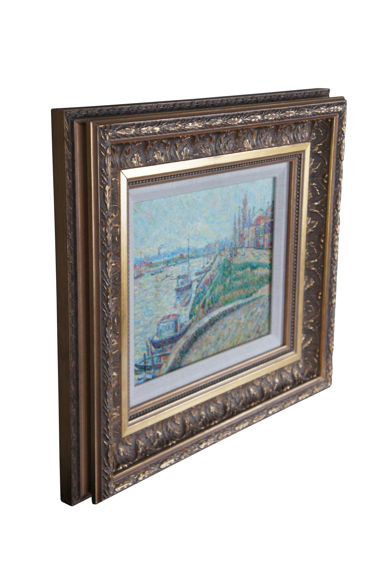 Colorful vintage Impressinoist canal landscape, Signed Harlo, second half 20th century. An oil on canvas with thick brush strokes showcasing a busy canal with boats, and figures by a walking path. The cityscape can be seen in the background. The canvas is framed in a French / Neoclassical style gold wooden frame with acanthus relief.