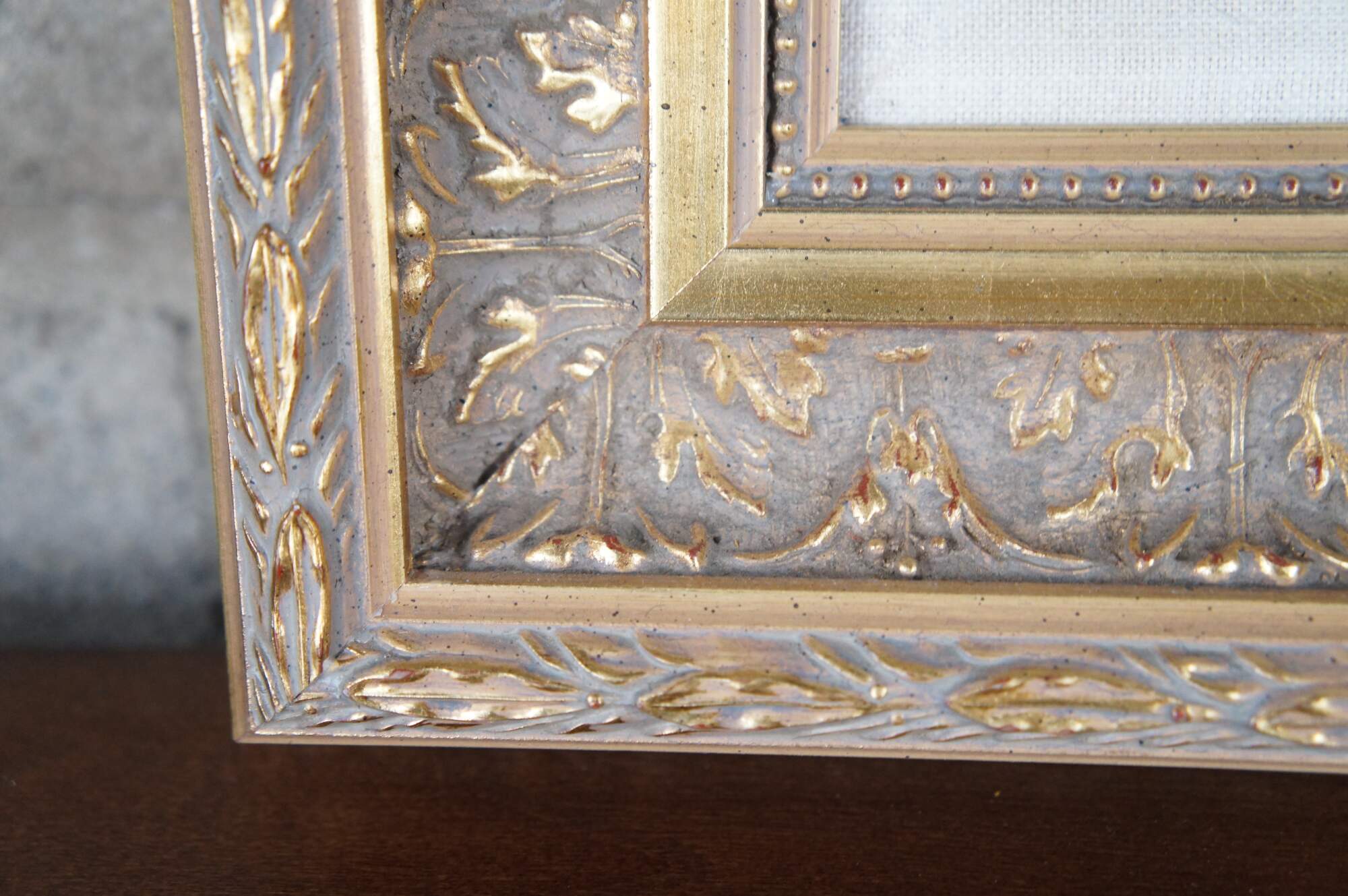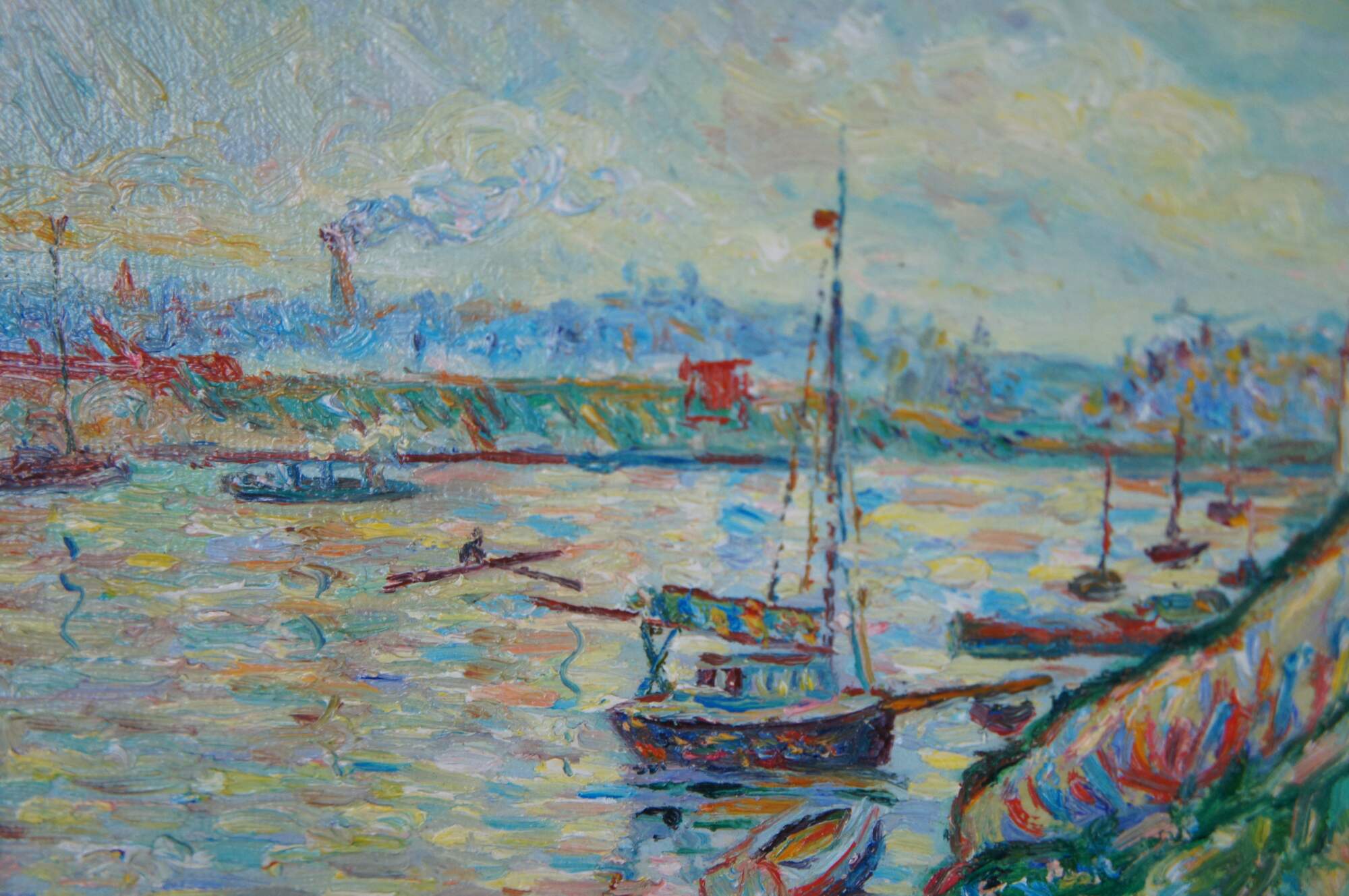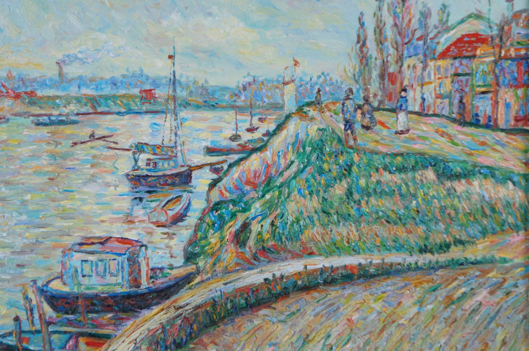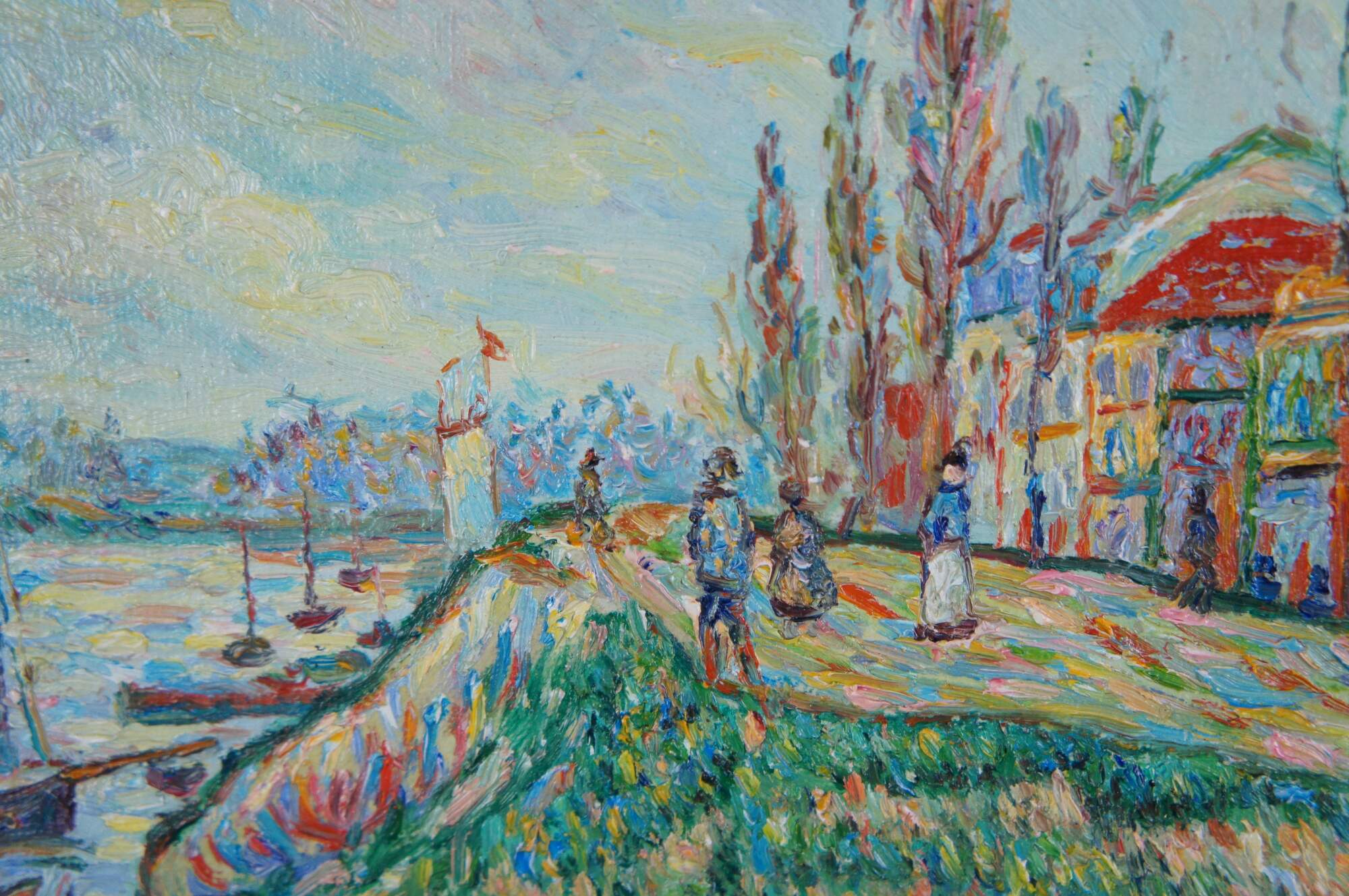 Colorful vintage Impressinoist canal landscape, Signed Harlo, second half 20th century. An oil on canvas with thick brush strokes showcasing a busy canal with boats, and figures by a walking path. The cityscape can be seen in the background. The canvas is framed in a French / Neoclassical style gold wooden frame with acanthus relief.