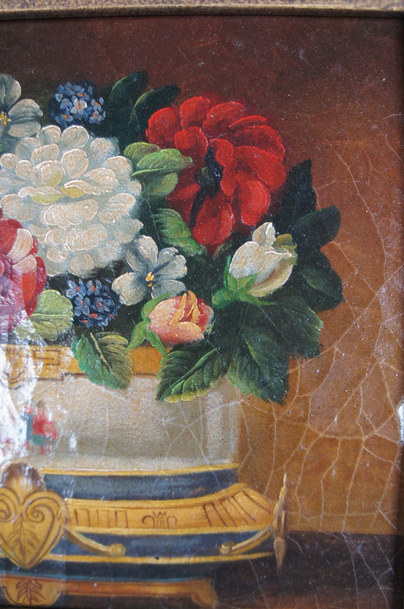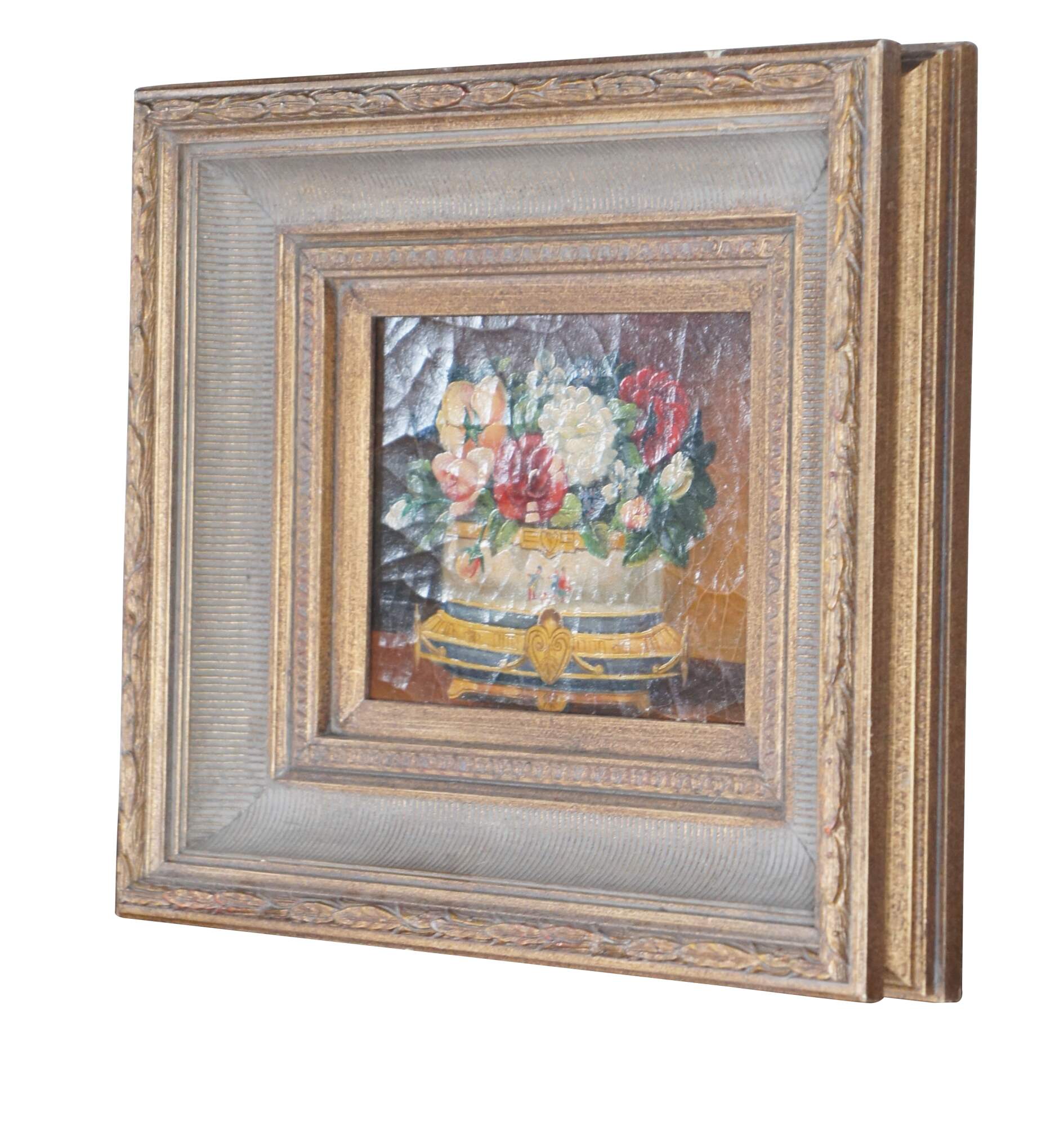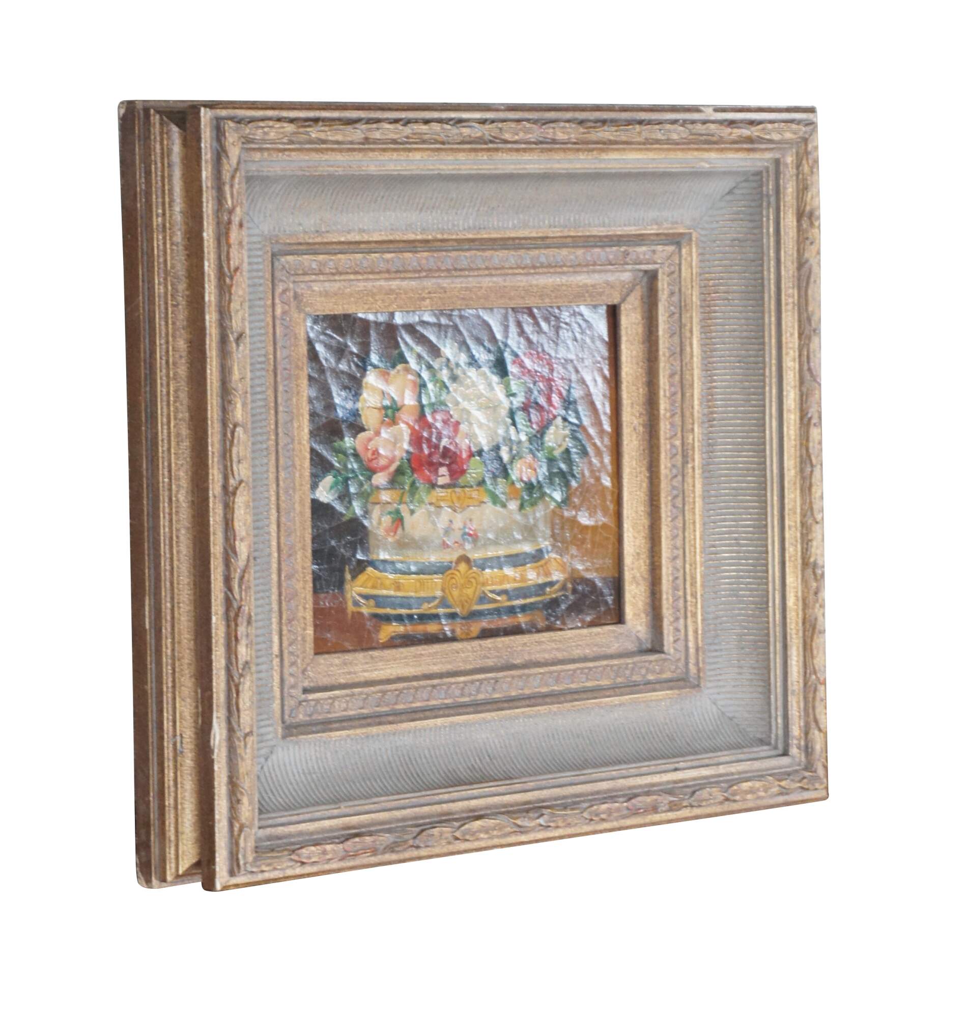 A Vintage Realist oil painting of a hand painted ormolu mounted Cache Pot full of flowers, circa second half 20th century. The oil is on canvas and is framed in pine with a gold finish.