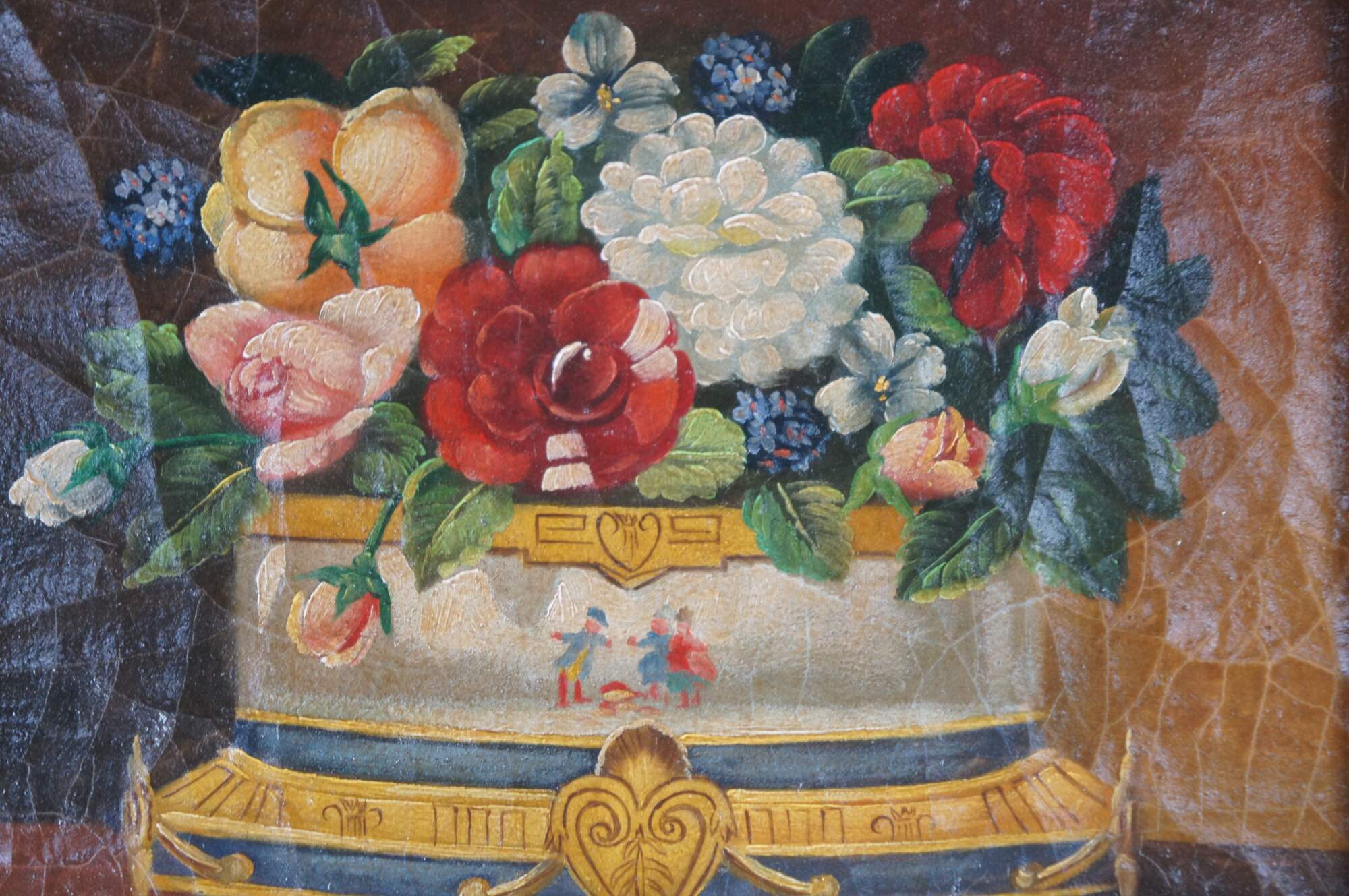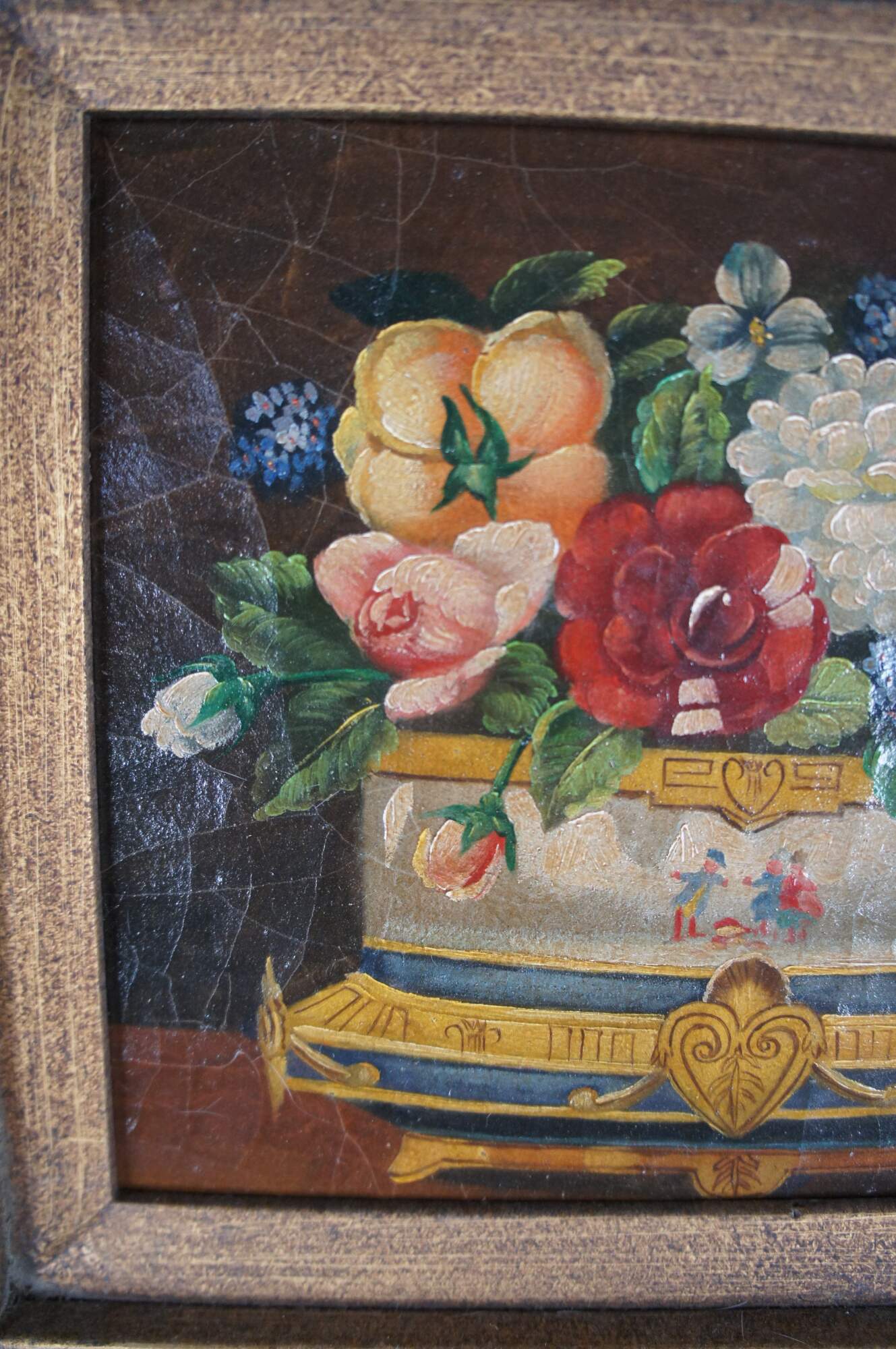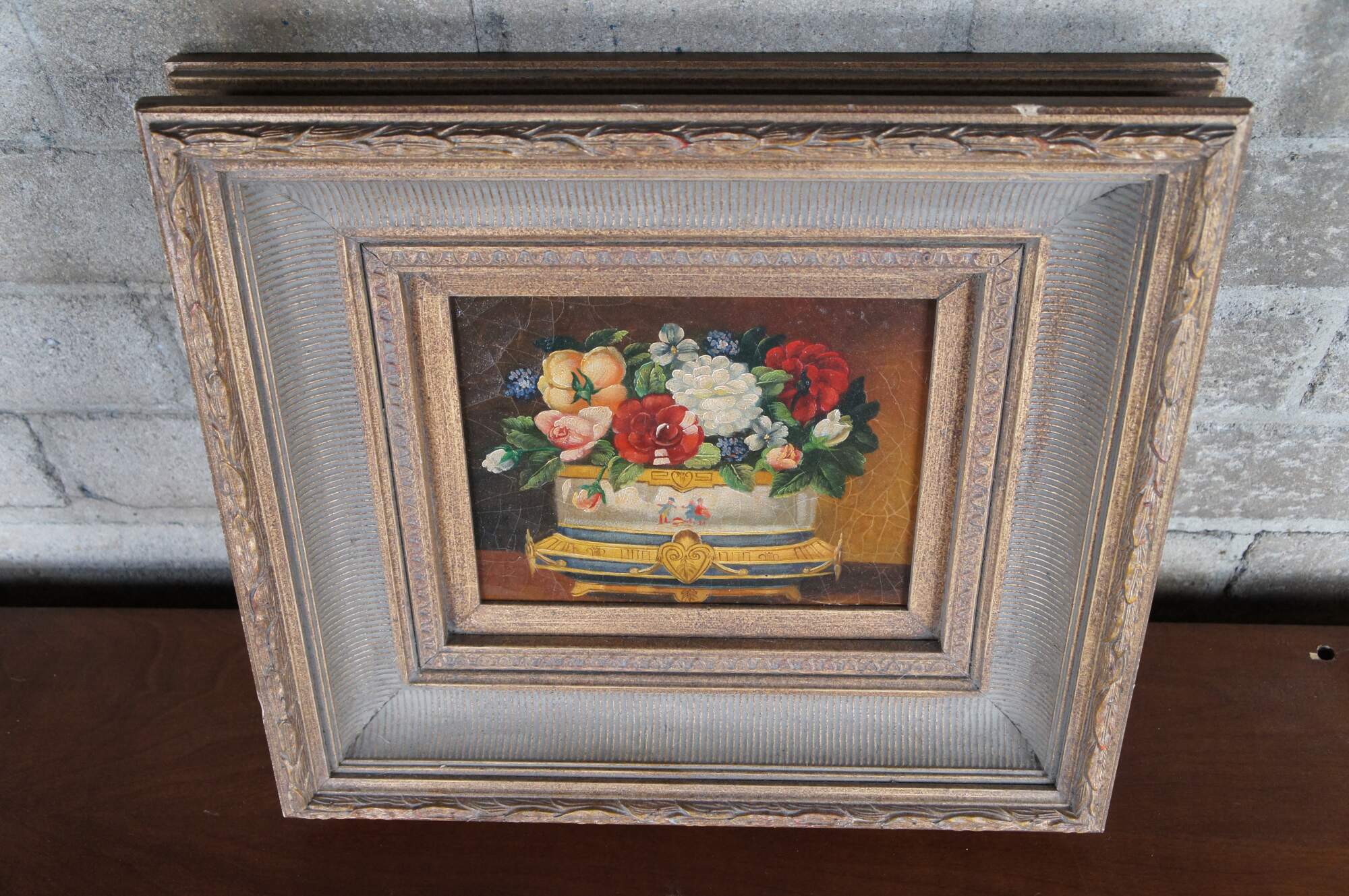 A Vintage Realist oil painting of a hand painted ormolu mounted Cache Pot full of flowers, circa second half 20th century. The oil is on canvas and is framed in pine with a gold finish.