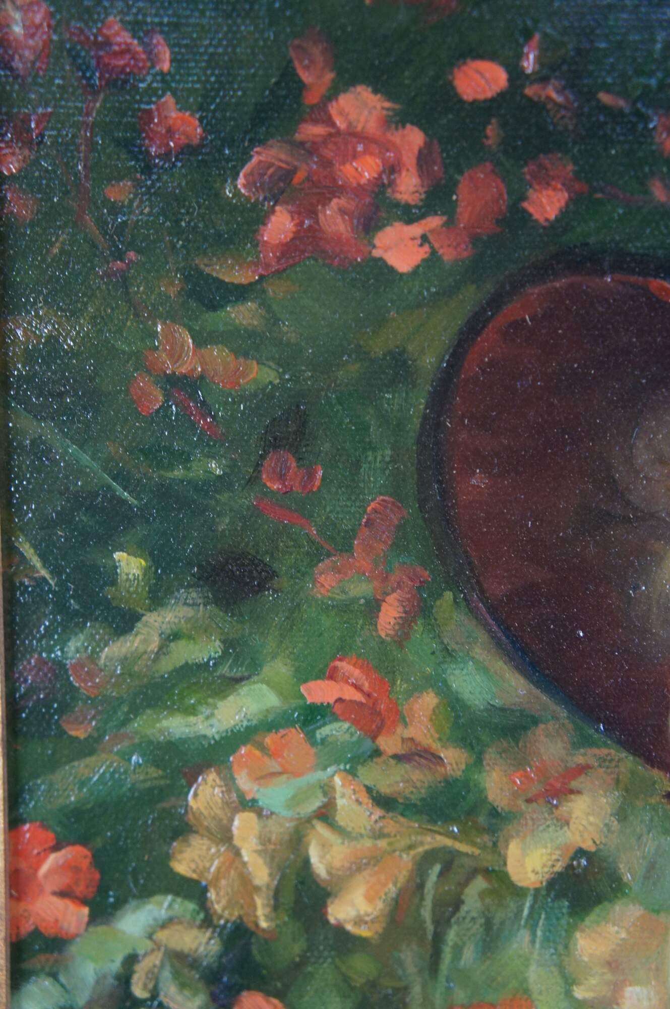 A beautiful late 20th Century Oil Painting of Mrs Kathleen Newton, after James Tissot. Signed lower left by Kurt Vaughn. The oil painting elegantly displays the French Aristrocrat dressed in red in front of flowers resting her hand against her chin. Framed in wood with gold finish in Baroque manner.