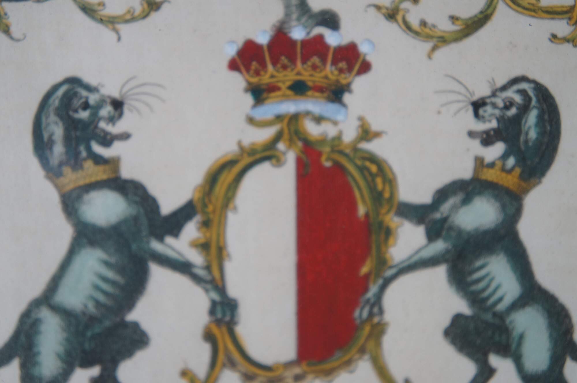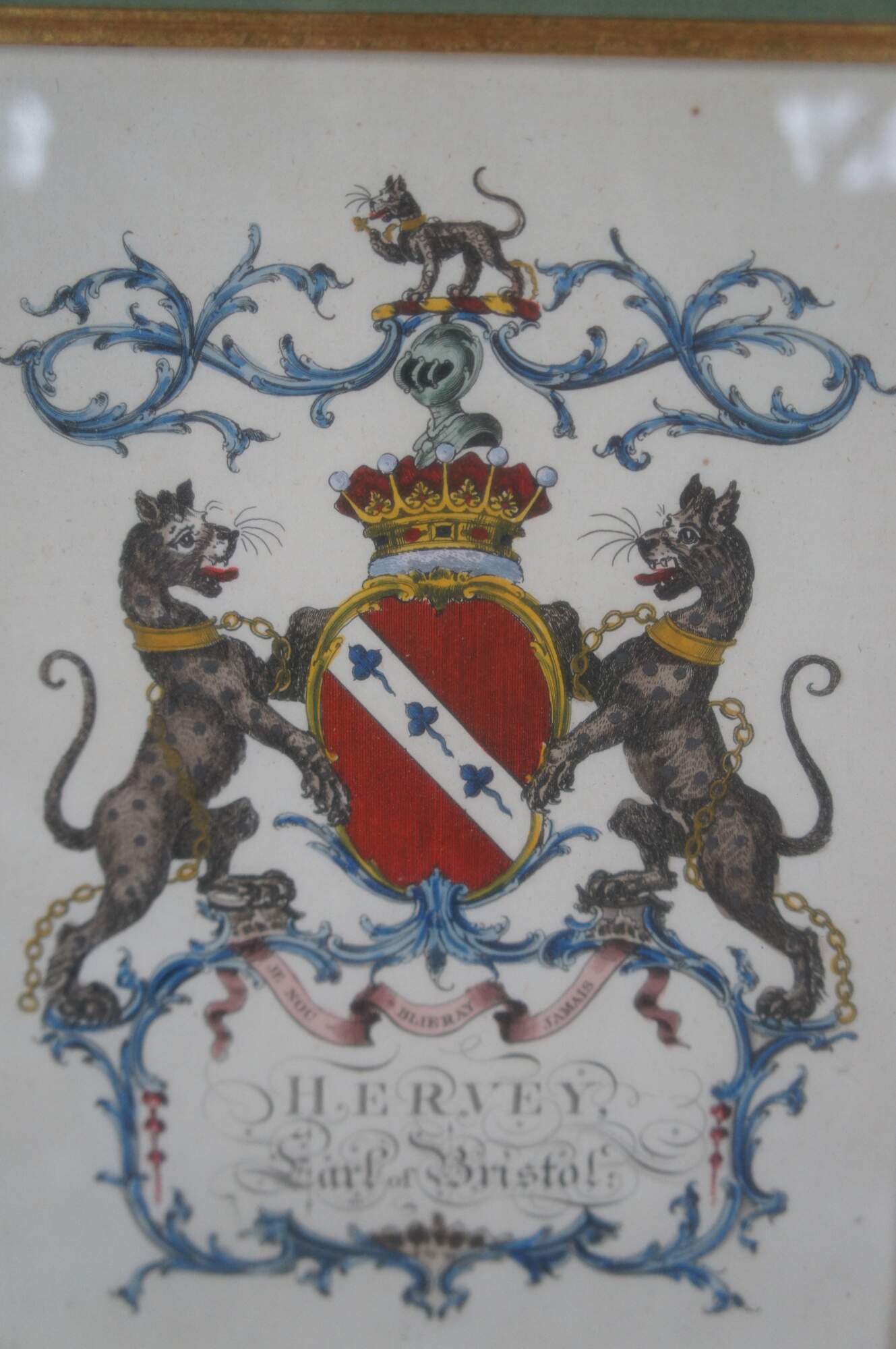 Set of three Armorial Colored Engravings. Each showcases a different family crest / coat of Arms. Features Harley Earl of Oxford, Wal of Waldegrave Earl of Waldegrave and Hervey Earl of Bristol. Each engraving is ornately framed with a Green Mat and Gold Finish.