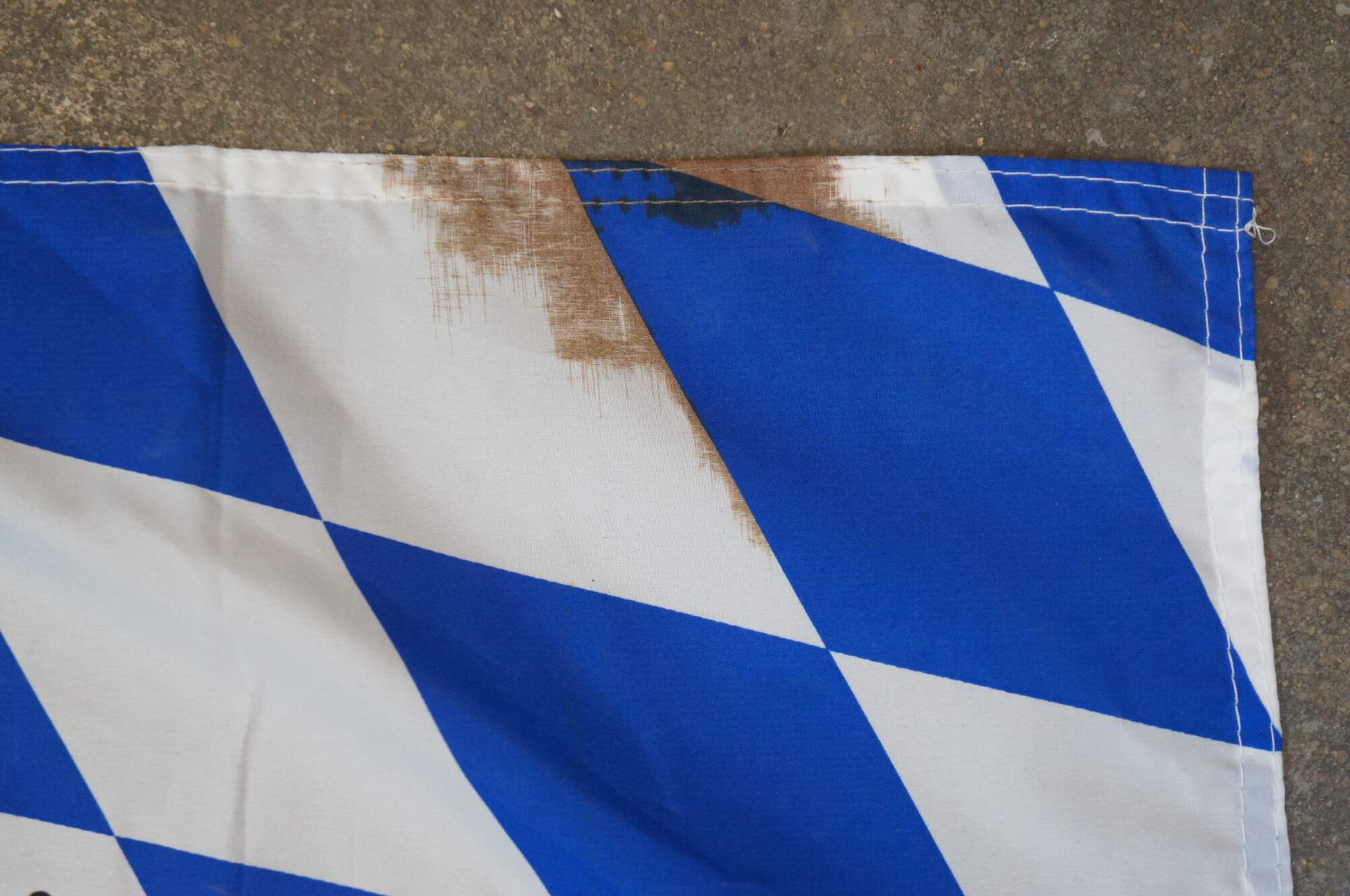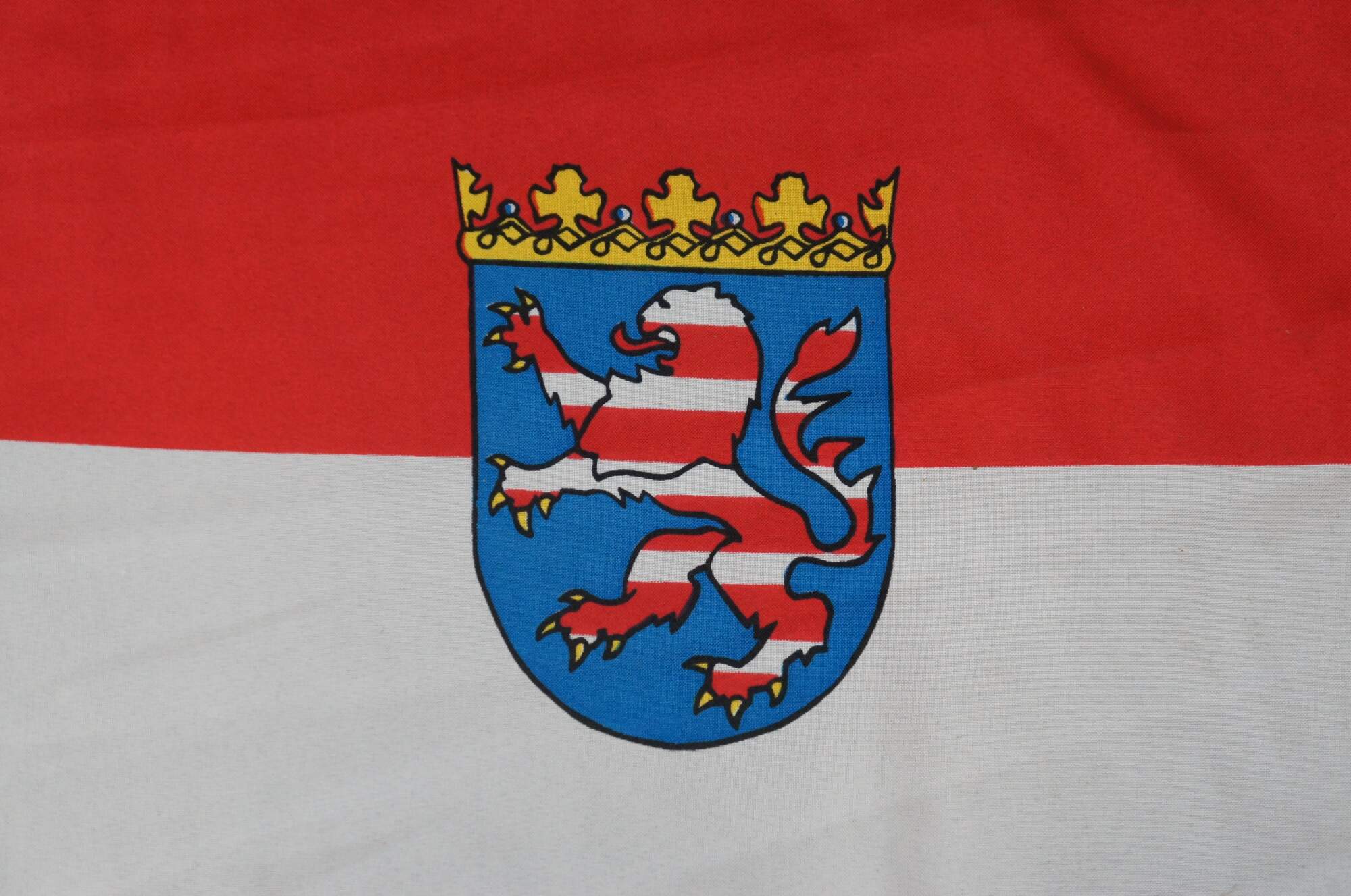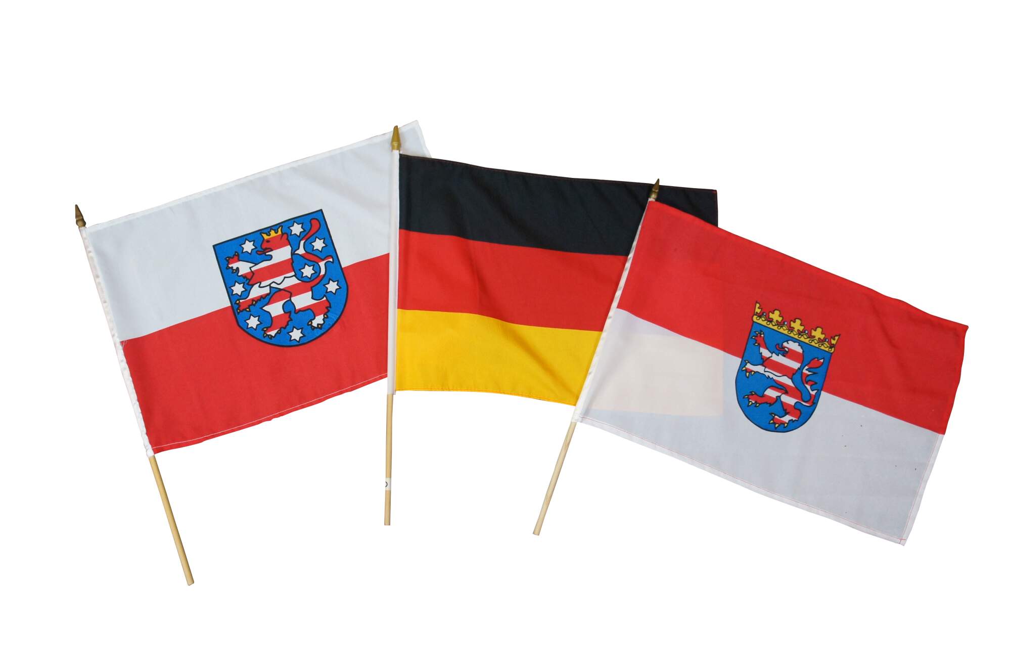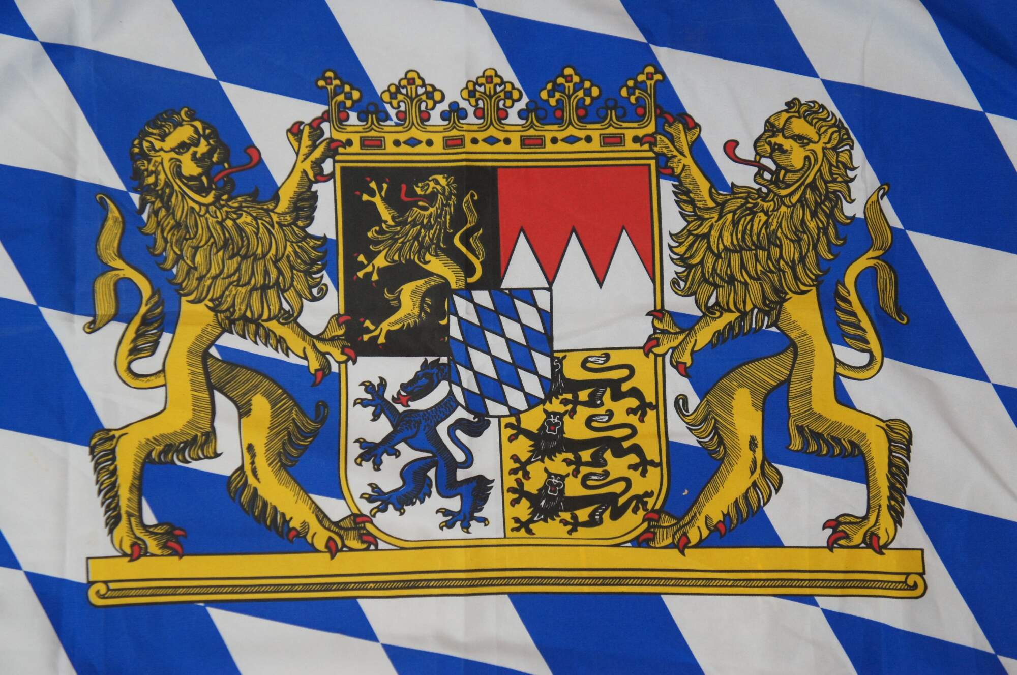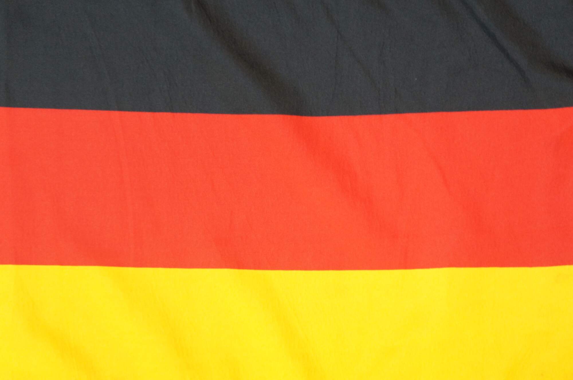 Lot of four late 20th century polyester German state flags including Bavaria (marked copyright by Christopher), Thuringia, Hessen, and Germany as a whole. The three smaller flags include sticks.