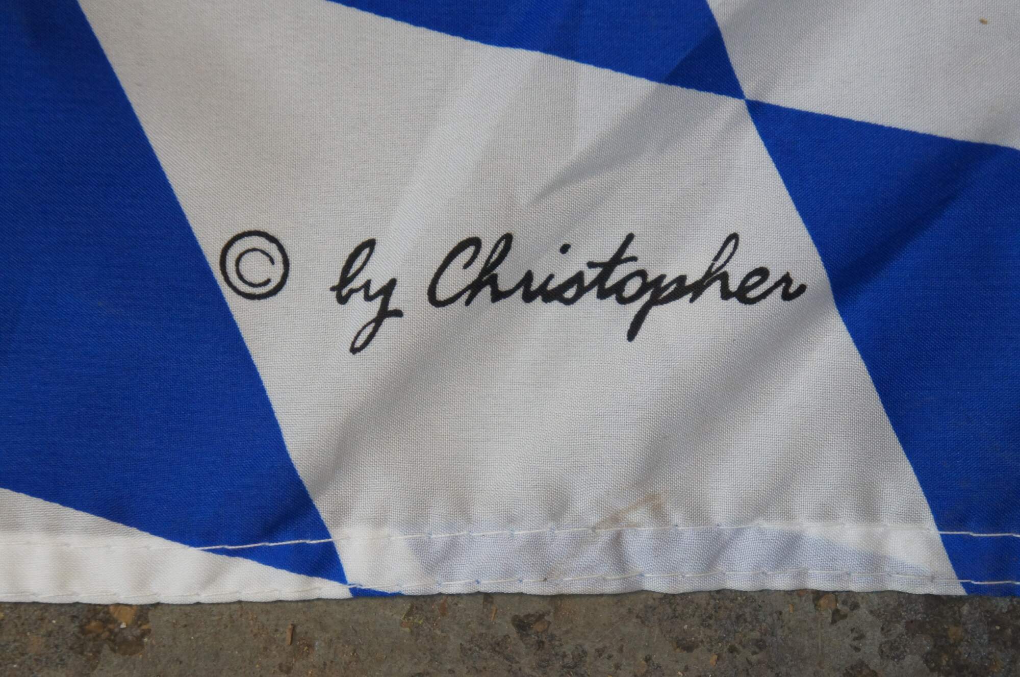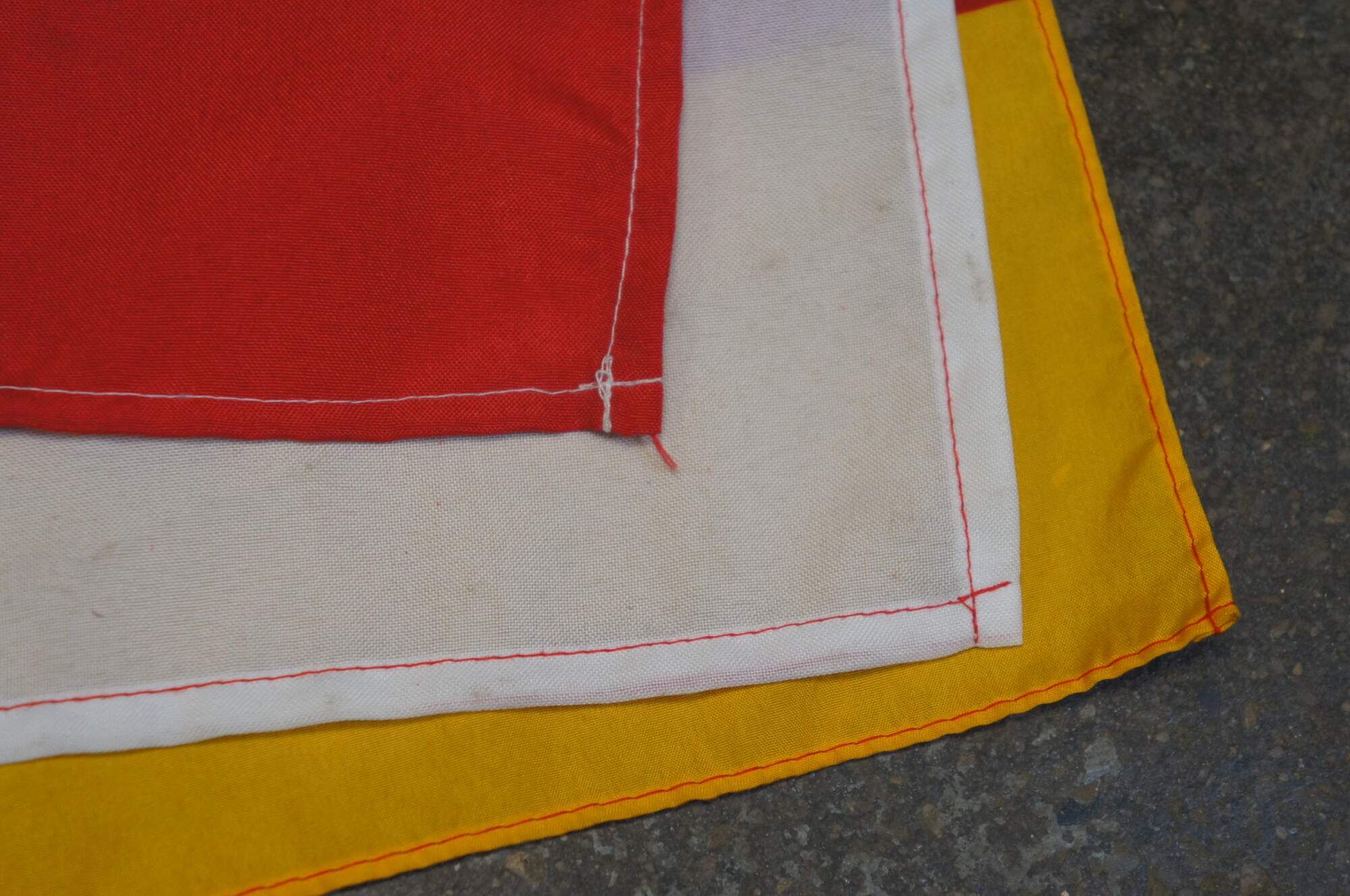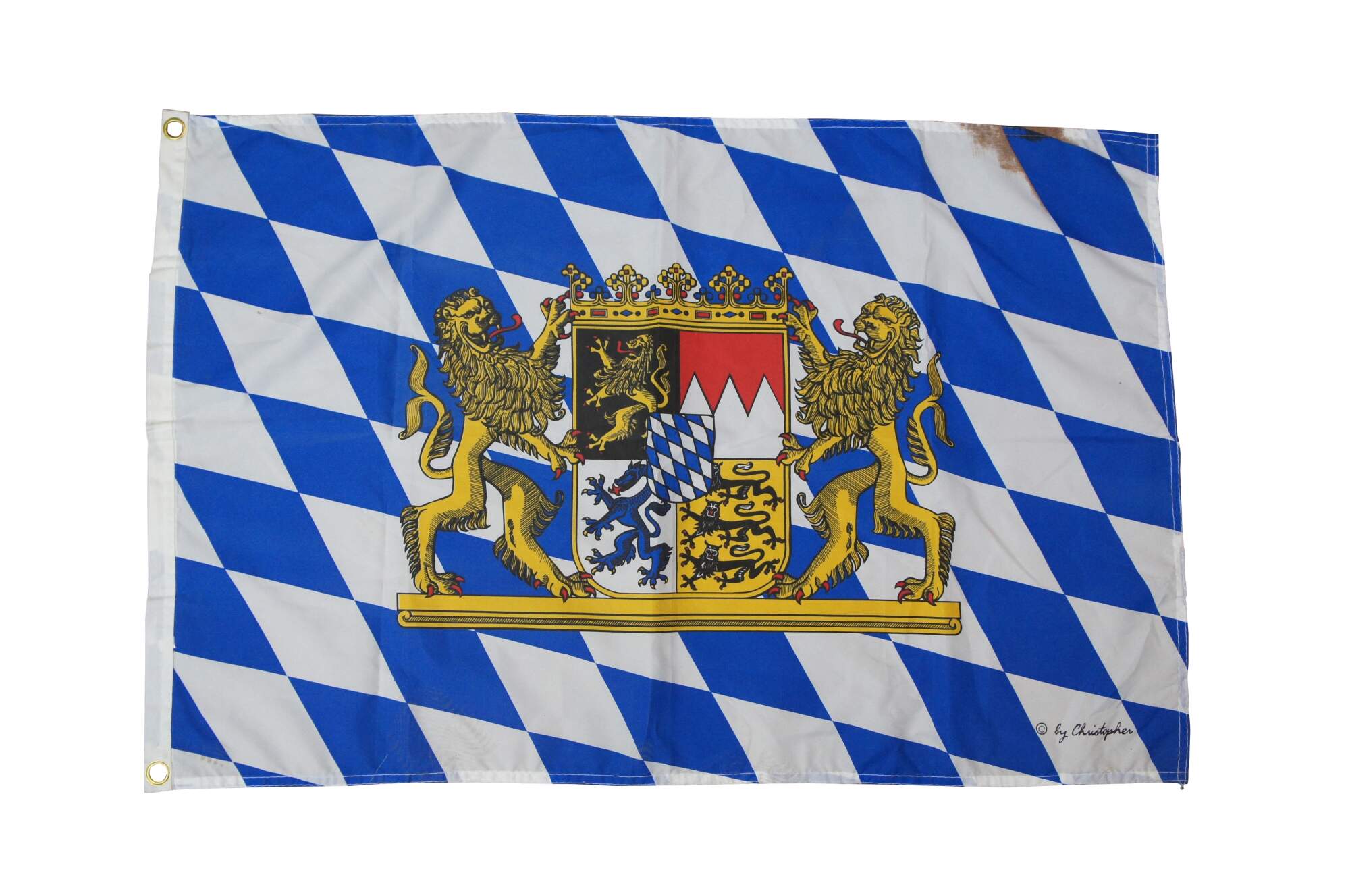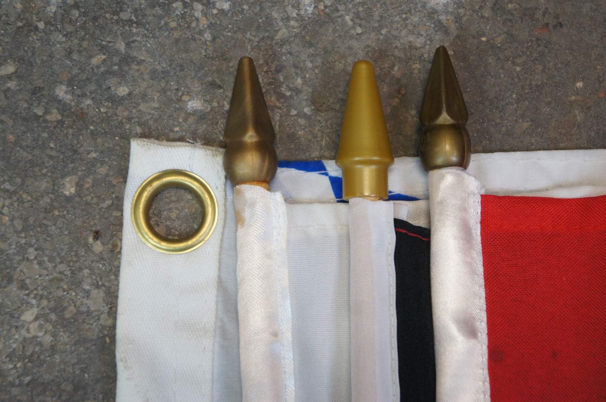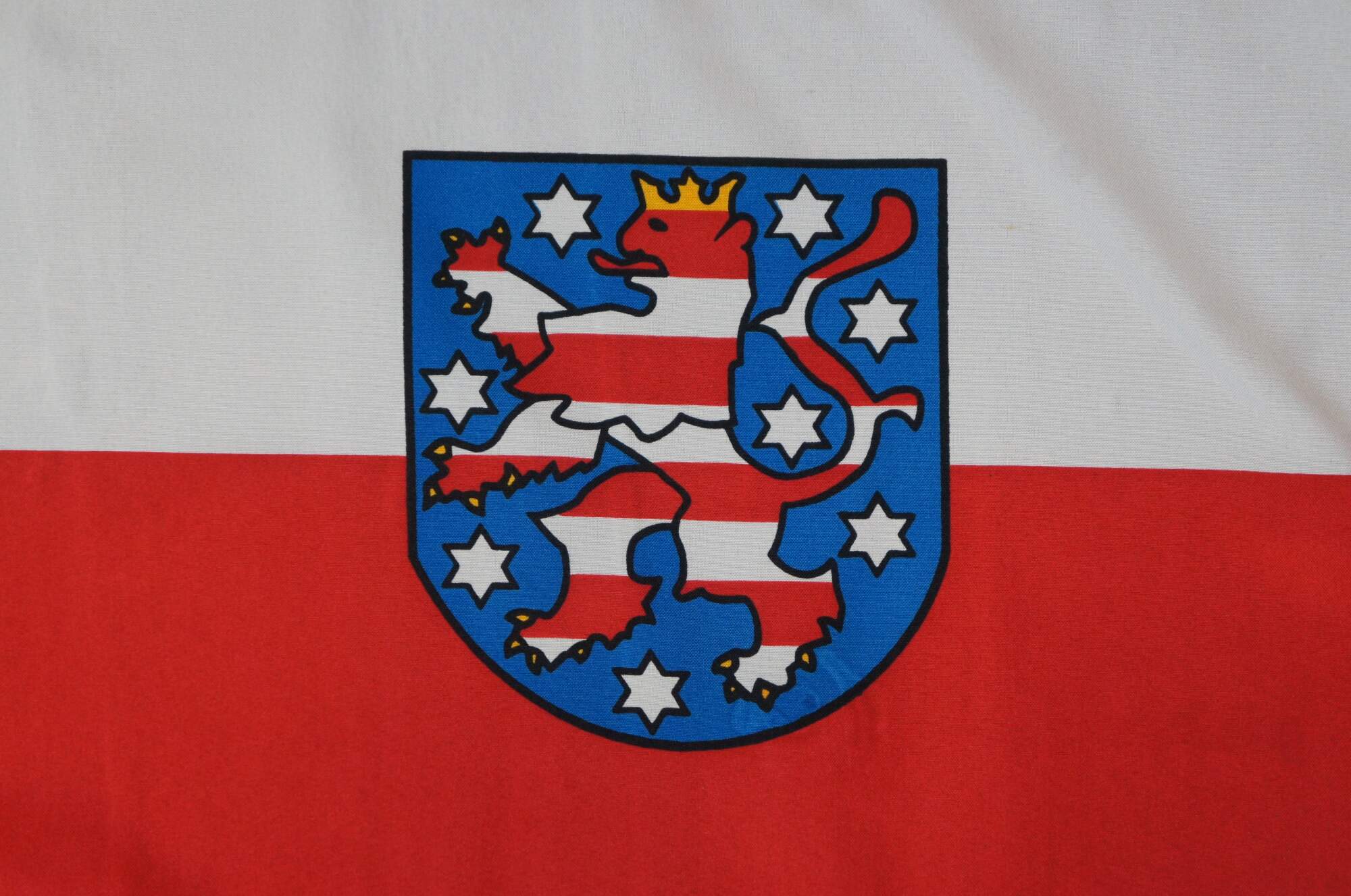 Lot of four late 20th century polyester German state flags including Bavaria (marked copyright by Christopher), Thuringia, Hessen, and Germany as a whole. The three smaller flags include sticks.
