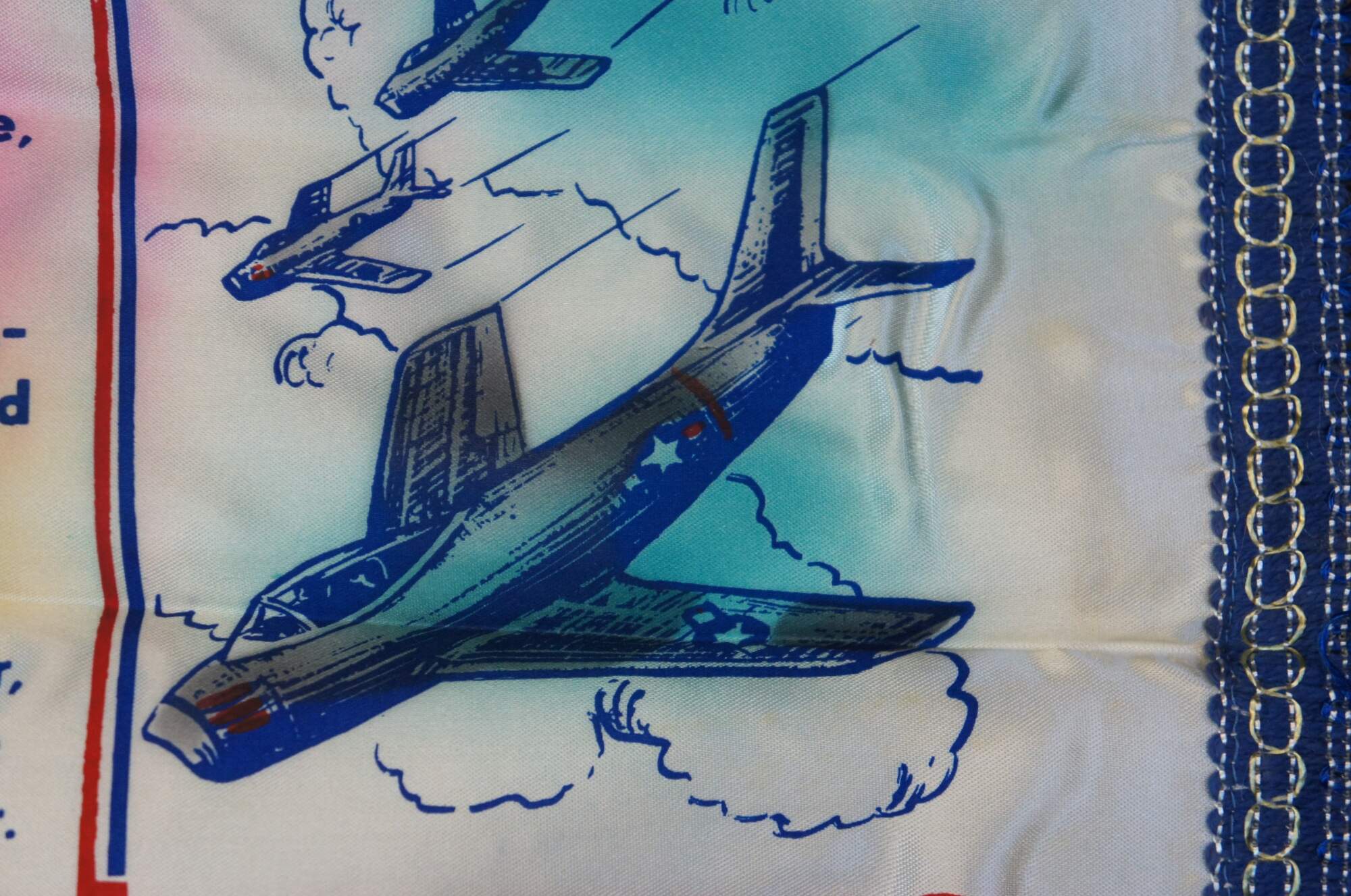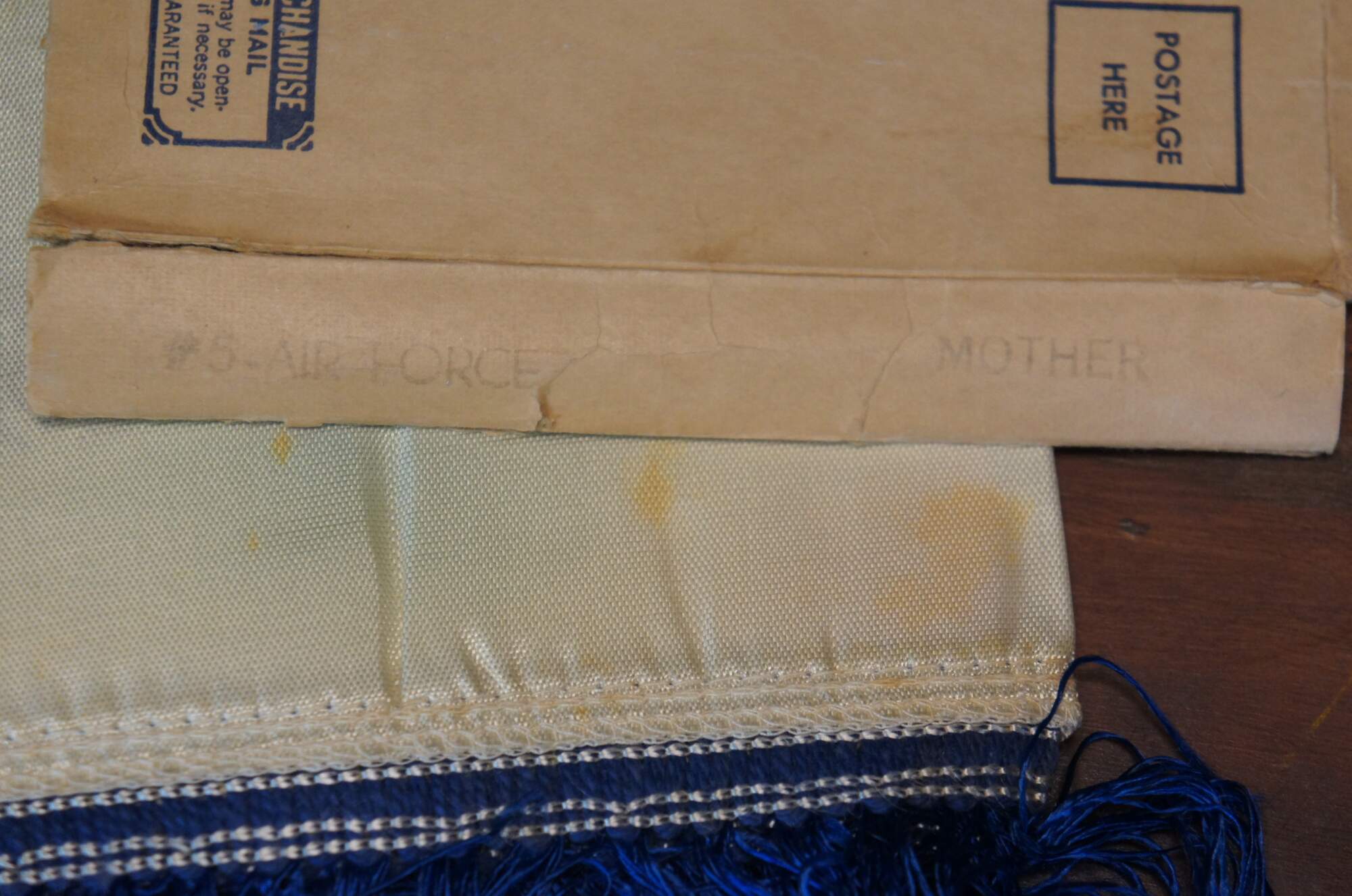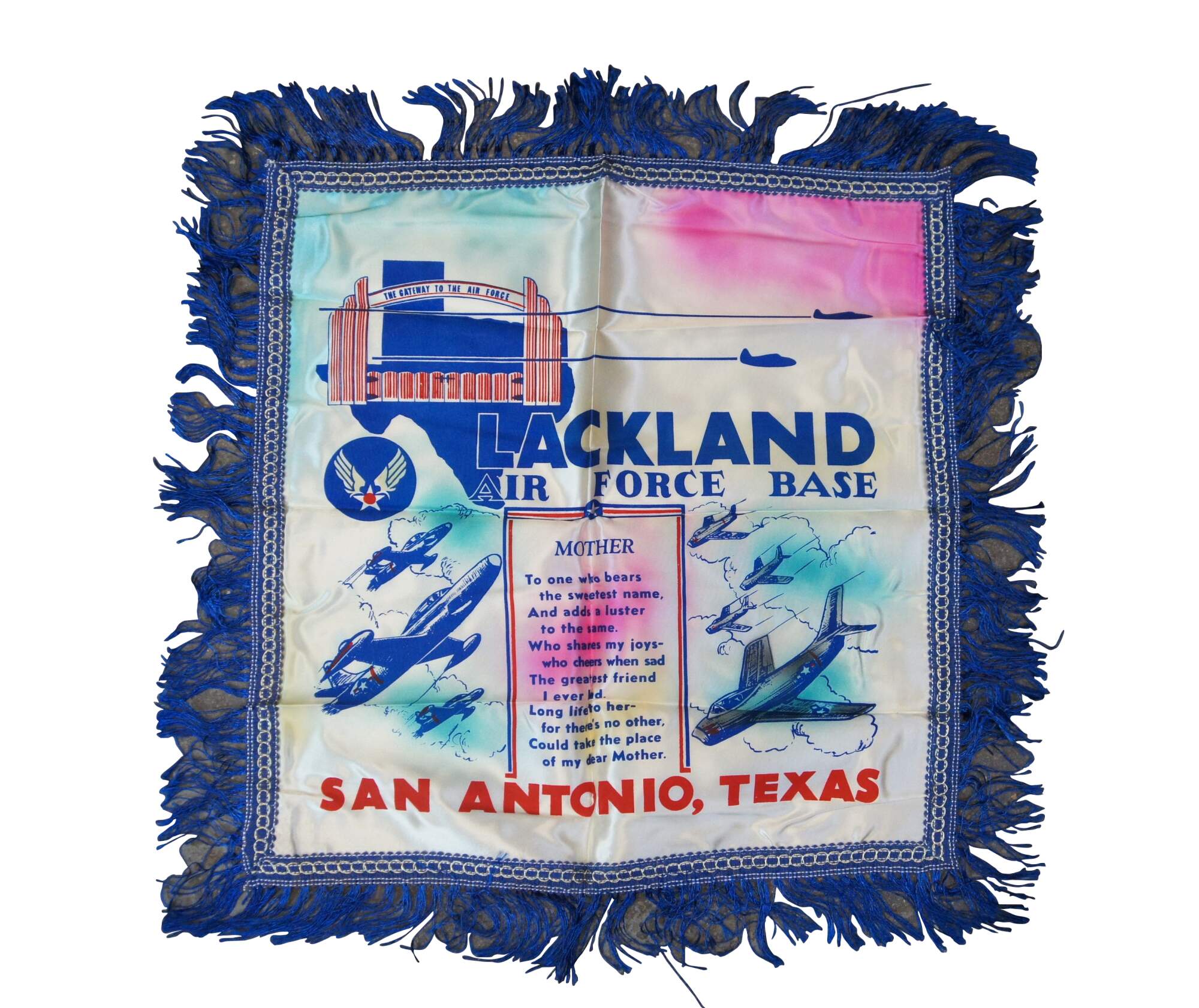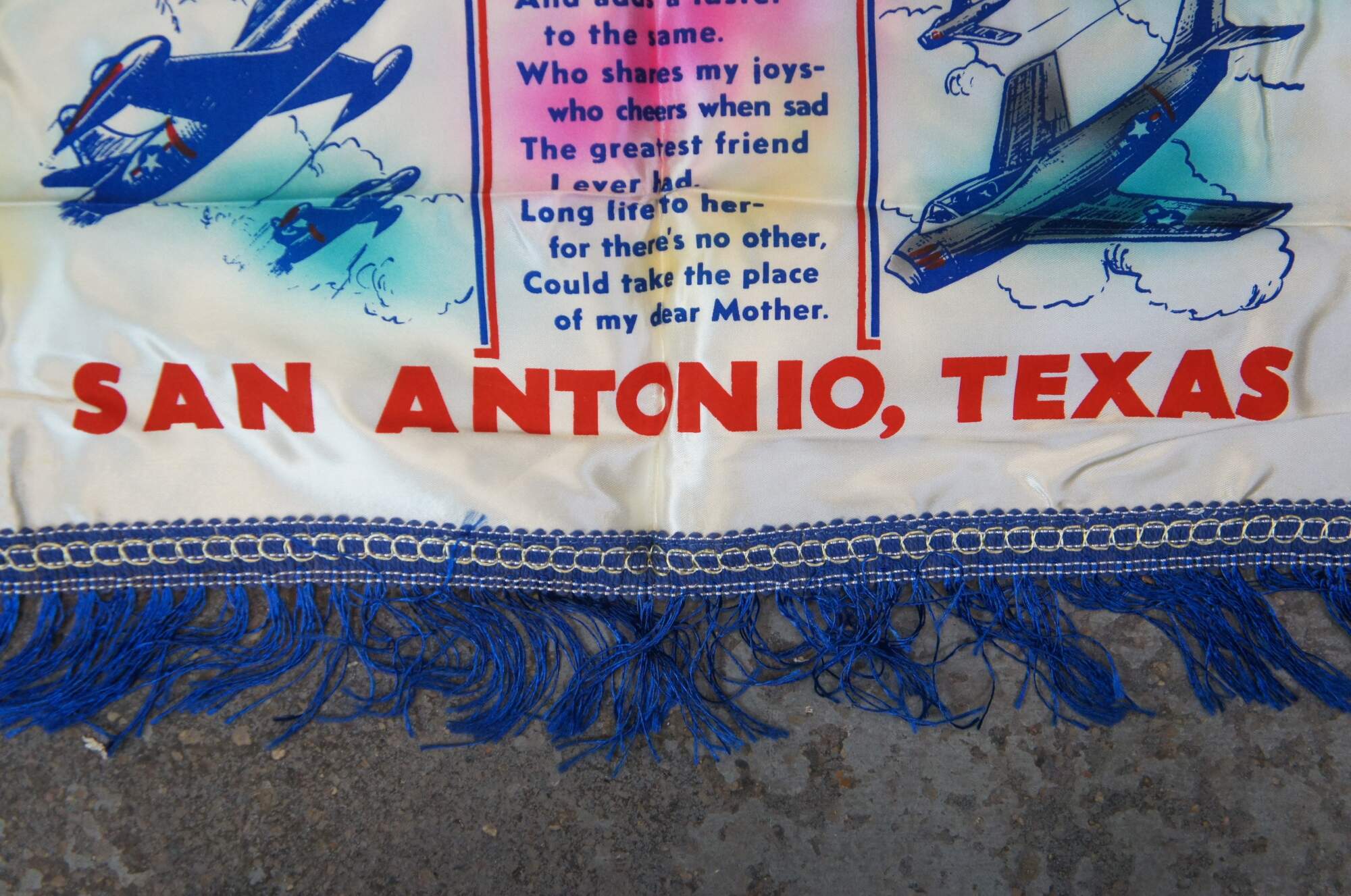Mid 20th century silky pillow case / cover / sham from Lackland Air Force Army Base in San Antonio, Texas, featuring a poem dedicated to Mothers. Blue and white printed square shape with watercolor accents and braided / fringe trim. Includes original, unused carboard mailing box.