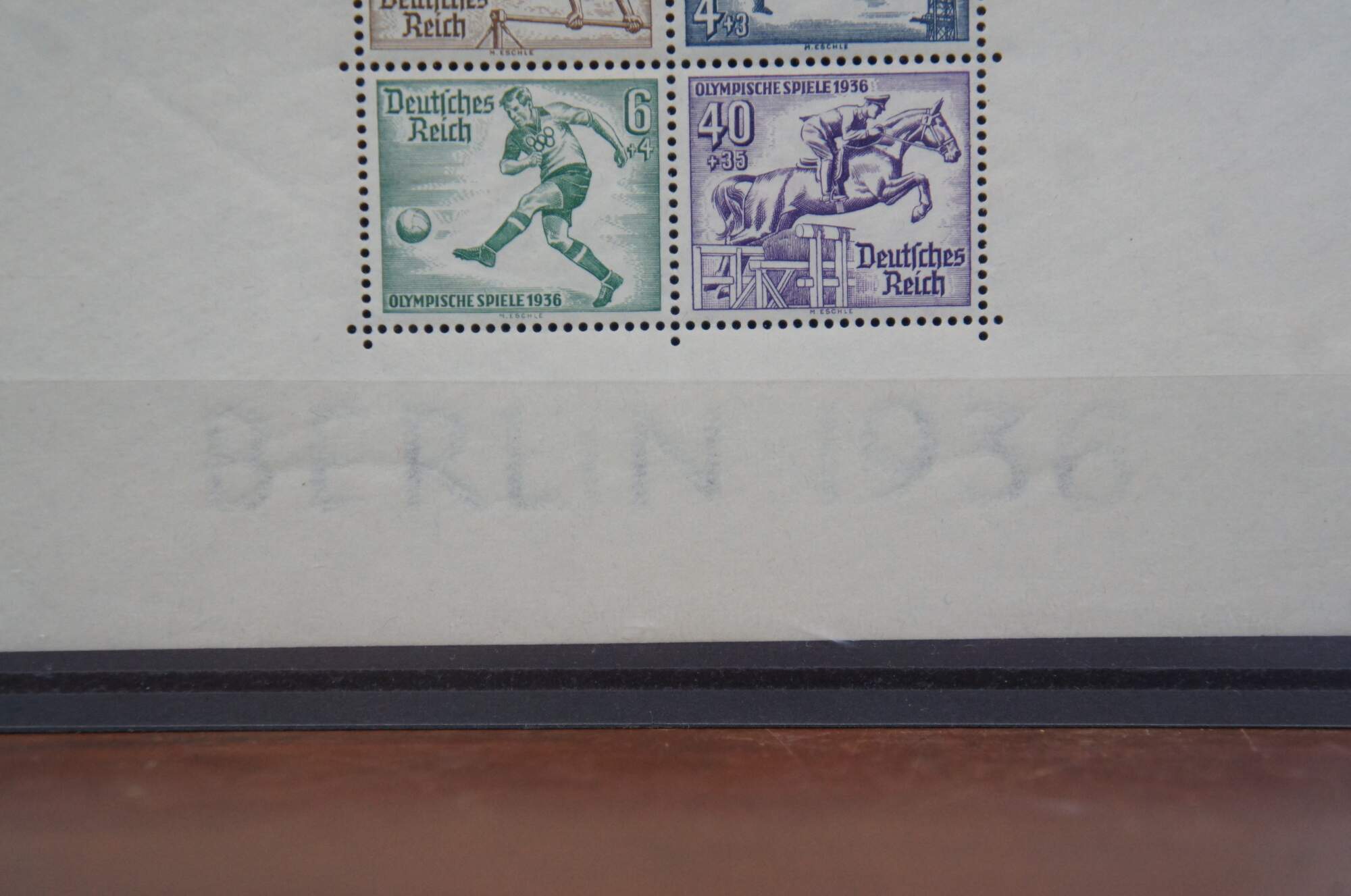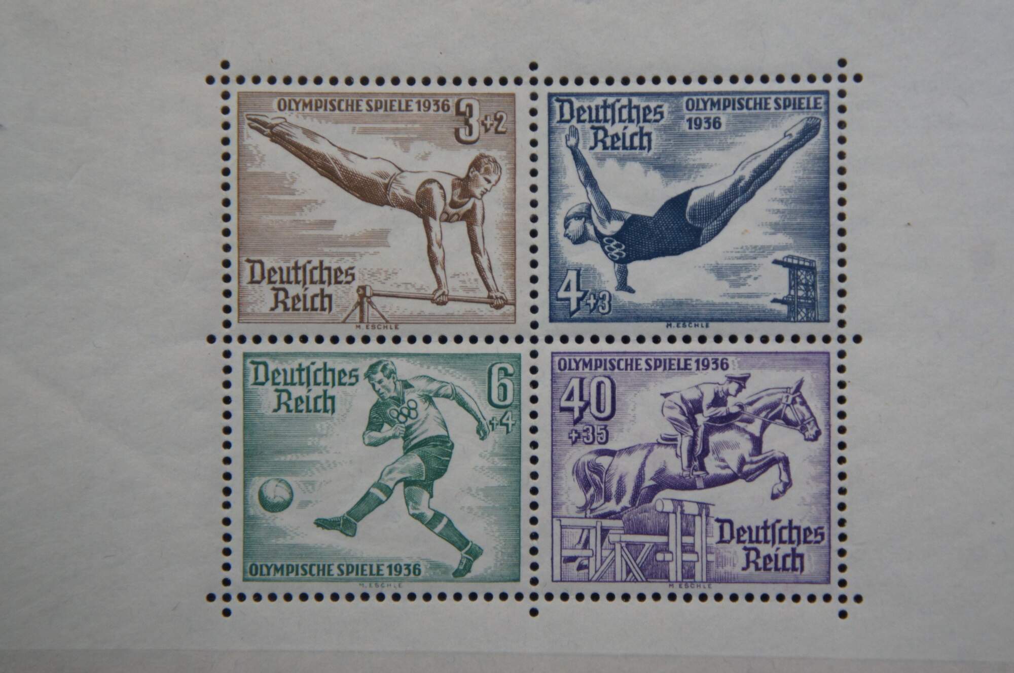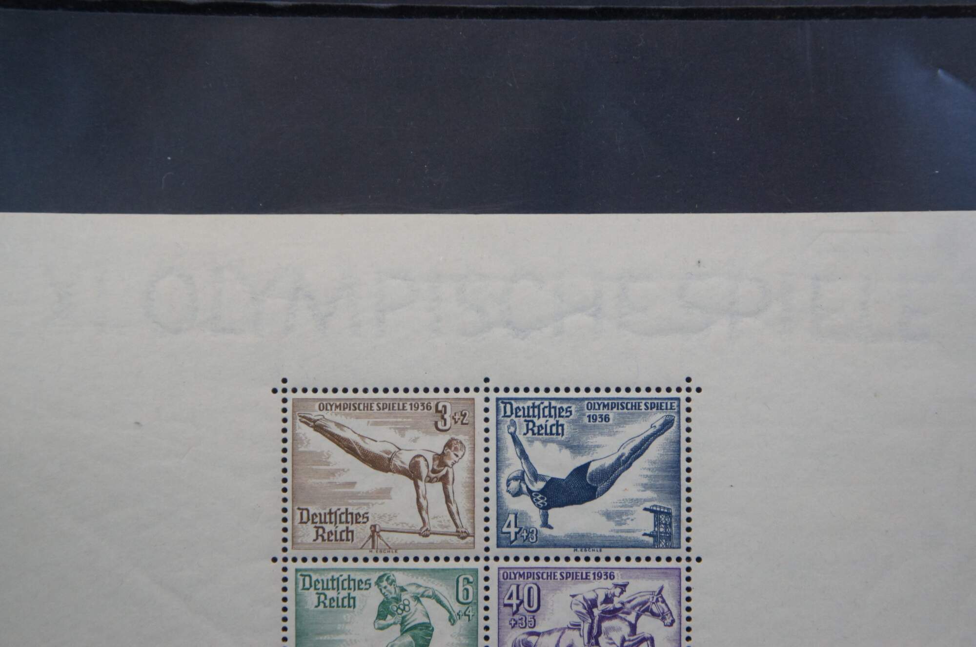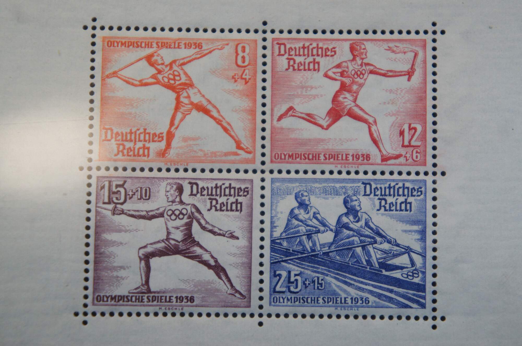 2 intact sheets of four 1936 Olympiche Spiele Berlin 1936 Olympic Games commemorative postage stamps. Printed in multicolored inks of white paper. Includes protective covers.