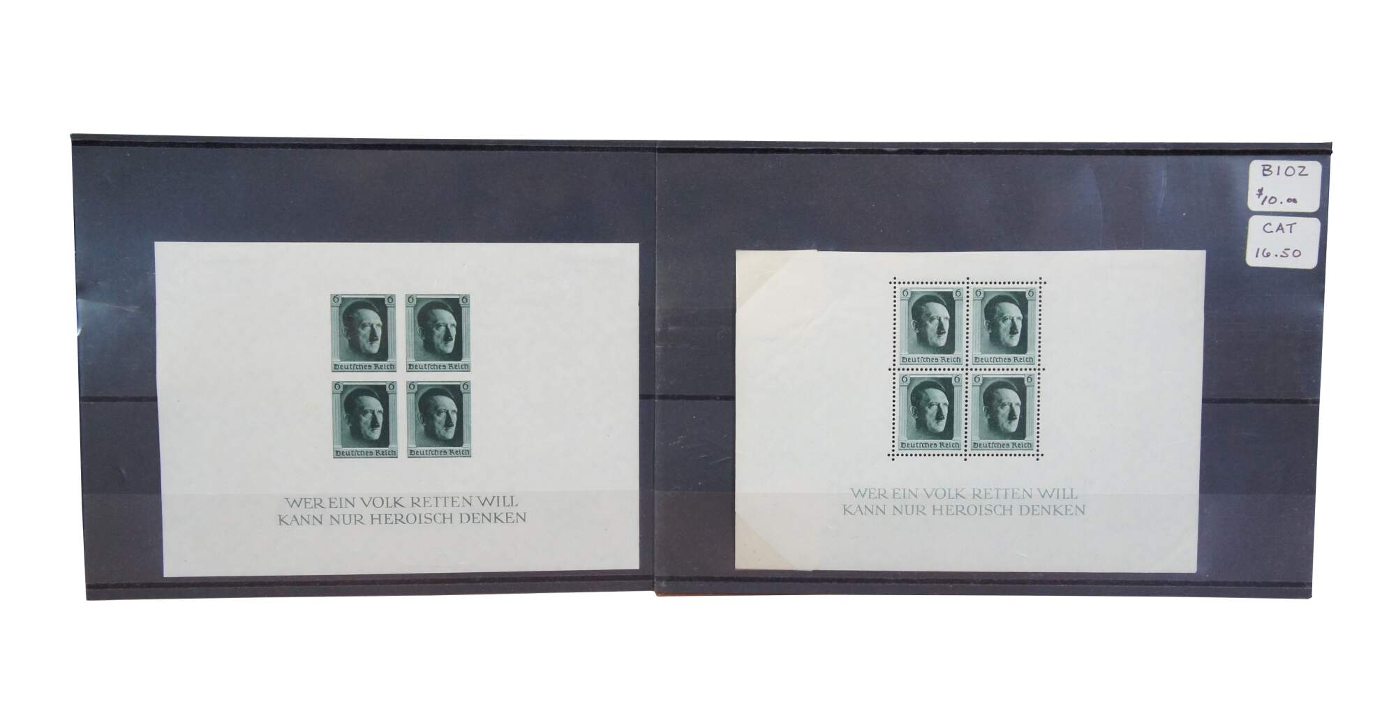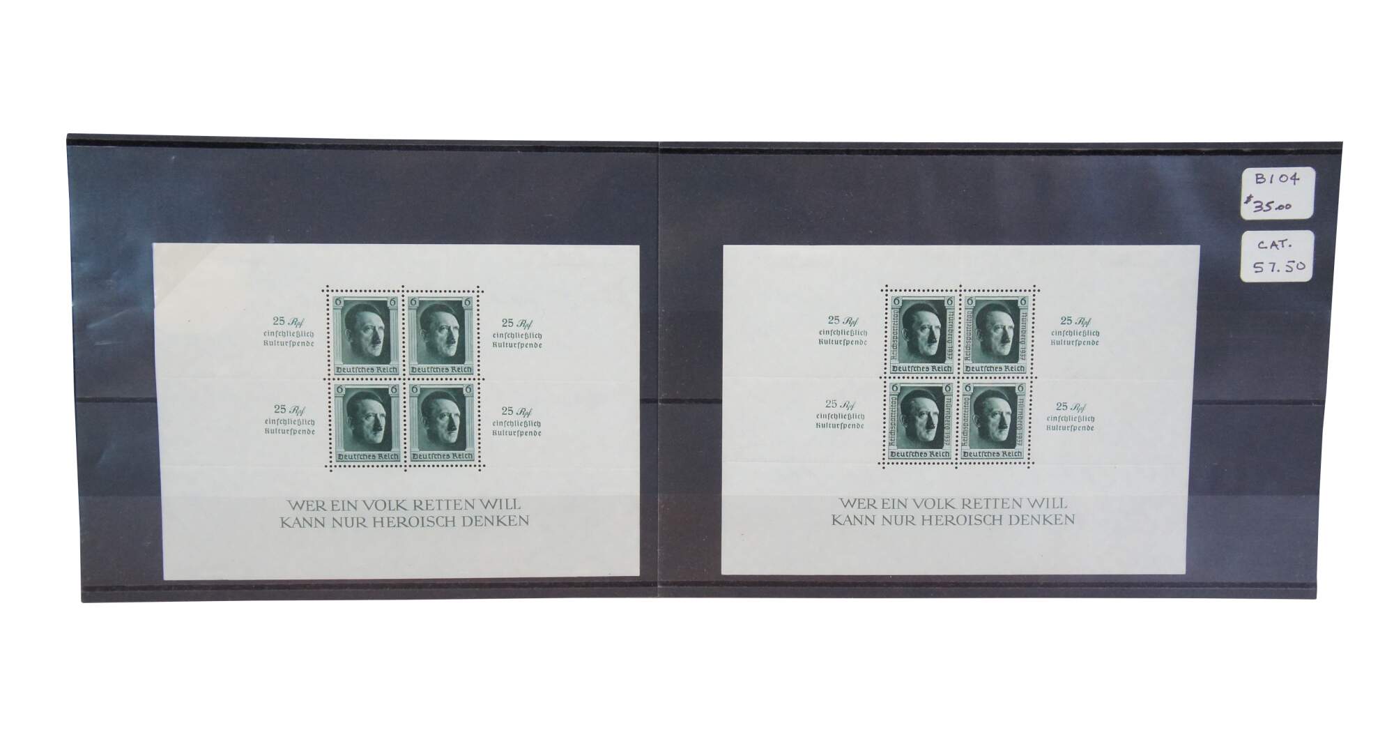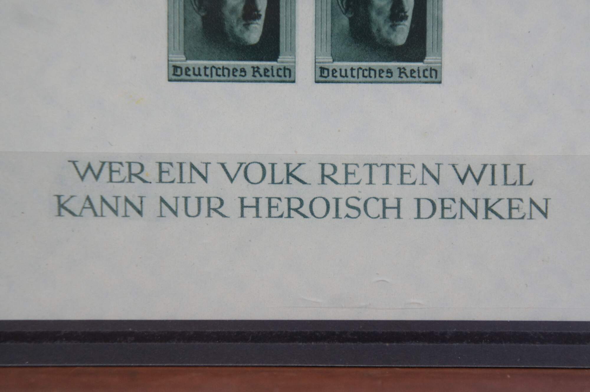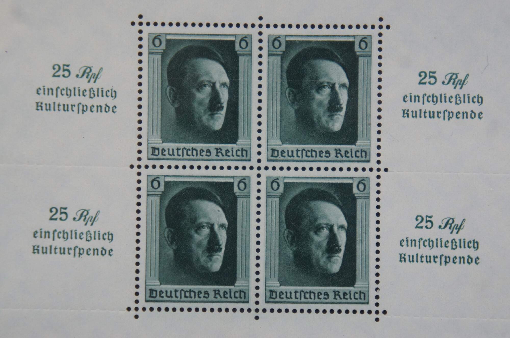 4 intact sheets of four 1937 Third Reich / German Cultural Fund / Hitler's 48th Birthday commemorative postage stamps. Printed in green on white paper. "Wer Ein Volk Retten Will Kann Nur Heroisch Denken" (Anyone who wants to save a people can only think heroically) - 25 Rpf einschlieszlich kulturfpende (including cultural donations). Includes protective covers.