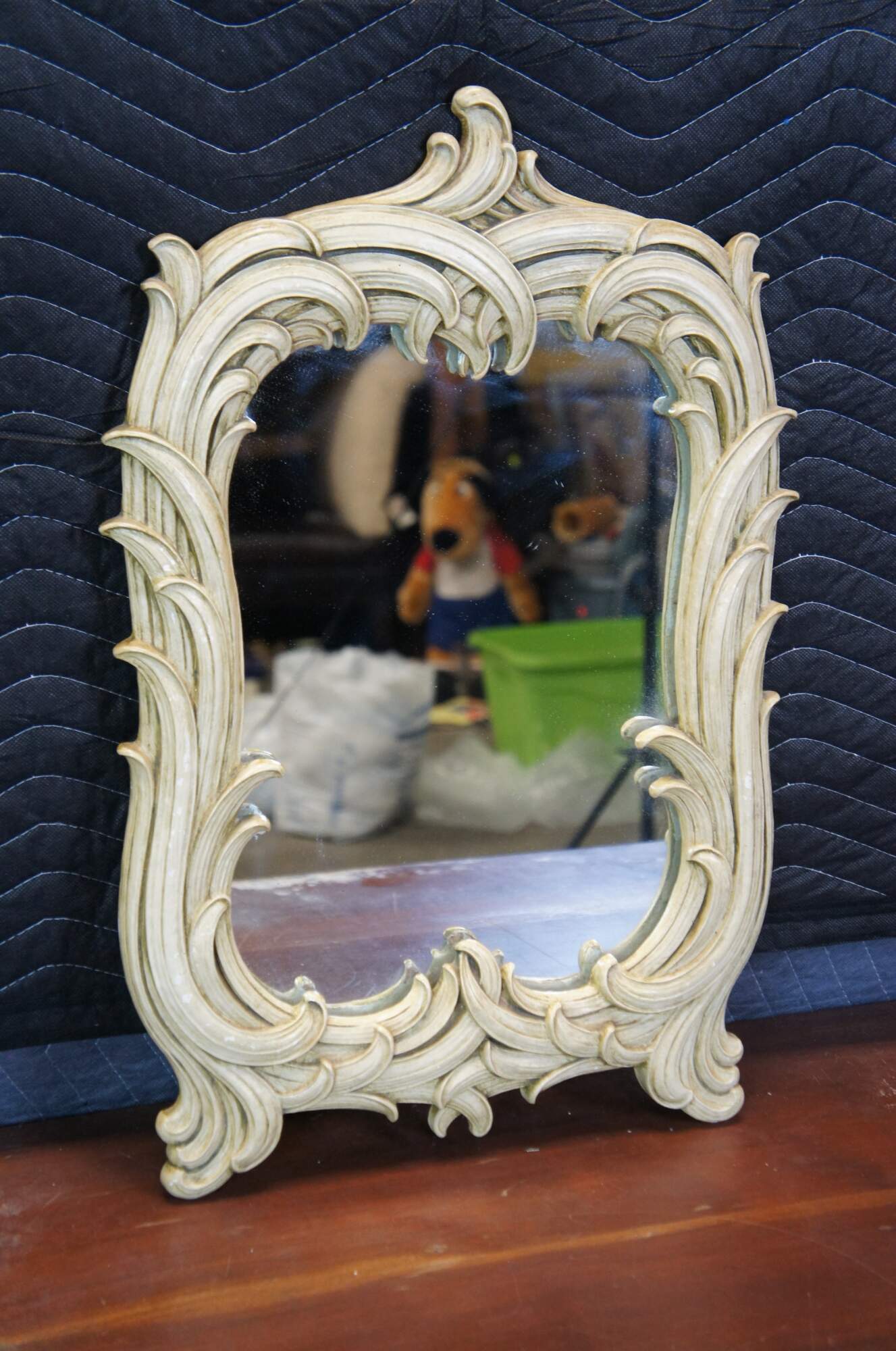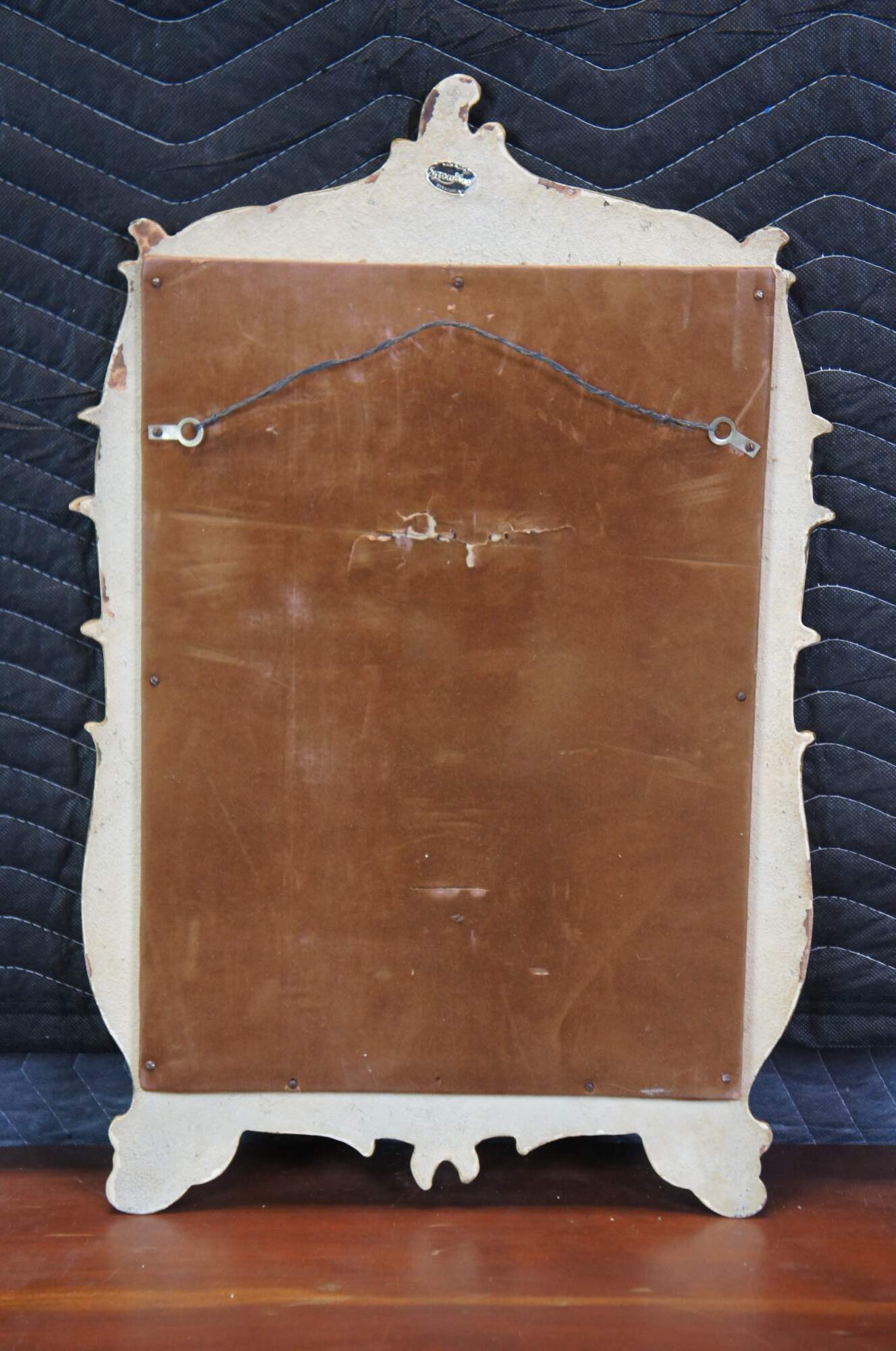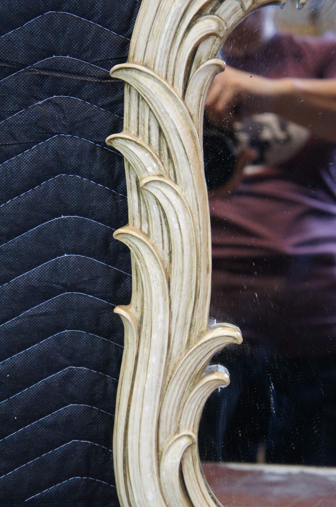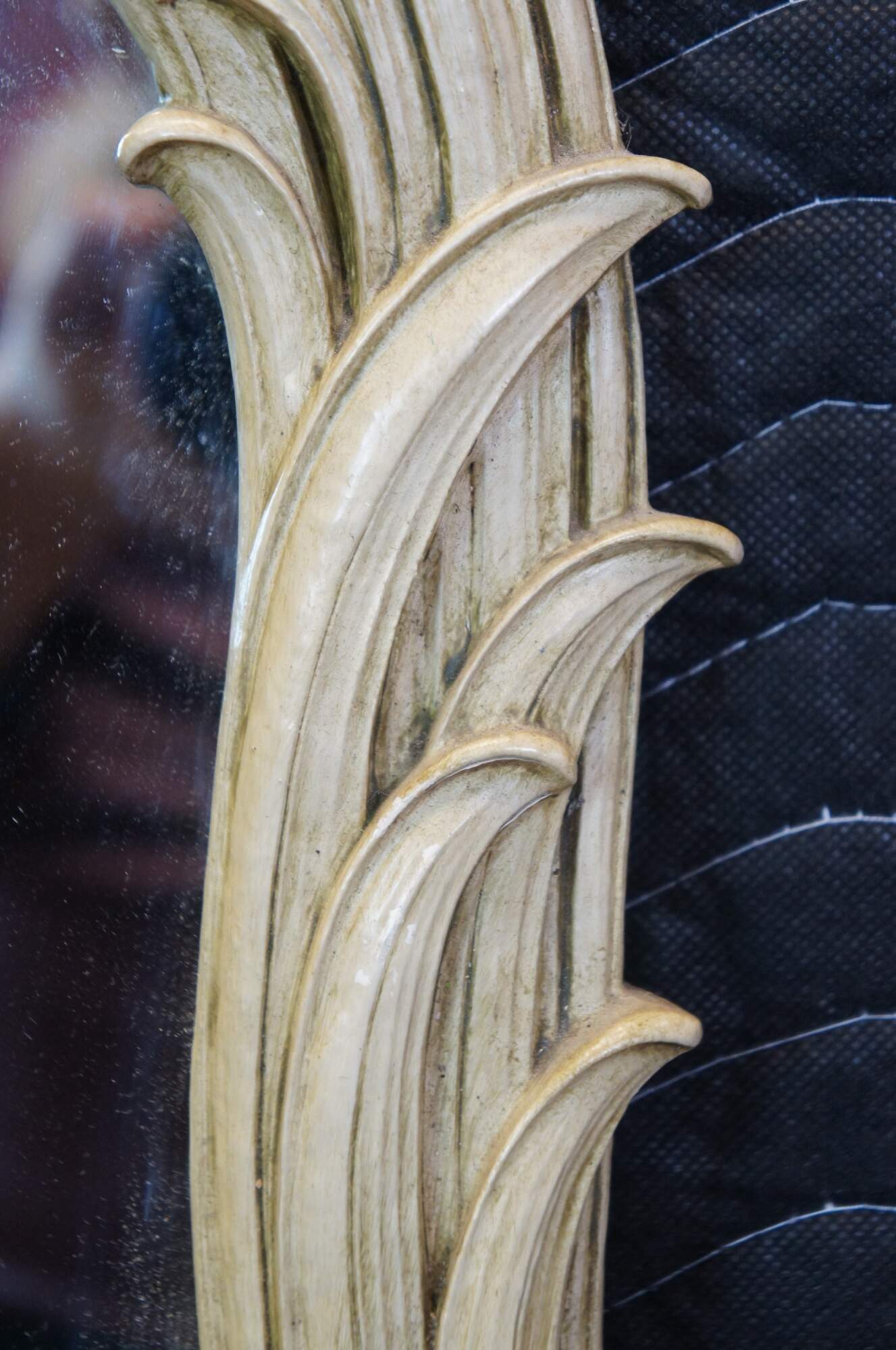 Circa 1940's Syroco Wood wall mirror - delicately molded with a rococo style detailed foliate design of long, sweeping leaves with an off white painted finish. Leather backing; wire wall hanger.