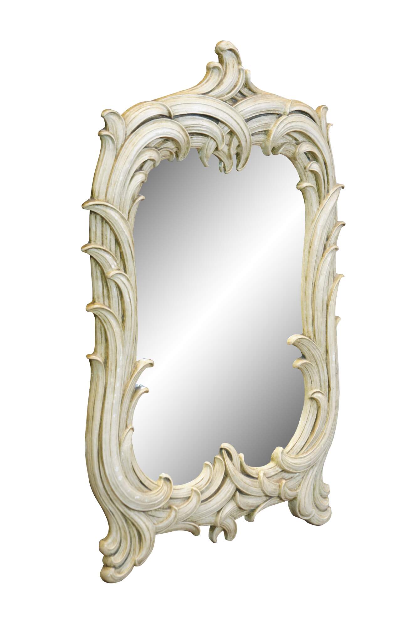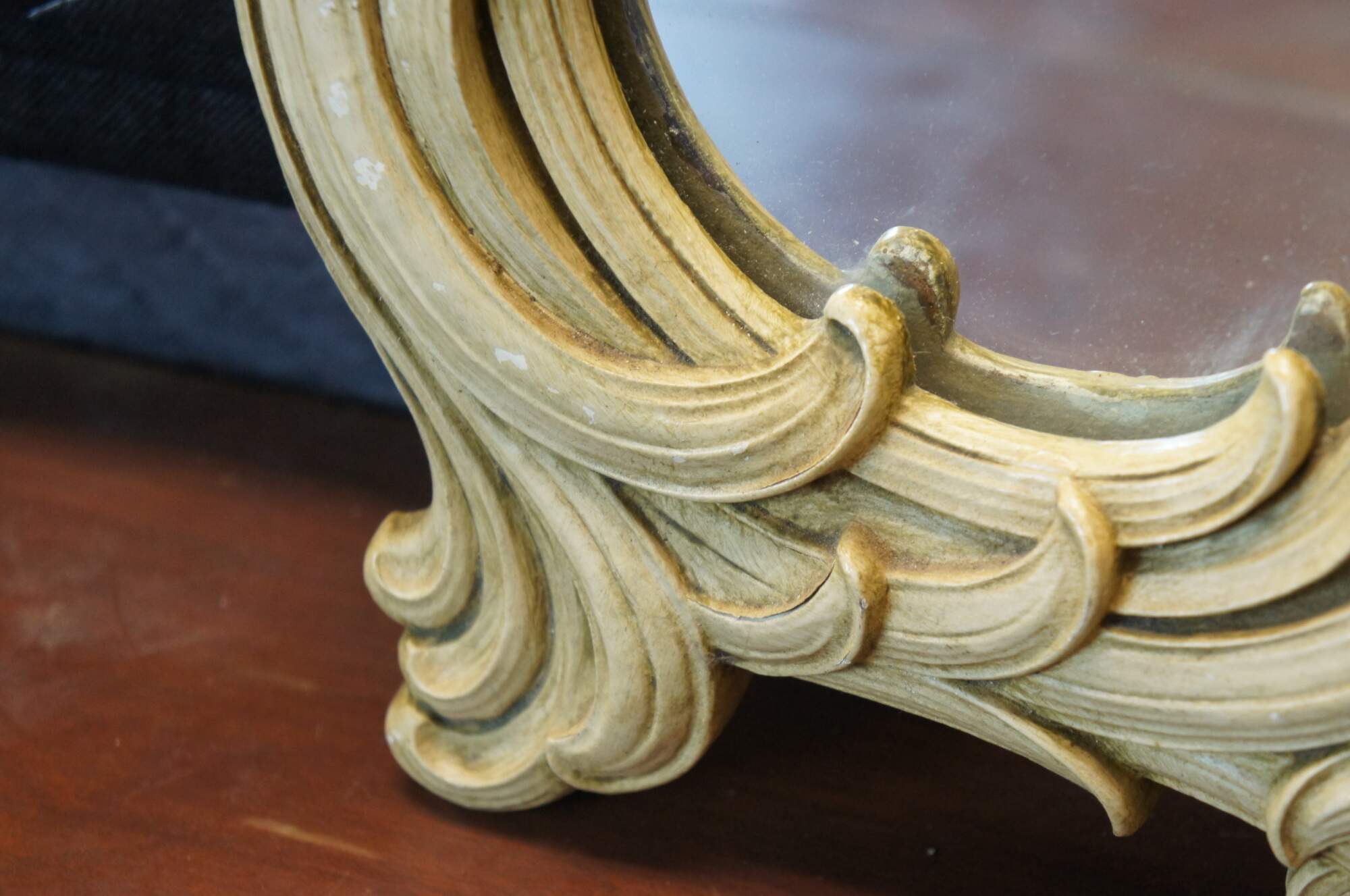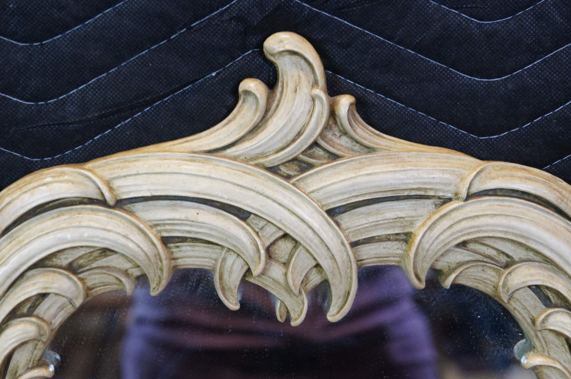 Circa 1940's Syroco Wood wall mirror - delicately molded with a rococo style detailed foliate design of long, sweeping leaves with an off white painted finish. Leather backing; wire wall hanger.