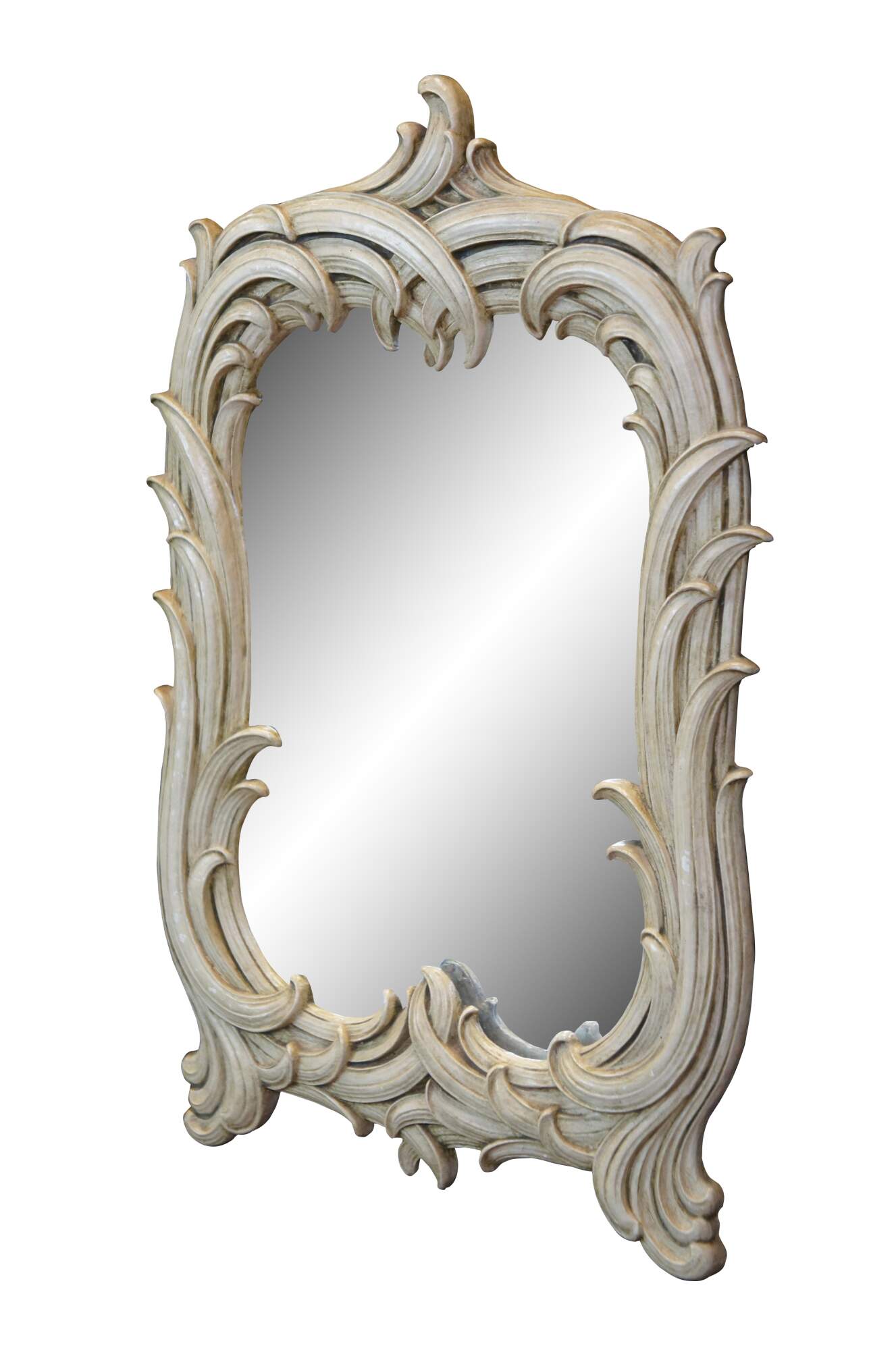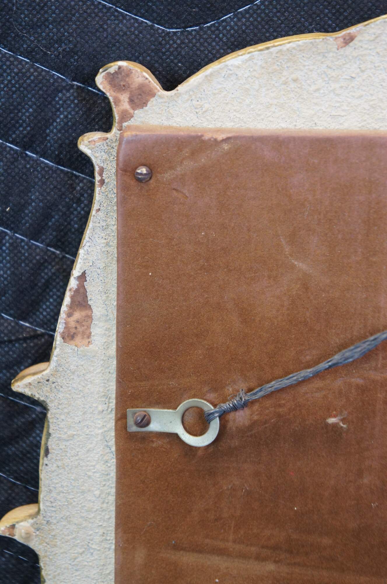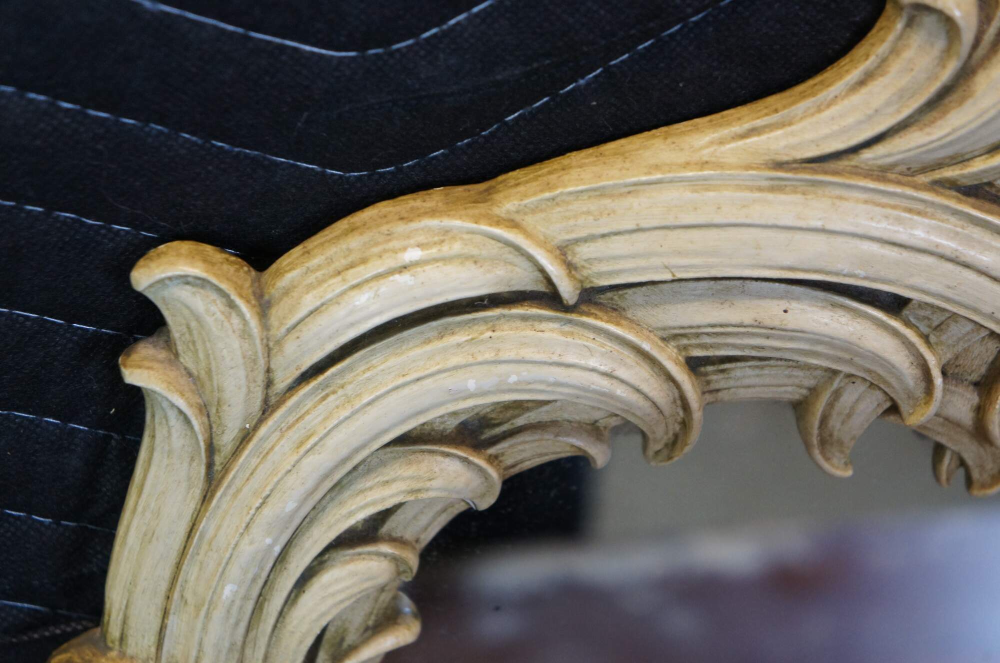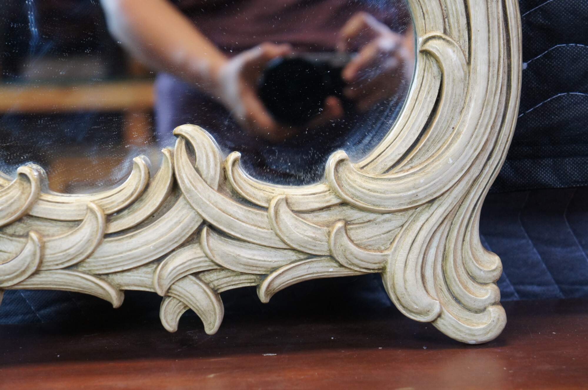Circa 1940's Syroco Wood wall mirror - delicately molded with a rococo style detailed foliate design of long, sweeping leaves with an off white painted finish. Leather backing; wire wall hanger.