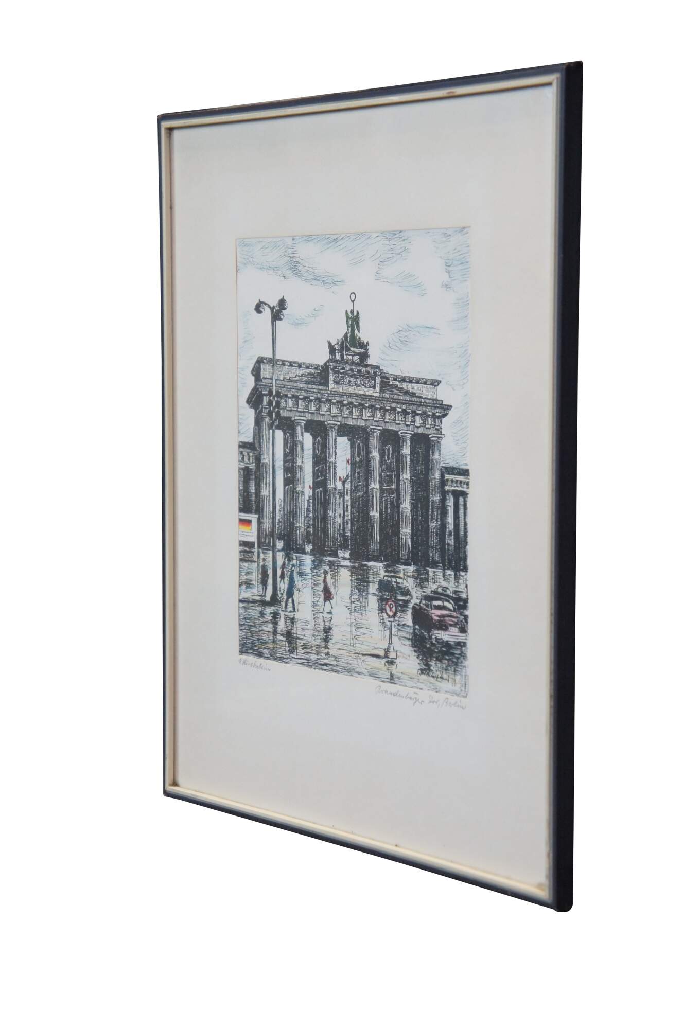Mid 20th century framed etching of Berlin, Germany's Brandenburg Gate by Erhard Kirchstein (1920-1972). Pencil signed on mat. Black and white beveled frame; white mat.