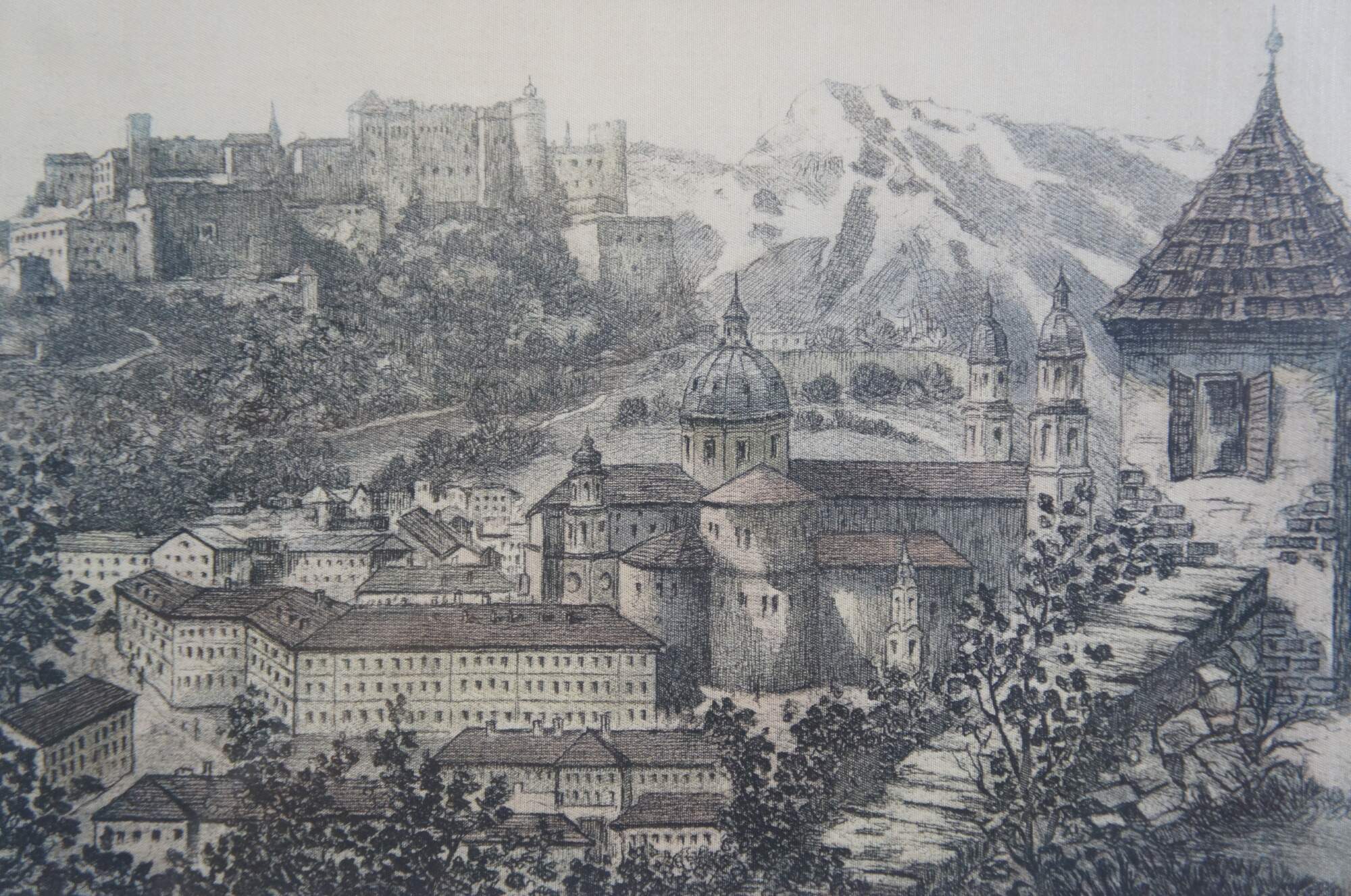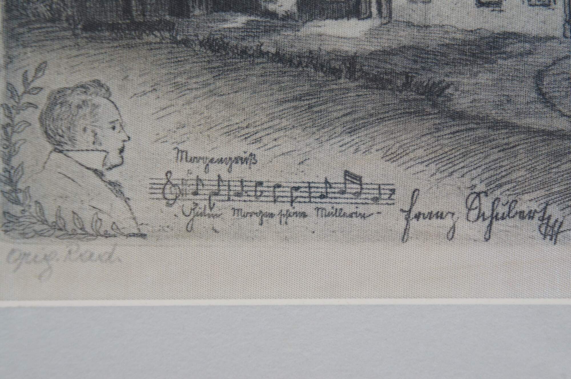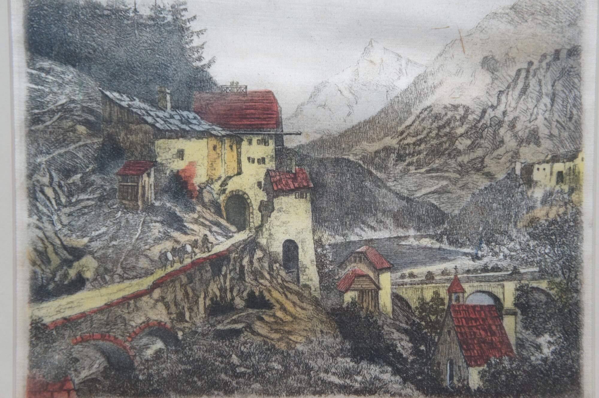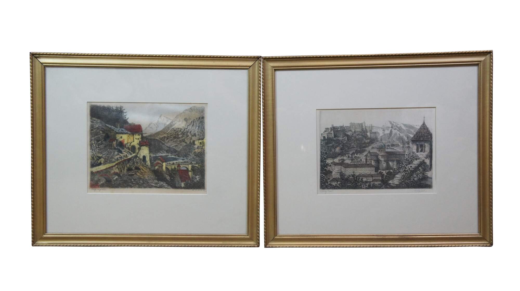 Set of three mid 20th century colored etchings on silk depicting Holdrichs Muhle (historic German mill / inn) with a bit of music by Franz Schubert, a cityscape of Saltzburg, Austria, and an Alpine mountain pass. Pencil signed H. Leisch along lower edge. Gilt wood beveled frame with rope twist edgee; white mat.