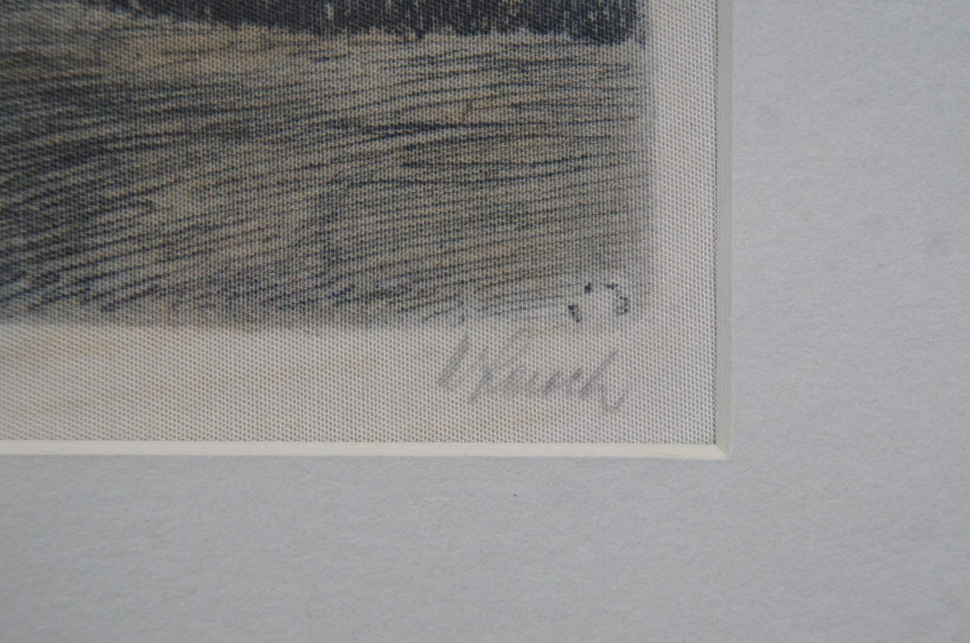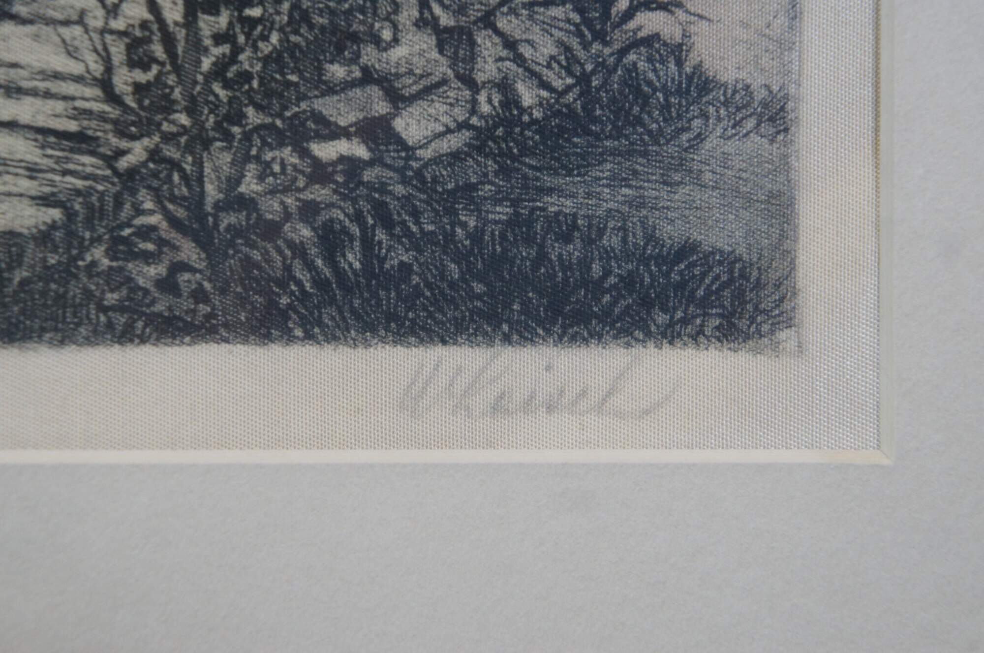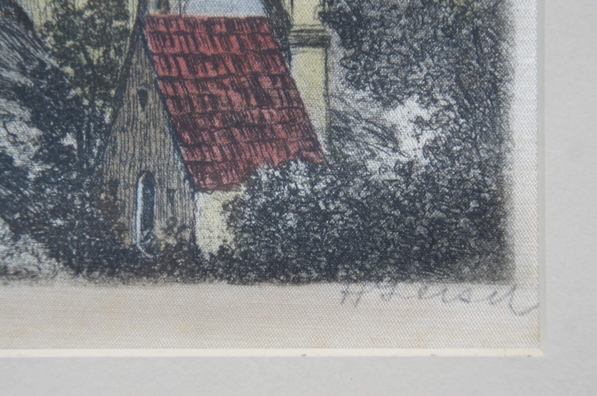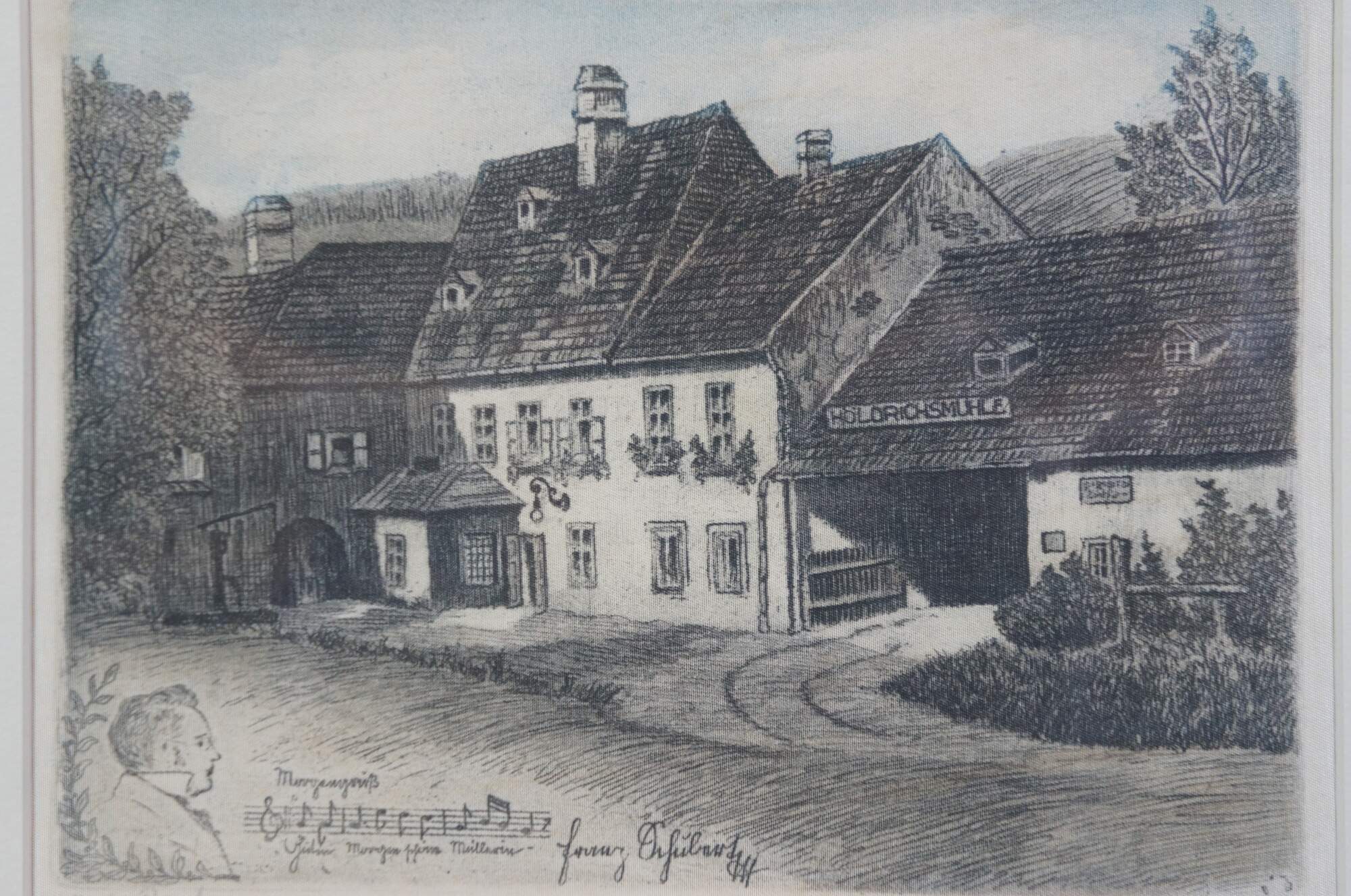 Set of three mid 20th century colored etchings on silk depicting Holdrichs Muhle (historic German mill / inn) with a bit of music by Franz Schubert, a cityscape of Saltzburg, Austria, and an Alpine mountain pass. Pencil signed H. Leisch along lower edge. Gilt wood beveled frame with rope twist edgee; white mat.