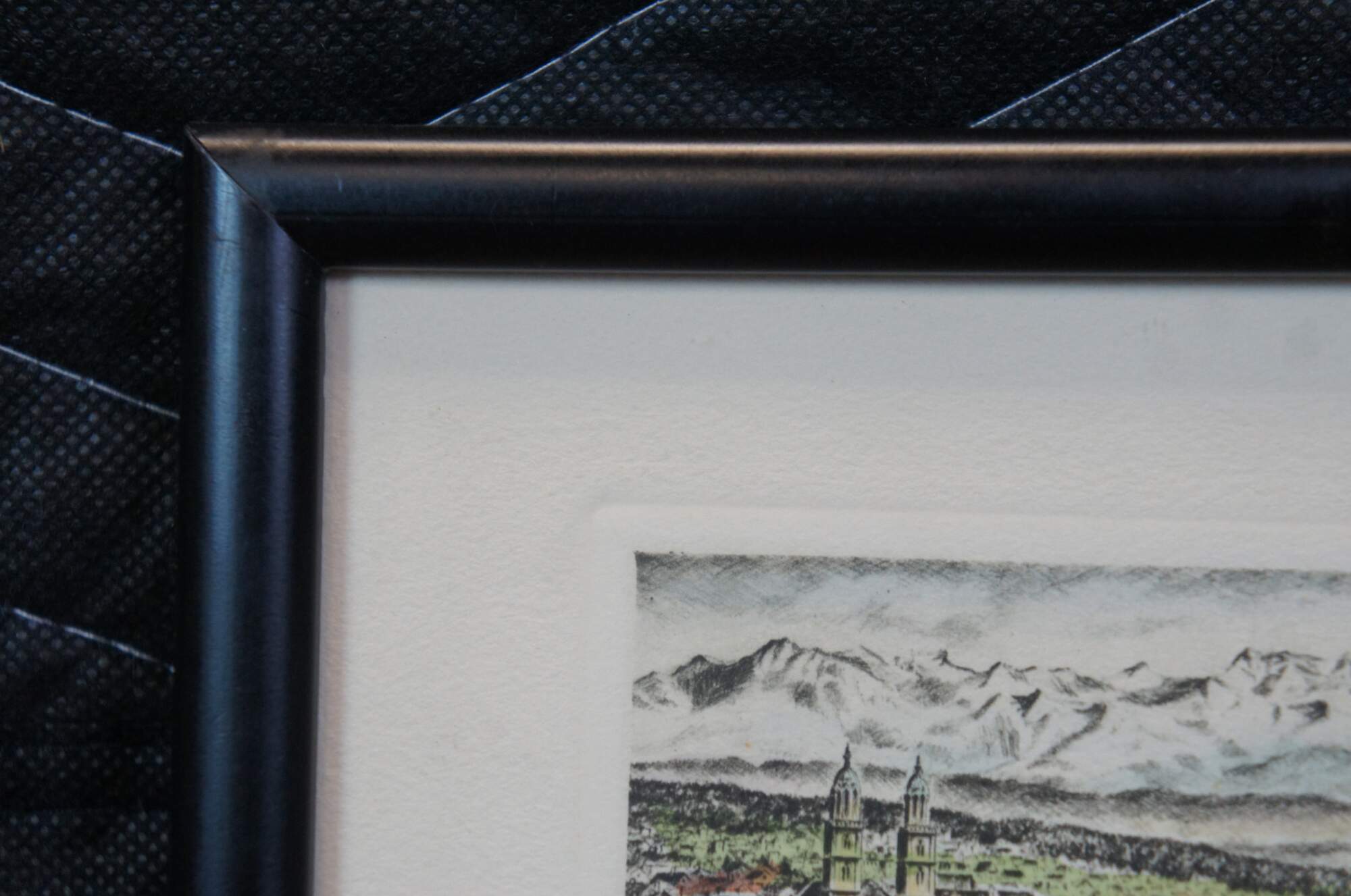 Mid to late 20th century hand colored etching showing a bird's eye view land / cityscape of Zurich, Switzerland. Pencil signed along lower edge. Black painted wood frame.