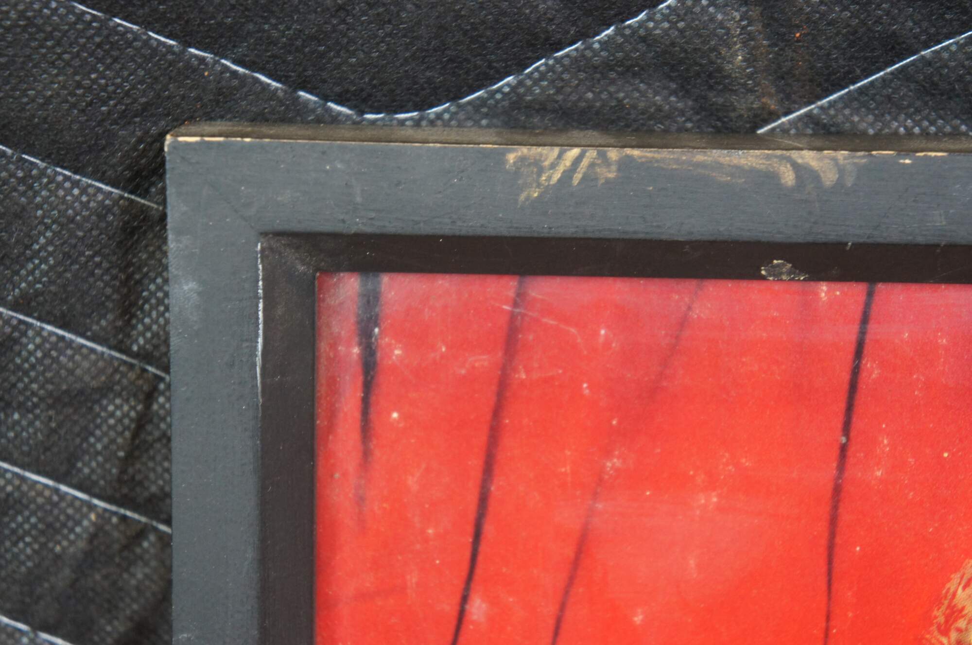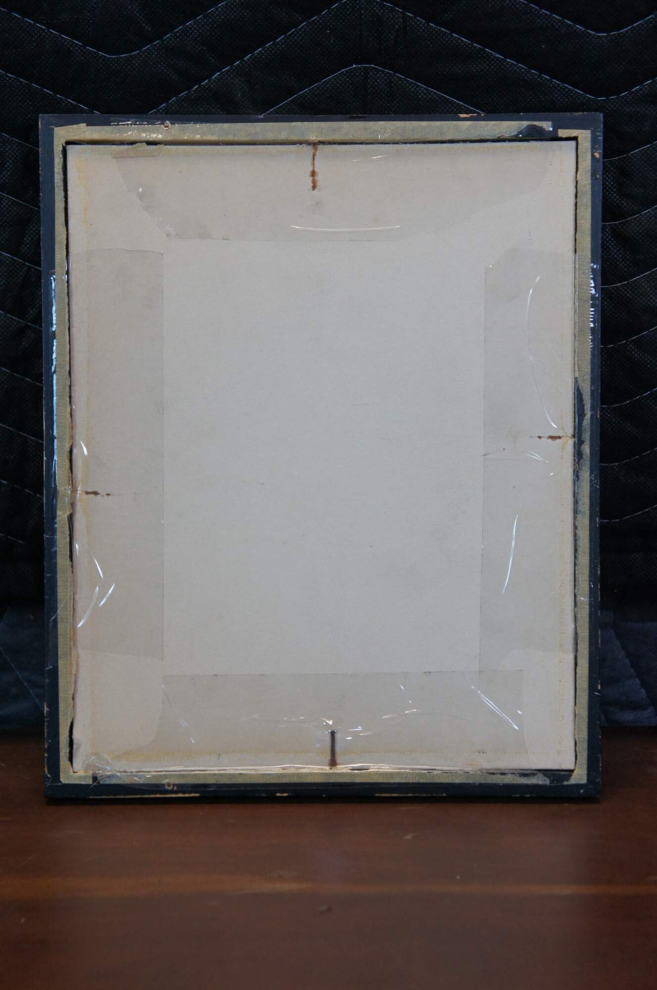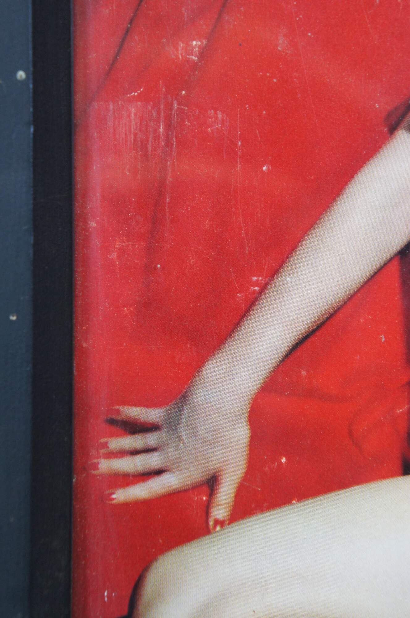 Vintage 1950's lithograph print of Marilyn Monroe as photographed by Tom Kelly, posed nude on a red curtained backdrop, titled Golden Dreams. Black painted beveled wood frame.