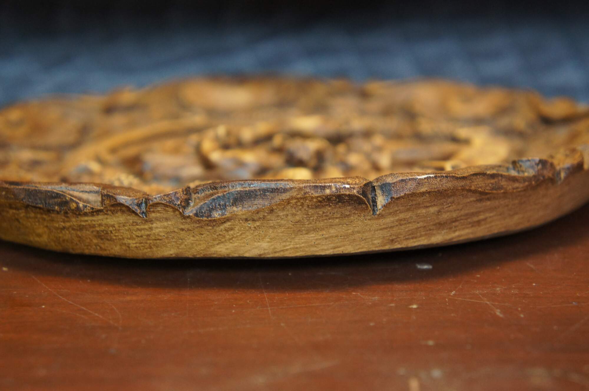Mid to late 20th century Black Forest style resin wall plate, carved in relief with a scallop, foliate and grape vine border around a group of men drinking in a tavern with the dual language (Latin and German) legend "In Vino Veritas - Im Wein ist Wahrheit" (There is truth in wine). Painted to resemble wood.