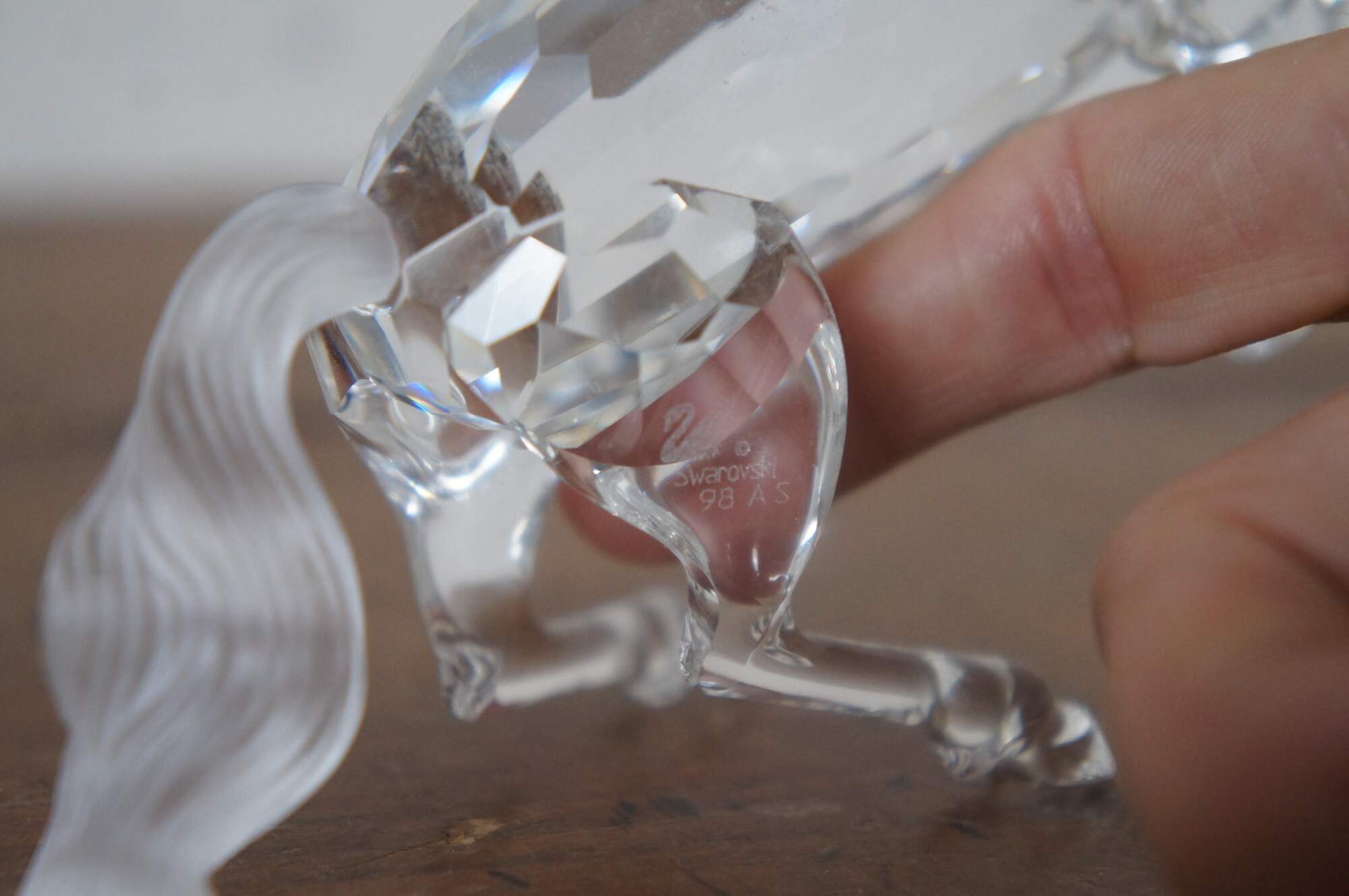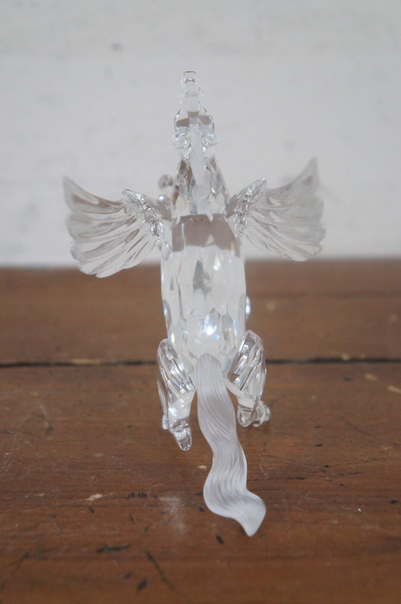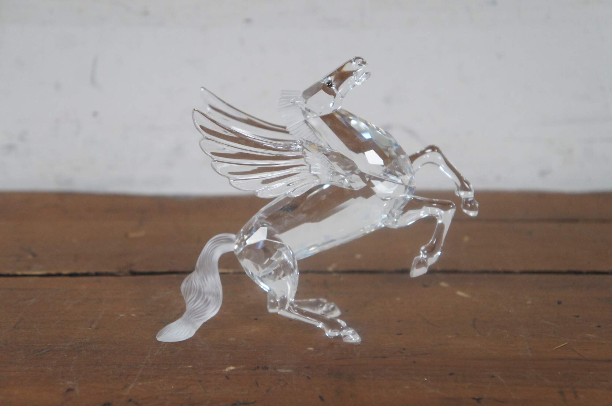 Swarovski Collectors Society 1998 Annual Edition, Fabulous Creatures series, The Pegasus Horse. Clear crystal figurine in the shape of a Greek pegasus with frosted mane / tail, and dark eyes. Includes original packaging. Made in Austria.