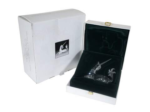 Swarovski Collectors Society 1996 Annual Edition, Fabulous Creatures series, The Unicorn. Clear crystal figurine in the shape of a unicorn, inspired by the 15th century tapestry series "Hunt of the Unicorn," with frosted horn / tail and blue eyes. Made in Austria. Includes original packaging.