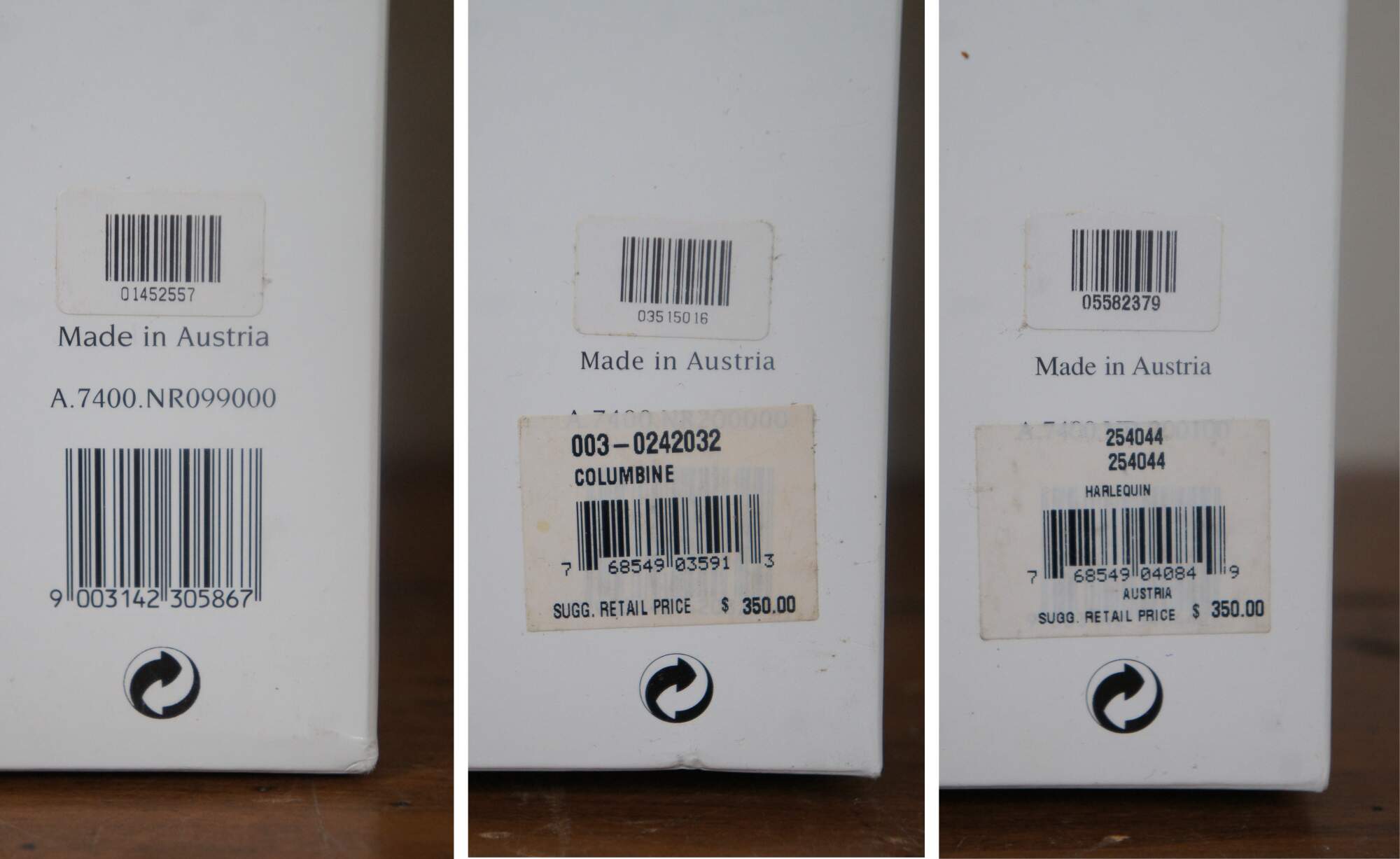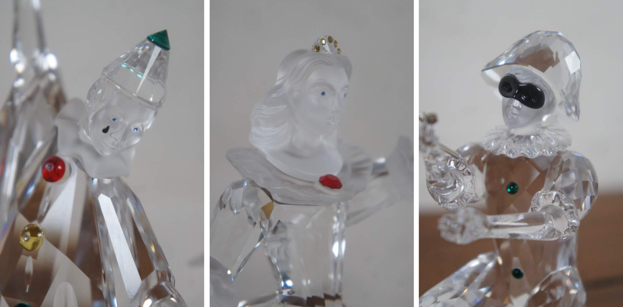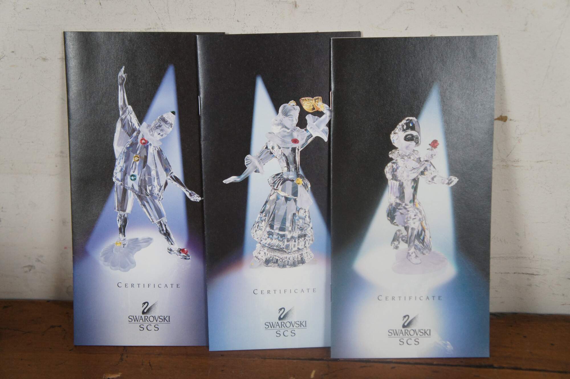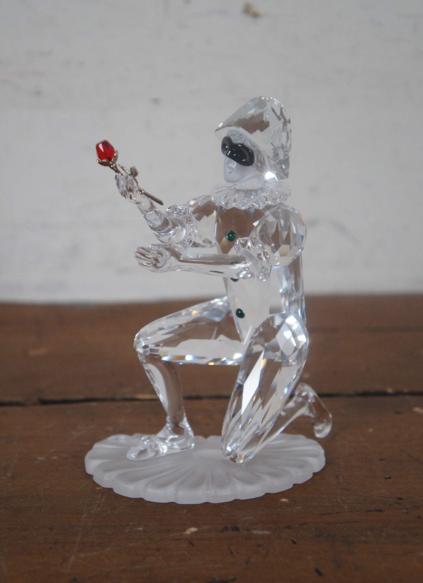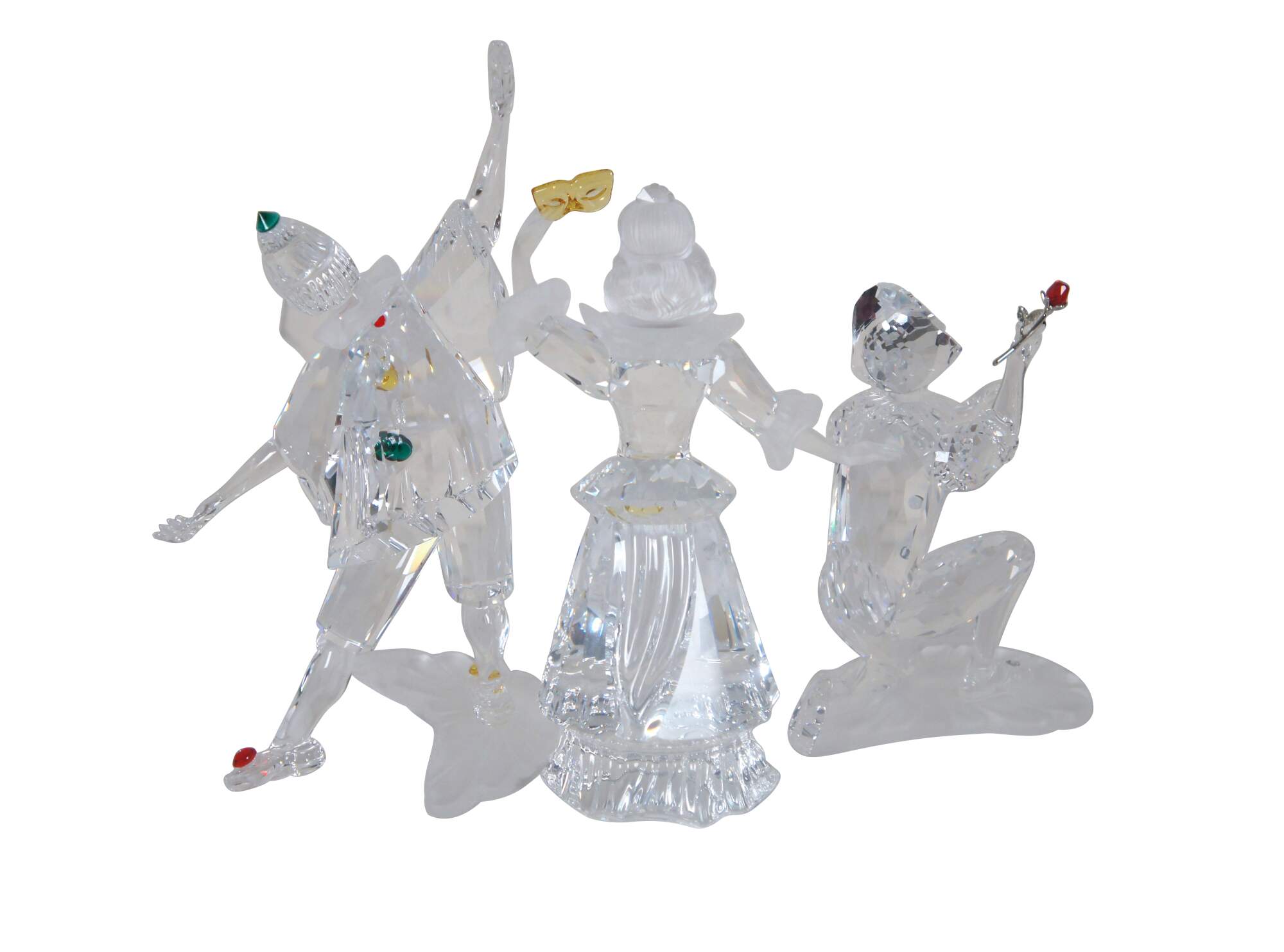 Swarovski Collectors Society Masquerade harlequin clown series trilogy including 1999 - Pierrot , 2000 - Columbine, and 2001 - Harlequin. Clear crystal figurines based on three primary characters of Italian Commedia del Arte, with frosted accents and multicolor details. Includes Certificates of Authenticity and original packaging. Made in Austria.