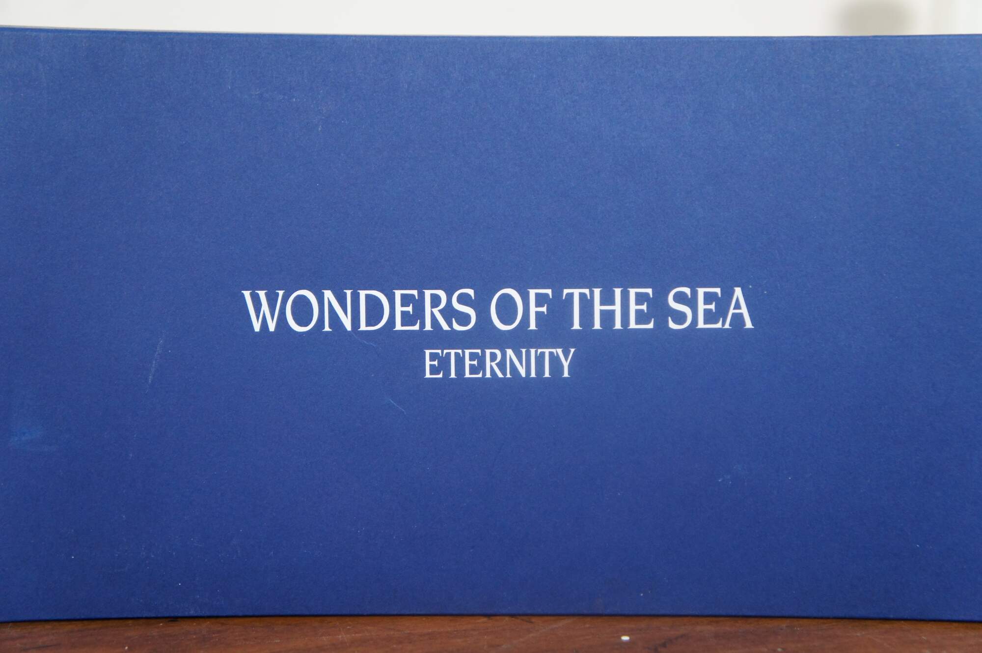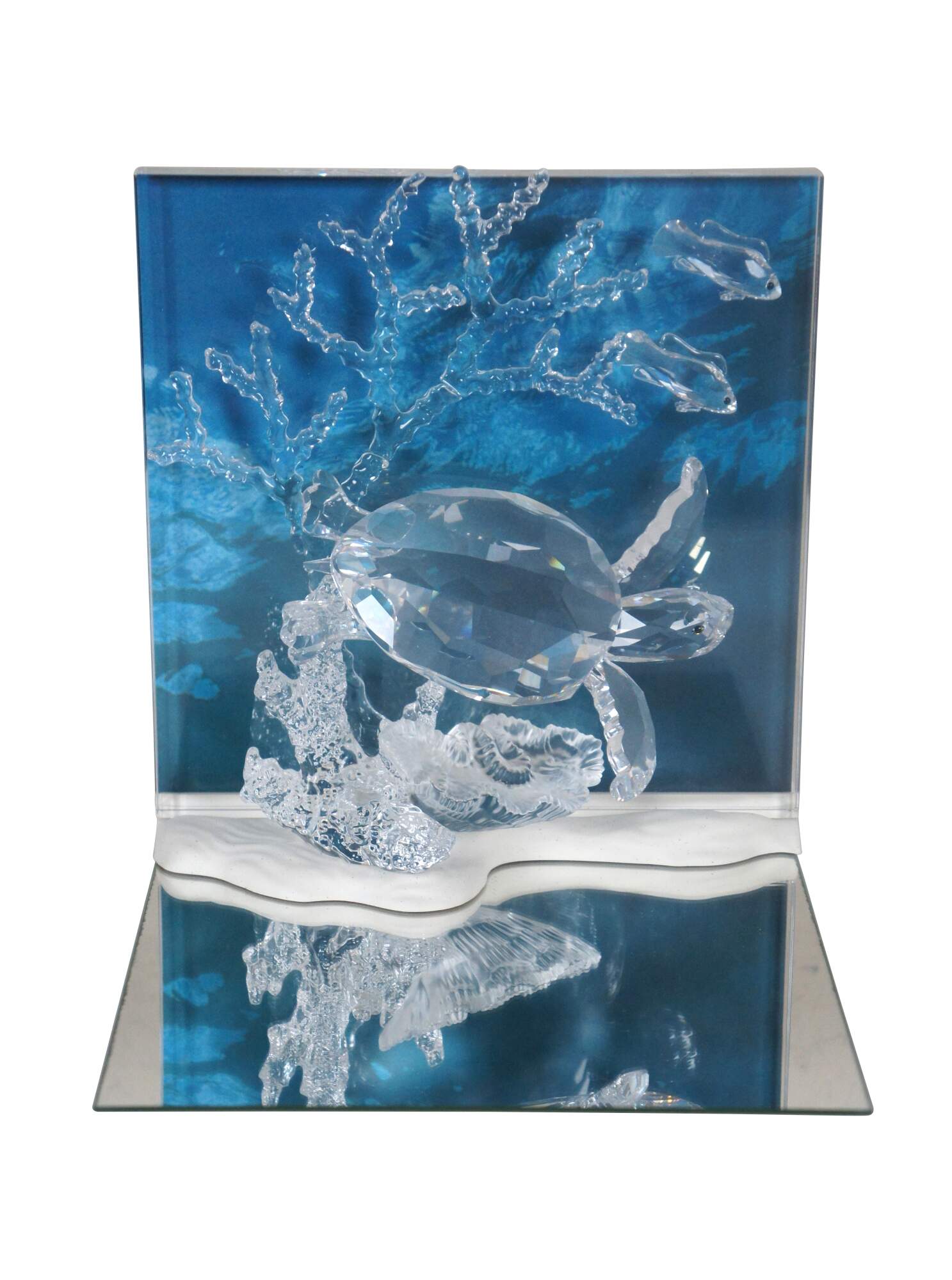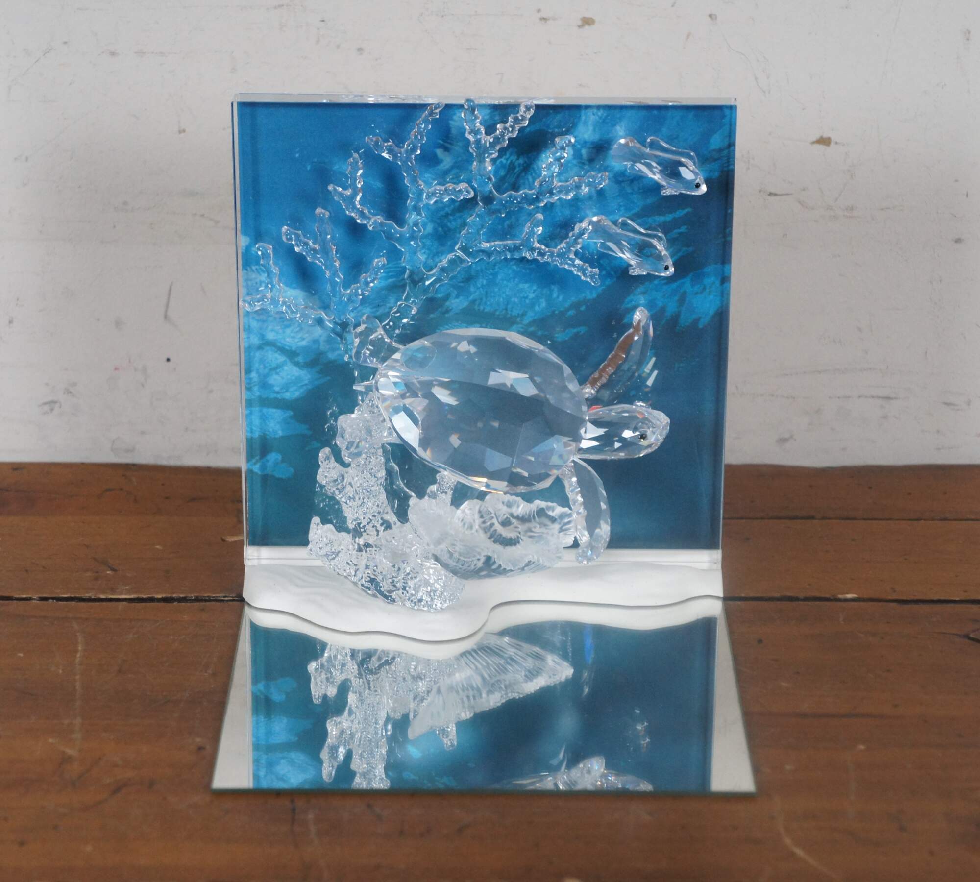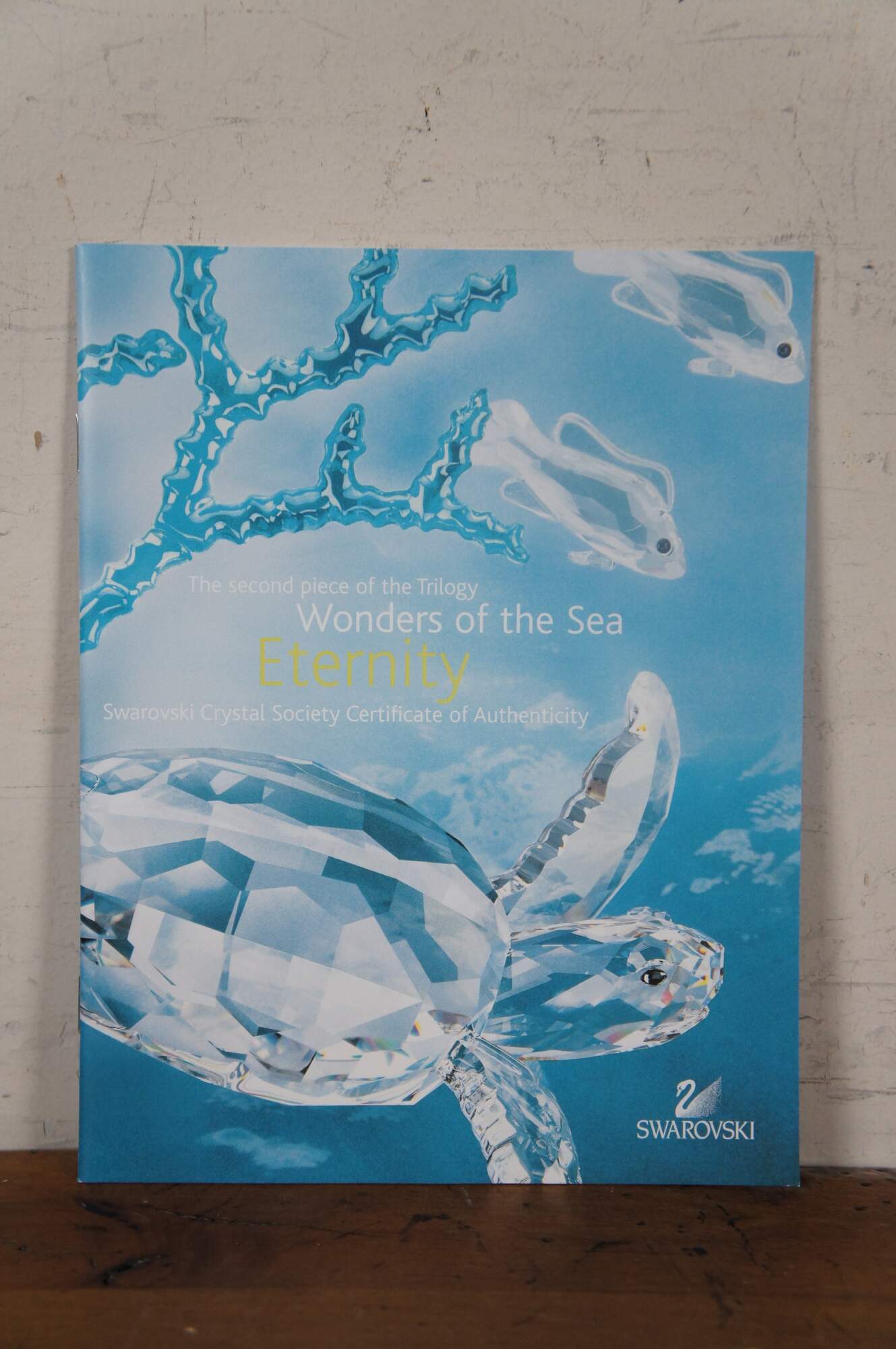 Swarovski Collectors Society 2006, the second piece of the Trilogy Wonders of the Sea, Eternity. Clear crystal figurine depicting a sea turtle, fish and coral, mounted on a crystal block, and including sand shaped base / stand, mirror, and ocean backdrop for multiple display possibilities. Includes Certificate of Authenticity and original packaging. Made in Austria.