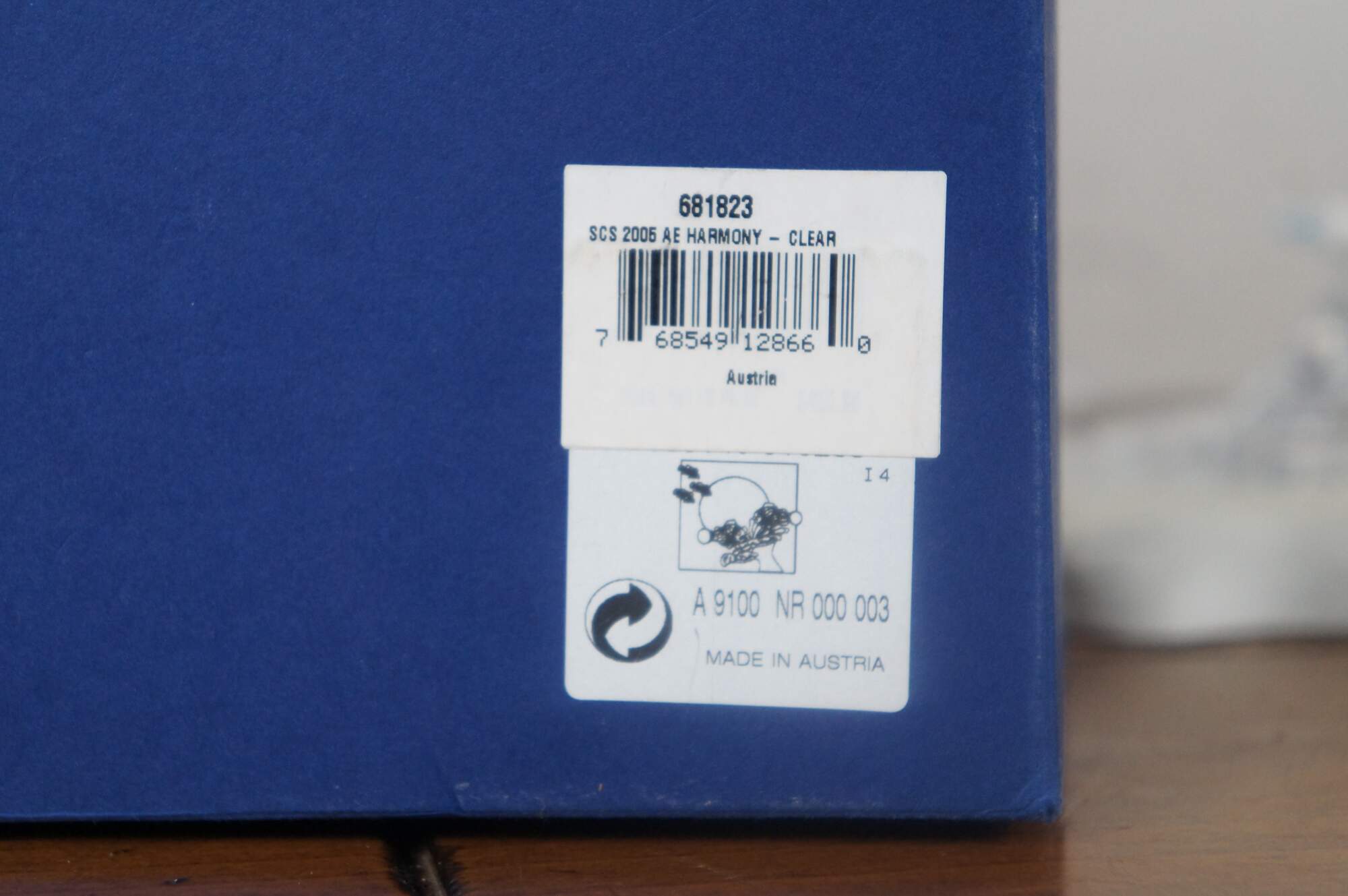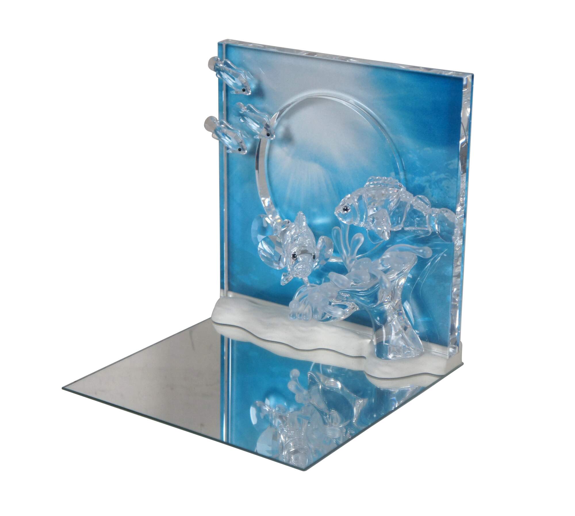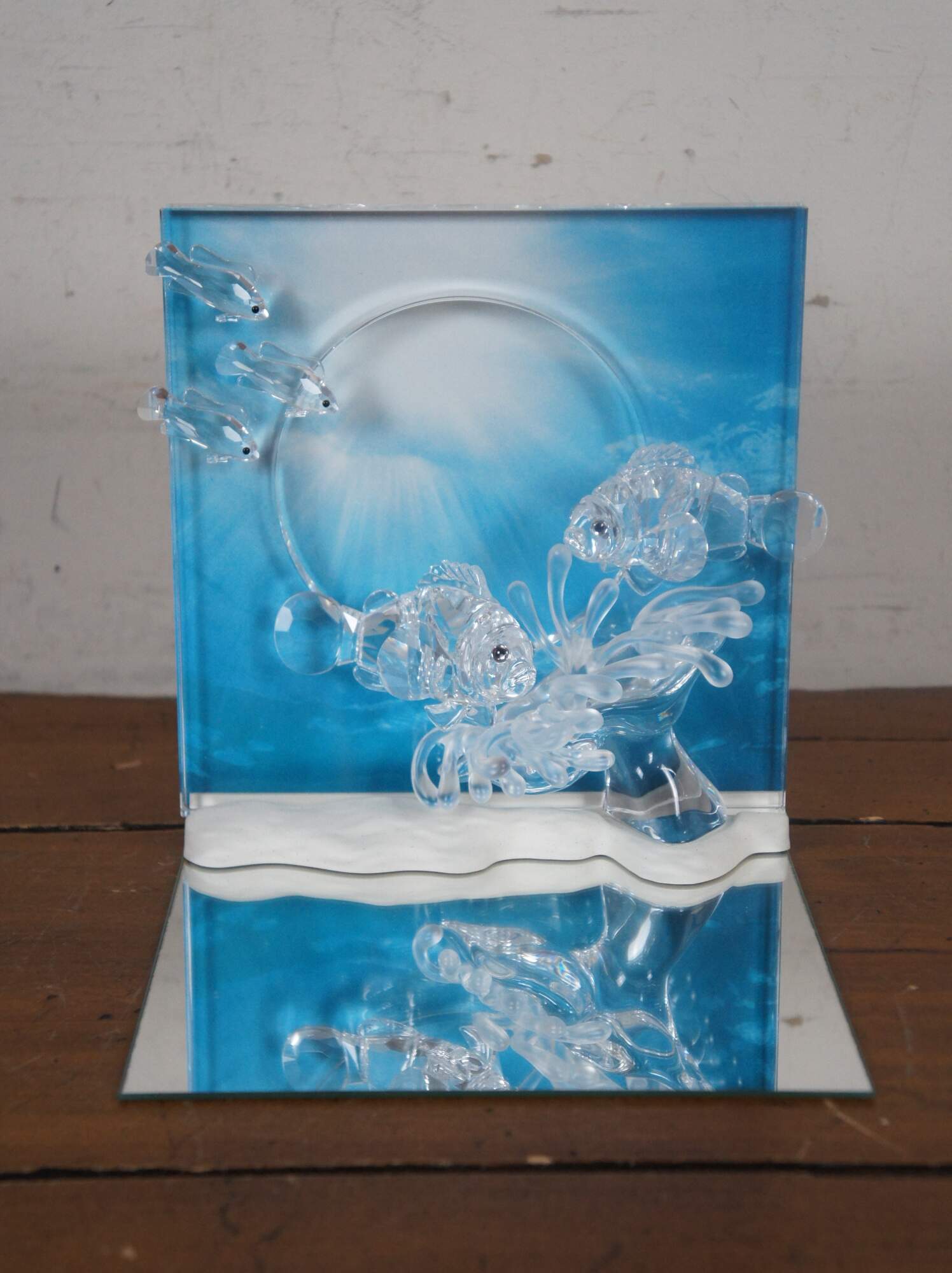 Swarovski Collectors Society 2005, the first piece of the triology Wonders of the Sea, Harmony. Clear crystal figurine depicting clown fish and coral on a circle pierced crystal block, and including sand shaped base / stand, mirror, and ocean backdrop for multiple display possibilities. Includes Certificate of Authenticity and original packaging. Made in Austria.