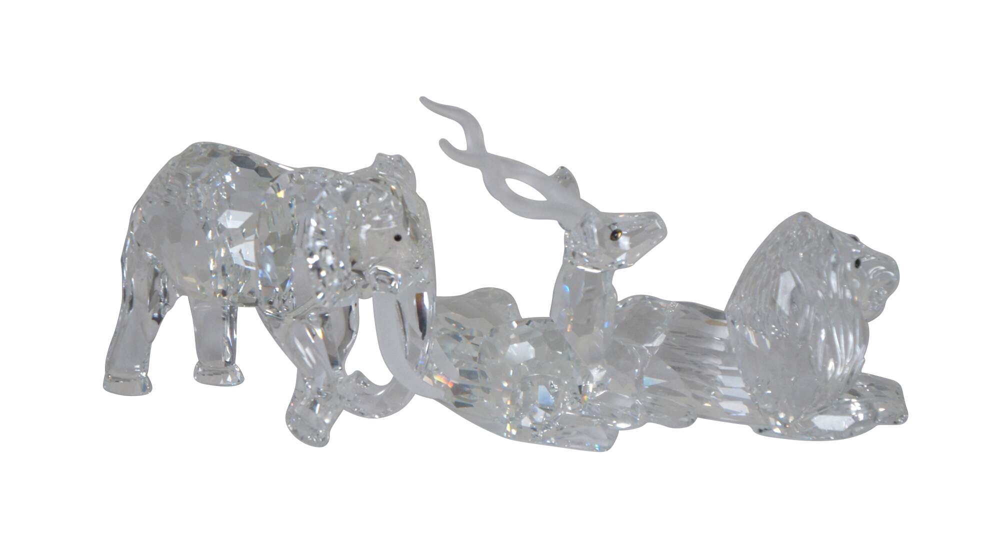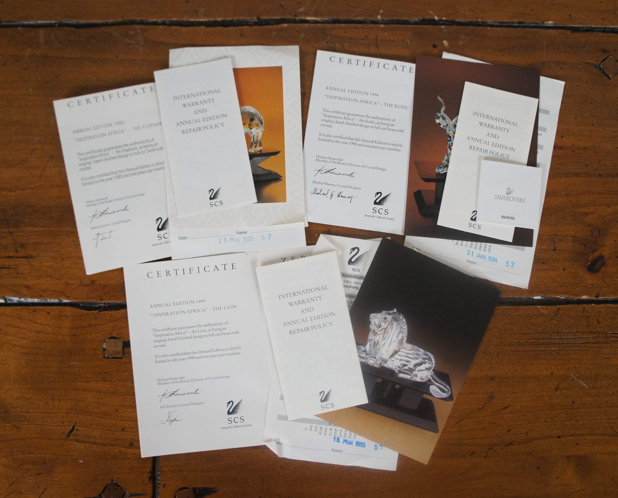 Swarovski Collectors Society Annual Edition Inspiration Africa taxidermy series trilogy including 1993 - The Elephant, 1994 - The Kudu, and 1995 - The Lion. Clear crystal figurines with frosted accents and dark amber eyes. Includes Certificates of Authenticity and original packaging.