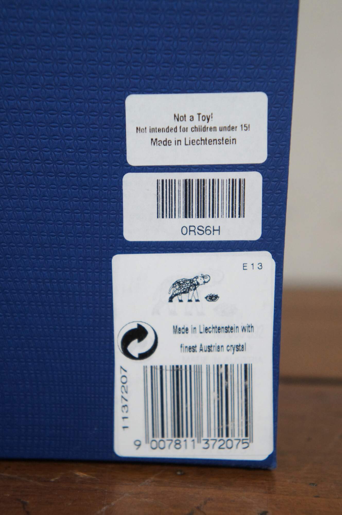 Swaroxski Collectors Society 2013 Annual Edition, Cinta Elephant. Light brown crystal figurine in the shape of an Indian elephant with frosted tusks and black eyes. Includes leafy shrub shaped plaque with signature of designer Elisabeth Adamer. Includes original packaging. Made in Liechtenstein.