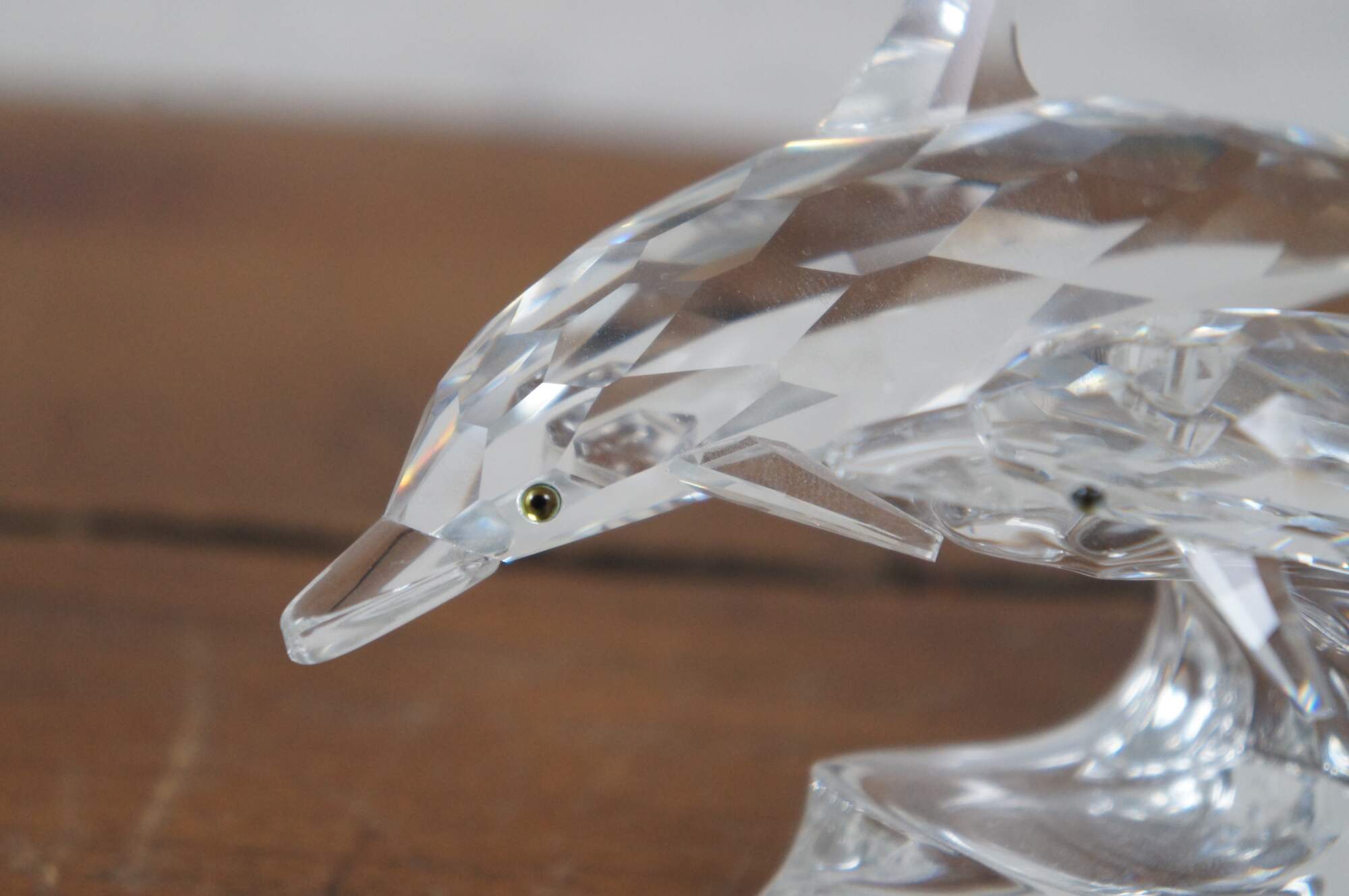 Swarovski Collectors Society Annual Edition 1990 - Lead Me - The Dolphins and 1991 - Save Me - Seals. Pair of clear crystal figurines with black eyes, depicting an adult / mother and baby dolphin on a wave and an adult / mother and baby seal / sea lion on an ice berg. Includes Certificate of Authenticity for the Dolphins.