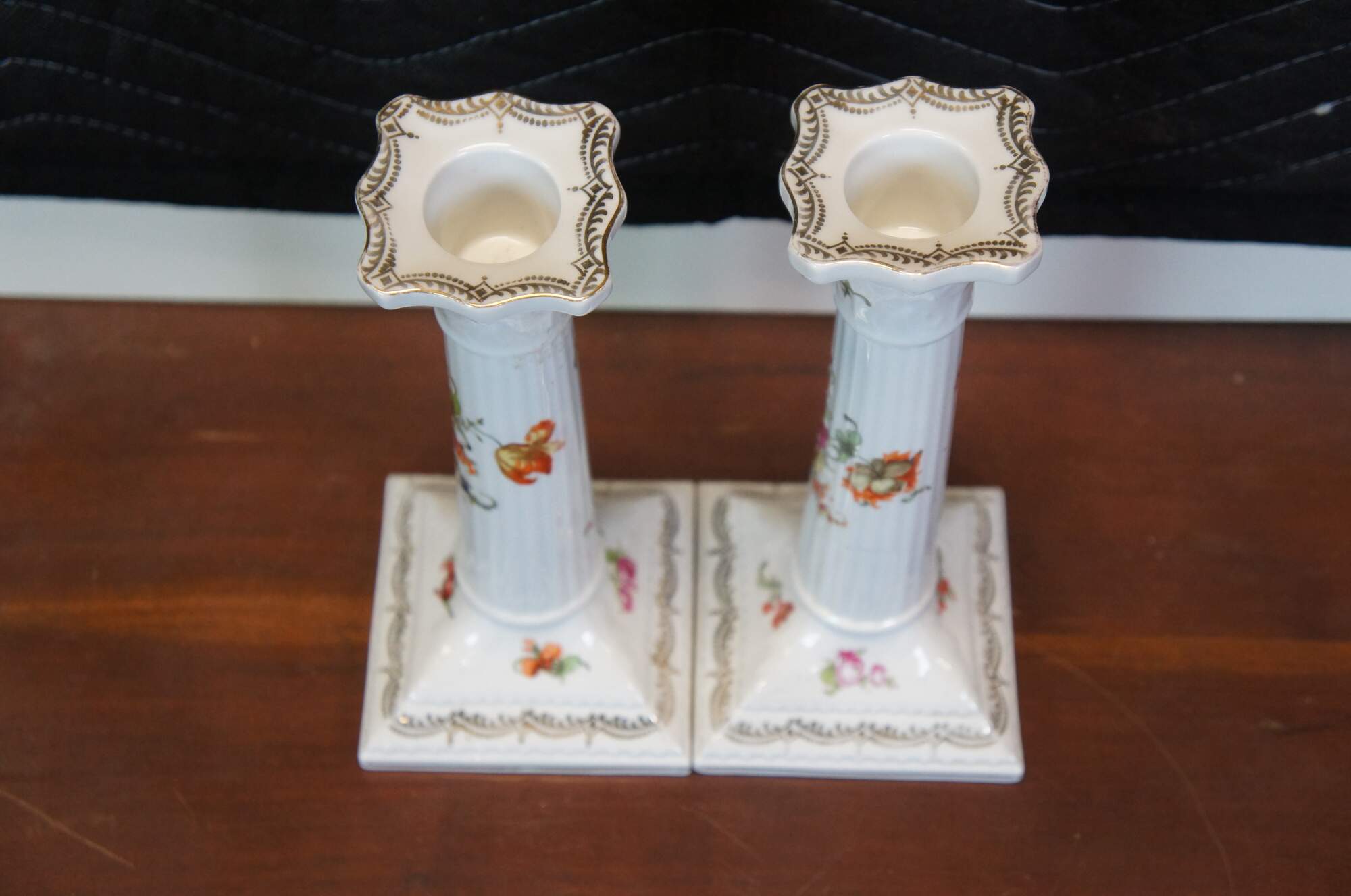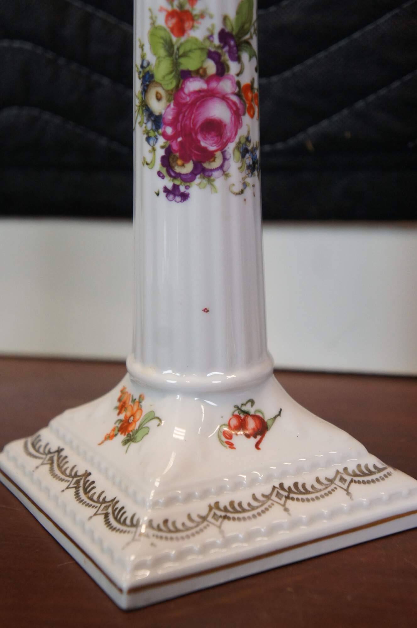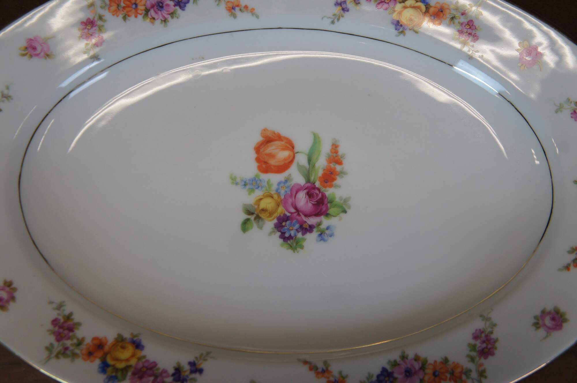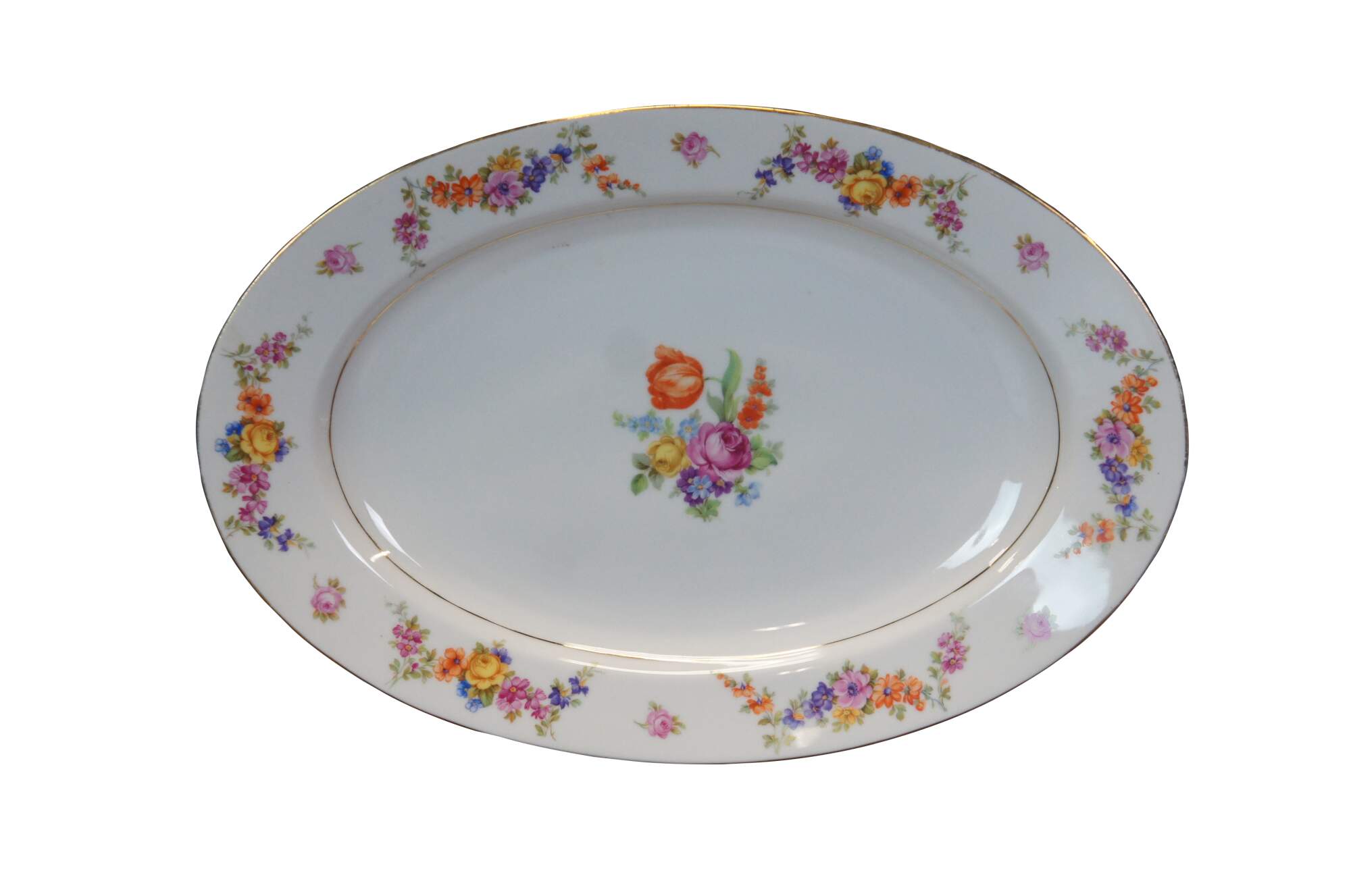 Mid to late 20th century Dresden style porcelain tableware including an oval serving platter by EPIAG Germany and a pair of square base, column shaped candlesticks by MZ Austria, both decorated with a multicolor floral motif and gilt details.